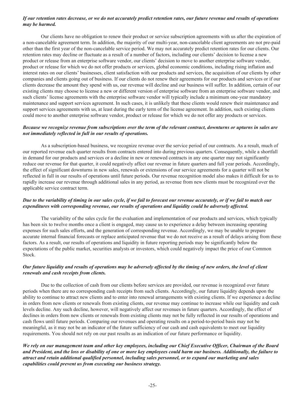 If our retention rates decrease, or we do not accurately predict retention rates, our future revenue and results of operations may be harmed. Our clients have no obligation to renew their product or service subscription agreements with us after the expiration of a non-cancelable agreement term. In addition, the majority of our multi-year, non-cancelable client agreements are not pre-paid other than the first year of the non-cancelable service period. We may not accurately predict retention rates for our clients. Our retention rates may decline or fluctuate as a result of a number of factors, including our clients’ decision to license a new product or release from an enterprise software vendor, our clients’ decision to move to another enterprise software vendor, product or release for which we do not offer products or services, global economic conditions, including rising inflation and interest rates on our clients’ businesses, client satisfaction with our products and services, the acquisition of our clients by other companies and clients going out of business. If our clients do not renew their agreements for our products and services or if our clients decrease the amount they spend with us, our revenue will decline and our business will suffer. In addition, certain of our existing clients may choose to license a new or different version of enterprise software from an enterprise software vendor, and such clients’ license agreements with the enterprise software vendor will typically include a minimum one-year mandatory maintenance and support services agreement. In such cases, it is unlikely that these clients would renew their maintenance and support services agreements with us, at least during the early term of the license agreement. In addition, such existing clients could move to another enterprise software vendor, product or release for which we do not offer any products or services. Because we recognize revenue from subscriptions over the term of the relevant contract, downturns or upturns in sales are not immediately reflected in full in our results of operations. As a subscription-based business, we recognize revenue over the service period of our contracts. As a result, much of our reported revenue each quarter results from contracts entered into during previous quarters. Consequently, while a shortfall in demand for our products and services or a decline in new or renewed contracts in any one quarter may not significantly reduce our revenue for that quarter, it could negatively affect our revenue in future quarters and full year periods. Accordingly, the effect of significant downturns in new sales, renewals or extensions of our service agreements for a quarter will not be reflected in full in our results of operations until future periods. Our revenue recognition model also makes it difficult for us to rapidly increase our revenue through additional sales in any period, as revenue from new clients must be recognized over the applicable service contract term. Due to the variability of timing in our sales cycle, if we fail to forecast our revenue accurately, or if we fail to match our expenditures with corresponding revenue, our results of operations and liquidity could be adversely affected. The variability of the sales cycle for the evaluation and implementation of our products and services, which typically has been six to twelve months once a client is engaged, may cause us to experience a delay between increasing operating expenses for such sales efforts, and the generation of corresponding revenue. Accordingly, we may be unable to prepare accurate internal financial forecasts or replace anticipated revenue that we do not receive as a result of delays arising from these factors. As a result, our results of operations and liquidity in future reporting periods may be significantly below the expectations of the public market, securities analysts or investors, which could negatively impact the price of our Common Stock. Our future liquidity and results of operations may be adversely affected by the timing of new orders, the level of client renewals and cash receipts from clients. Due to the collection of cash from our clients before services are provided, our revenue is recognized over future periods when there are no corresponding cash receipts from such clients. Accordingly, our future liquidity depends upon the ability to continue to attract new clients and to enter into renewal arrangements with existing clients. If we experience a decline in orders from new clients or renewals from existing clients, our revenue may continue to increase while our liquidity and cash levels decline. Any such decline, however, will negatively affect our revenues in future quarters. Accordingly, the effect of declines in orders from new clients or renewals from existing clients may not be fully reflected in our results of operations and cash flows until future periods. Comparing our revenues and operating results on a period-to-period basis may not be meaningful, as it may not be an indicator of the future sufficiency of our cash and cash equivalents to meet our liquidity requirements. You should not rely on our past results as an indication of our future performance or liquidity. We rely on our management team and other key employees, including our Chief Executive Officer, Chairman of the Board and President, and the loss or disability of one or more key employees could harm our business. Additionally, the failure to attract and retain additional qualified personnel, including sales personnel, or to expand our marketing and sales capabilities could prevent us from executing our business strategy. -25-