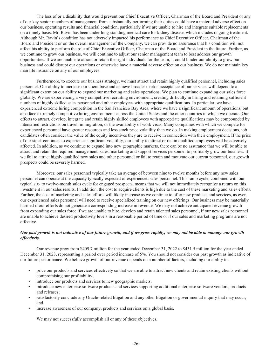 The loss of or a disability that would prevent our Chief Executive Officer, Chairman of the Board and President or any of our key senior members of management from substantially performing their duties could have a material adverse effect on our business, operating results and financial condition, particularly if we are unable to hire and integrate suitable replacements on a timely basis. Mr. Ravin has been under long-standing medical care for kidney disease, which includes ongoing treatment. Although Mr. Ravin’s condition has not adversely impacted his performance as Chief Executive Officer, Chairman of the Board and President or on the overall management of the Company, we can provide no assurance that his condition will not affect his ability to perform the role of Chief Executive Officer, Chairman of the Board and President in the future. Further, as we continue to grow our business, we will continue to adjust our senior management team to best address our growth opportunities. If we are unable to attract or retain the right individuals for the team, it could hinder our ability to grow our business and could disrupt our operations or otherwise have a material adverse effect on our business. We do not maintain key man life insurance on any of our employees. Furthermore, to execute our business strategy, we must attract and retain highly qualified personnel, including sales personnel. Our ability to increase our client base and achieve broader market acceptance of our services will depend to a significant extent on our ability to expand our marketing and sales operations. We plan to continue expanding our sales force globally. We are experiencing a very competitive recruiting environment, creating difficulty in hiring and retaining sufficient numbers of highly skilled sales personnel and other employees with appropriate qualifications. In particular, we have experienced extreme hiring competition in the San Francisco Bay Area, where we have a significant amount of operations, but also face extremely competitive hiring environments across the United States and the other countries in which we operate. Our efforts to attract, develop, integrate and retain highly skilled employees with appropriate qualifications may be compounded by intensified restrictions on travel, immigration, or the availability of work visas. Many companies with which we compete for experienced personnel have greater resources and less stock price volatility than we do. In making employment decisions, job candidates often consider the value of the equity incentives they are to receive in connection with their employment. If the price of our stock continues to experience significant volatility, our ability to attract or retain qualified employees will be adversely affected. In addition, as we continue to expand into new geographic markets, there can be no assurance that we will be able to attract and retain the required management, sales, marketing and support services personnel to profitably grow our business. If we fail to attract highly qualified new sales and other personnel or fail to retain and motivate our current personnel, our growth prospects could be severely harmed. Moreover, our sales personnel typically take an average of between nine to twelve months before any new sales personnel can operate at the capacity typically expected of experienced sales personnel. This ramp cycle, combined with our typical six- to twelve-month sales cycle for engaged prospects, means that we will not immediately recognize a return on this investment in our sales results. In addition, the cost to acquire clients is high due to the cost of these marketing and sales efforts. Further, the cost of marketing and sales efforts will likely increase as we continue to offer new products and services, as even our experienced sales personnel will need to receive specialized training on our new offerings. Our business may be materially harmed if our efforts do not generate a corresponding increase in revenue. We may not achieve anticipated revenue growth from expanding our sales force if we are unable to hire, develop and retain talented sales personnel, if our new sales personnel are unable to achieve desired productivity levels in a reasonable period of time or if our sales and marketing programs are not effective. Our past growth is not indicative of our future growth, and if we grow rapidly, we may not be able to manage our growth effectively. Our revenue grew from $409.7 million for the year ended December 31, 2022 to $431.5 million for the year ended December 31, 2023, representing a period over period increase of 5%. You should not consider our past growth as indicative of our future performance. We believe growth of our revenue depends on a number of factors, including our ability to: • price our products and services effectively so that we are able to attract new clients and retain existing clients without compromising our profitability; • introduce our products and services to new geographic markets; • introduce new enterprise software products and services supporting additional enterprise software vendors, products and releases; • satisfactorily conclude any Oracle-related litigation and any other litigation or governmental inquiry that may occur; and • increase awareness of our company, products and services on a global basis. We may not successfully accomplish all or any of these objectives. -26-