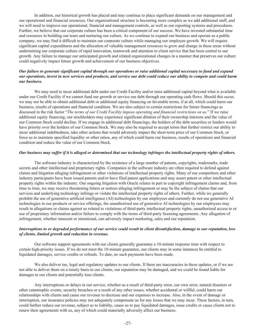 In addition, our historical growth has placed and may continue to place significant demands on our management and our operational and financial resources. Our organizational structure is becoming more complex as we add additional staff, and we will need to improve our operational, financial and management controls, as well as our reporting systems and procedures. Further, we believe that our corporate culture has been a critical component of our success. We have invested substantial time and resources in building our team and nurturing our culture. As we continue to expand our business and operate as a public company, we may find it difficult to maintain our corporate culture while managing our employee growth. We will require significant capital expenditures and the allocation of valuable management resources to grow and change in these areas without undermining our corporate culture of rapid innovation, teamwork and attention to client service that has been central to our growth. Any failure to manage our anticipated growth and related organizational changes in a manner that preserves our culture could negatively impact future growth and achievement of our business objectives. Our failure to generate significant capital through our operations or raise additional capital necessary to fund and expand our operations, invest in new services and products, and service our debt could reduce our ability to compete and could harm our business. We may need to incur additional debt under our Credit Facility and/or raise additional capital beyond what is available under our Credit Facility if we cannot fund our growth or service our debt through our operating cash flows. Should this occur, we may not be able to obtain additional debt or additional equity financing on favorable terms, if at all, which could harm our business, results of operations and financial condition. We are also subject to certain restrictions for future financings as discussed in the risk factor “The terms of our Credit Facility impose operating and financial restrictions on us.” If we raise additional equity financing, our stockholders may experience significant dilution of their ownership interests and the value of our Common Stock could decline. If we engage in additional debt financings, the holders of the debt securities or lenders would have priority over the holders of our Common Stock. We may also be required to accept terms that further restrict our ability to incur additional indebtedness, take other actions that would adversely impact the short-term price of our Common Stock, or force us to maintain specified liquidity or other ratios, any of which could harm our business, results of operations and financial condition and reduce the value of our Common Stock. Our business may suffer if it is alleged or determined that our technology infringes the intellectual property rights of others. The software industry is characterized by the existence of a large number of patents, copyrights, trademarks, trade secrets and other intellectual and proprietary rights. Companies in the software industry are often required to defend against claims and litigation alleging infringement or other violations of intellectual property rights. Many of our competitors and other industry participants have been issued patents and/or have filed patent applications and may assert patent or other intellectual property rights within the industry. Our ongoing litigation with Oracle relates in part to copyright infringement claims and, from time to time, we may receive threatening letters or notices alleging infringement or may be the subject of claims that our services and underlying technology infringe or violate the intellectual property rights of others. Further, while we generally prohibit the use of generative artificial intelligence (AI) technologies by our employees and currently do not use generative AI technologies in our products or service offerings, the unauthorized use of generative AI technologies by our employees may result in allegations or claims against us related to violations of third-party intellectual property rights, unauthorized access to or use of proprietary information and/or failure to comply with the terms of third-party licensing agreements. Any allegation of infringement, whether innocent or intentional, can adversely impact marketing, sales and our reputation. Interruptions to or degraded performance of our service could result in client dissatisfaction, damage to our reputation, loss of clients, limited growth and reduction in revenue. Our software support agreements with our clients generally guarantee a 10-minute response time with respect to certain high-priority issues. If we do not meet the 10-minute guarantee, our clients may in some instances be entitled to liquidated damages, service credits or refunds. To date, no such payments have been made. We also deliver tax, legal and regulatory updates to our clients. If there are inaccuracies in these updates, or if we are not able to deliver them on a timely basis to our clients, our reputation may be damaged, and we could be found liable for damages to our clients and potentially lose clients. Any interruptions or delays in our service, whether as a result of third-party error, our own error, natural disasters or other catastrophic events, security breaches or a result of any other issues, whether accidental or willful, could harm our relationships with clients and cause our revenue to decrease and our expenses to increase. Also, in the event of damage or interruption, our insurance policies may not adequately compensate us for any losses that we may incur. These factors, in turn, could further reduce our revenue, subject us to liability, cause us to pay liquidated damages, issue credits or cause clients not to renew their agreements with us, any of which could materially adversely affect our business. -27-