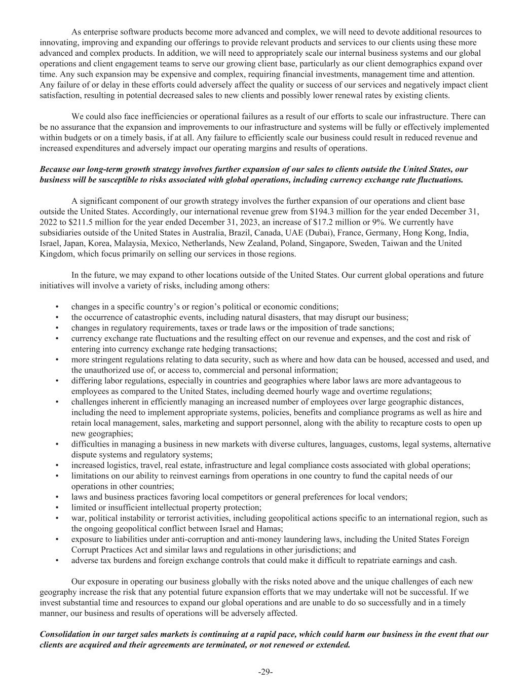 As enterprise software products become more advanced and complex, we will need to devote additional resources to innovating, improving and expanding our offerings to provide relevant products and services to our clients using these more advanced and complex products. In addition, we will need to appropriately scale our internal business systems and our global operations and client engagement teams to serve our growing client base, particularly as our client demographics expand over time. Any such expansion may be expensive and complex, requiring financial investments, management time and attention. Any failure of or delay in these efforts could adversely affect the quality or success of our services and negatively impact client satisfaction, resulting in potential decreased sales to new clients and possibly lower renewal rates by existing clients. We could also face inefficiencies or operational failures as a result of our efforts to scale our infrastructure. There can be no assurance that the expansion and improvements to our infrastructure and systems will be fully or effectively implemented within budgets or on a timely basis, if at all. Any failure to efficiently scale our business could result in reduced revenue and increased expenditures and adversely impact our operating margins and results of operations. Because our long-term growth strategy involves further expansion of our sales to clients outside the United States, our business will be susceptible to risks associated with global operations, including currency exchange rate fluctuations. A significant component of our growth strategy involves the further expansion of our operations and client base outside the United States. Accordingly, our international revenue grew from $194.3 million for the year ended December 31, 2022 to $211.5 million for the year ended December 31, 2023, an increase of $17.2 million or 9%. We currently have subsidiaries outside of the United States in Australia, Brazil, Canada, UAE (Dubai), France, Germany, Hong Kong, India, Israel, Japan, Korea, Malaysia, Mexico, Netherlands, New Zealand, Poland, Singapore, Sweden, Taiwan and the United Kingdom, which focus primarily on selling our services in those regions. In the future, we may expand to other locations outside of the United States. Our current global operations and future initiatives will involve a variety of risks, including among others: • changes in a specific country’s or region’s political or economic conditions; • the occurrence of catastrophic events, including natural disasters, that may disrupt our business; • changes in regulatory requirements, taxes or trade laws or the imposition of trade sanctions; • currency exchange rate fluctuations and the resulting effect on our revenue and expenses, and the cost and risk of entering into currency exchange rate hedging transactions; • more stringent regulations relating to data security, such as where and how data can be housed, accessed and used, and the unauthorized use of, or access to, commercial and personal information; • differing labor regulations, especially in countries and geographies where labor laws are more advantageous to employees as compared to the United States, including deemed hourly wage and overtime regulations; • challenges inherent in efficiently managing an increased number of employees over large geographic distances, including the need to implement appropriate systems, policies, benefits and compliance programs as well as hire and retain local management, sales, marketing and support personnel, along with the ability to recapture costs to open up new geographies; • difficulties in managing a business in new markets with diverse cultures, languages, customs, legal systems, alternative dispute systems and regulatory systems; • increased logistics, travel, real estate, infrastructure and legal compliance costs associated with global operations; • limitations on our ability to reinvest earnings from operations in one country to fund the capital needs of our operations in other countries; • laws and business practices favoring local competitors or general preferences for local vendors; • limited or insufficient intellectual property protection; • war, political instability or terrorist activities, including geopolitical actions specific to an international region, such as the ongoing geopolitical conflict between Israel and Hamas; • exposure to liabilities under anti-corruption and anti-money laundering laws, including the United States Foreign Corrupt Practices Act and similar laws and regulations in other jurisdictions; and • adverse tax burdens and foreign exchange controls that could make it difficult to repatriate earnings and cash. Our exposure in operating our business globally with the risks noted above and the unique challenges of each new geography increase the risk that any potential future expansion efforts that we may undertake will not be successful. If we invest substantial time and resources to expand our global operations and are unable to do so successfully and in a timely manner, our business and results of operations will be adversely affected. Consolidation in our target sales markets is continuing at a rapid pace, which could harm our business in the event that our clients are acquired and their agreements are terminated, or not renewed or extended. -29-