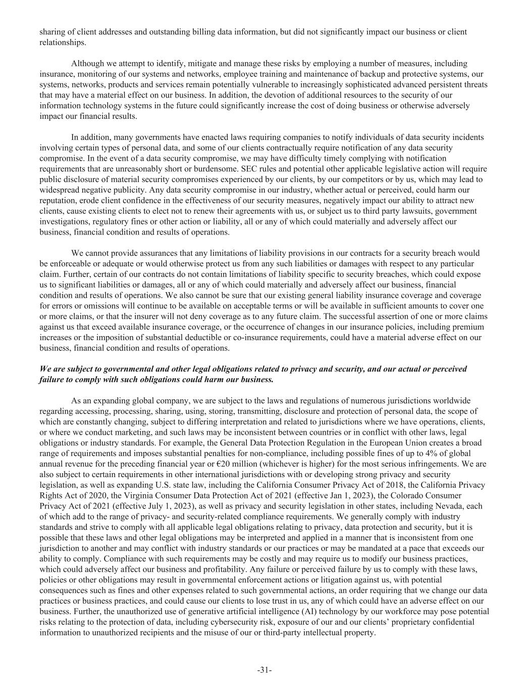 sharing of client addresses and outstanding billing data information, but did not significantly impact our business or client relationships. Although we attempt to identify, mitigate and manage these risks by employing a number of measures, including insurance, monitoring of our systems and networks, employee training and maintenance of backup and protective systems, our systems, networks, products and services remain potentially vulnerable to increasingly sophisticated advanced persistent threats that may have a material effect on our business. In addition, the devotion of additional resources to the security of our information technology systems in the future could significantly increase the cost of doing business or otherwise adversely impact our financial results. In addition, many governments have enacted laws requiring companies to notify individuals of data security incidents involving certain types of personal data, and some of our clients contractually require notification of any data security compromise. In the event of a data security compromise, we may have difficulty timely complying with notification requirements that are unreasonably short or burdensome. SEC rules and potential other applicable legislative action will require public disclosure of material security compromises experienced by our clients, by our competitors or by us, which may lead to widespread negative publicity. Any data security compromise in our industry, whether actual or perceived, could harm our reputation, erode client confidence in the effectiveness of our security measures, negatively impact our ability to attract new clients, cause existing clients to elect not to renew their agreements with us, or subject us to third party lawsuits, government investigations, regulatory fines or other action or liability, all or any of which could materially and adversely affect our business, financial condition and results of operations. We cannot provide assurances that any limitations of liability provisions in our contracts for a security breach would be enforceable or adequate or would otherwise protect us from any such liabilities or damages with respect to any particular claim. Further, certain of our contracts do not contain limitations of liability specific to security breaches, which could expose us to significant liabilities or damages, all or any of which could materially and adversely affect our business, financial condition and results of operations. We also cannot be sure that our existing general liability insurance coverage and coverage for errors or omissions will continue to be available on acceptable terms or will be available in sufficient amounts to cover one or more claims, or that the insurer will not deny coverage as to any future claim. The successful assertion of one or more claims against us that exceed available insurance coverage, or the occurrence of changes in our insurance policies, including premium increases or the imposition of substantial deductible or co-insurance requirements, could have a material adverse effect on our business, financial condition and results of operations. We are subject to governmental and other legal obligations related to privacy and security, and our actual or perceived failure to comply with such obligations could harm our business. As an expanding global company, we are subject to the laws and regulations of numerous jurisdictions worldwide regarding accessing, processing, sharing, using, storing, transmitting, disclosure and protection of personal data, the scope of which are constantly changing, subject to differing interpretation and related to jurisdictions where we have operations, clients, or where we conduct marketing, and such laws may be inconsistent between countries or in conflict with other laws, legal obligations or industry standards. For example, the General Data Protection Regulation in the European Union creates a broad range of requirements and imposes substantial penalties for non-compliance, including possible fines of up to 4% of global annual revenue for the preceding financial year or €20 million (whichever is higher) for the most serious infringements. We are also subject to certain requirements in other international jurisdictions with or developing strong privacy and security legislation, as well as expanding U.S. state law, including the California Consumer Privacy Act of 2018, the California Privacy Rights Act of 2020, the Virginia Consumer Data Protection Act of 2021 (effective Jan 1, 2023), the Colorado Consumer Privacy Act of 2021 (effective July 1, 2023), as well as privacy and security legislation in other states, including Nevada, each of which add to the range of privacy- and security-related compliance requirements. We generally comply with industry standards and strive to comply with all applicable legal obligations relating to privacy, data protection and security, but it is possible that these laws and other legal obligations may be interpreted and applied in a manner that is inconsistent from one jurisdiction to another and may conflict with industry standards or our practices or may be mandated at a pace that exceeds our ability to comply. Compliance with such requirements may be costly and may require us to modify our business practices, which could adversely affect our business and profitability. Any failure or perceived failure by us to comply with these laws, policies or other obligations may result in governmental enforcement actions or litigation against us, with potential consequences such as fines and other expenses related to such governmental actions, an order requiring that we change our data practices or business practices, and could cause our clients to lose trust in us, any of which could have an adverse effect on our business. Further, the unauthorized use of generative artificial intelligence (AI) technology by our workforce may pose potential risks relating to the protection of data, inclu