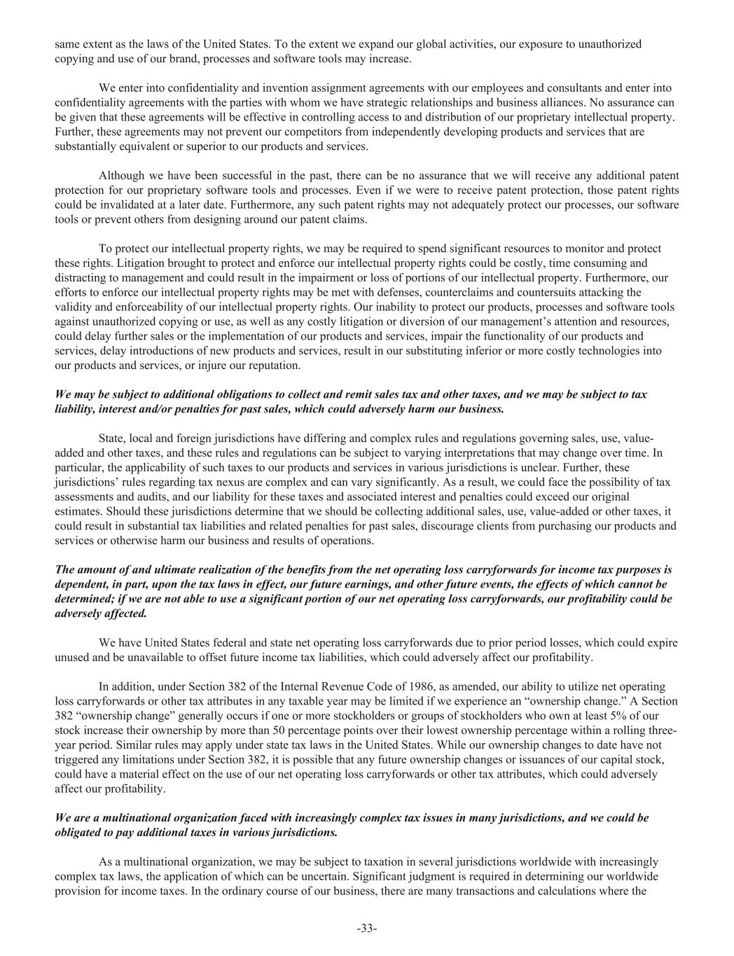 same extent as the laws of the United States. To the extent we expand our global activities, our exposure to unauthorized copying and use of our brand, processes and software tools may increase. We enter into confidentiality and invention assignment agreements with our employees and consultants and enter into confidentiality agreements with the parties with whom we have strategic relationships and business alliances. No assurance can be given that these agreements will be effective in controlling access to and distribution of our proprietary intellectual property. Further, these agreements may not prevent our competitors from independently developing products and services that are substantially equivalent or superior to our products and services. Although we have been successful in the past, there can be no assurance that we will receive any additional patent protection for our proprietary software tools and processes. Even if we were to receive patent protection, those patent rights could be invalidated at a later date. Furthermore, any such patent rights may not adequately protect our processes, our software tools or prevent others from designing around our patent claims. To protect our intellectual property rights, we may be required to spend significant resources to monitor and protect these rights. Litigation brought to protect and enforce our intellectual property rights could be costly, time consuming and distracting to management and could result in the impairment or loss of portions of our intellectual property. Furthermore, our efforts to enforce our intellectual property rights may be met with defenses, counterclaims and countersuits attacking the validity and enforceability of our intellectual property rights. Our inability to protect our products, processes and software tools against unauthorized copying or use, as well as any costly litigation or diversion of our management’s attention and resources, could delay further sales or the implementation of our products and services, impair the functionality of our products and services, delay introductions of new products and services, result in our substituting inferior or more costly technologies into our products and services, or injure our reputation. We may be subject to additional obligations to collect and remit sales tax and other taxes, and we may be subject to tax liability, interest and/or penalties for past sales, which could adversely harm our business. State, local and foreign jurisdictions have differing and complex rules and regulations governing sales, use, value- added and other taxes, and these rules and regulations can be subject to varying interpretations that may change over time. In particular, the applicability of such taxes to our products and services in various jurisdictions is unclear. Further, these jurisdictions’ rules regarding tax nexus are complex and can vary significantly. As a result, we could face the possibility of tax assessments and audits, and our liability for these taxes and associated interest and penalties could exceed our original estimates. Should these jurisdictions determine that we should be collecting additional sales, use, value-added or other taxes, it could result in substantial tax liabilities and related penalties for past sales, discourage clients from purchasing our products and services or otherwise harm our business and results of operations. The amount of and ultimate realization of the benefits from the net operating loss carryforwards for income tax purposes is dependent, in part, upon the tax laws in effect, our future earnings, and other future events, the effects of which cannot be determined; if we are not able to use a significant portion of our net operating loss carryforwards, our profitability could be adversely affected. We have United States federal and state net operating loss carryforwards due to prior period losses, which could expire unused and be unavailable to offset future income tax liabilities, which could adversely affect our profitability. In addition, under Section 382 of the Internal Revenue Code of 1986, as amended, our ability to utilize net operating loss carryforwards or other tax attributes in any taxable year may be limited if we experience an “ownership change.” A Section 382 “ownership change” generally occurs if one or more stockholders or groups of stockholders who own at least 5% of our stock increase their ownership by more than 50 percentage points over their lowest ownership percentage within a rolling three- year period. Similar rules may apply under state tax laws in the United States. While our ownership changes to date have not triggered any limitations under Section 382, it is possible that any future ownership changes or issuances of our capital stock, could have a material effect on the use of our net operating loss carryforwards or other tax attributes, which could adversely affect our profitability. We are a multinational organization faced with increasingly complex tax issues in many jurisdictions, and we could be obligated to pay additional taxes in various jurisdictions. As a multinational organization, we may be subject to taxation in several jurisdictions worldwide with increasingly complex tax laws, the application of which can be uncertain. Significant judgment is required in determining our worldwide provision for income taxes. In the ordinary course of our business, there are many transactions and calculations where the -33-