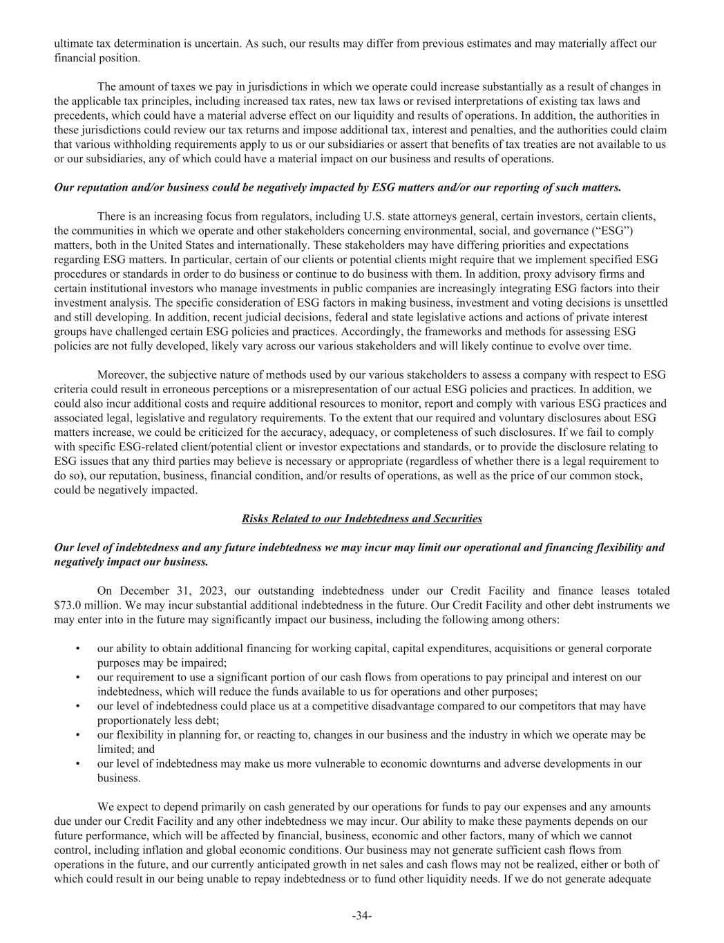ultimate tax determination is uncertain. As such, our results may differ from previous estimates and may materially affect our financial position. The amount of taxes we pay in jurisdictions in which we operate could increase substantially as a result of changes in the applicable tax principles, including increased tax rates, new tax laws or revised interpretations of existing tax laws and precedents, which could have a material adverse effect on our liquidity and results of operations. In addition, the authorities in these jurisdictions could review our tax returns and impose additional tax, interest and penalties, and the authorities could claim that various withholding requirements apply to us or our subsidiaries or assert that benefits of tax treaties are not available to us or our subsidiaries, any of which could have a material impact on our business and results of operations. Our reputation and/or business could be negatively impacted by ESG matters and/or our reporting of such matters. There is an increasing focus from regulators, including U.S. state attorneys general, certain investors, certain clients, the communities in which we operate and other stakeholders concerning environmental, social, and governance (“ESG”) matters, both in the United States and internationally. These stakeholders may have differing priorities and expectations regarding ESG matters. In particular, certain of our clients or potential clients might require that we implement specified ESG procedures or standards in order to do business or continue to do business with them. In addition, proxy advisory firms and certain institutional investors who manage investments in public companies are increasingly integrating ESG factors into their investment analysis. The specific consideration of ESG factors in making business, investment and voting decisions is unsettled and still developing. In addition, recent judicial decisions, federal and state legislative actions and actions of private interest groups have challenged certain ESG policies and practices. Accordingly, the frameworks and methods for assessing ESG policies are not fully developed, likely vary across our various stakeholders and will likely continue to evolve over time. Moreover, the subjective nature of methods used by our various stakeholders to assess a company with respect to ESG criteria could result in erroneous perceptions or a misrepresentation of our actual ESG policies and practices. In addition, we could also incur additional costs and require additional resources to monitor, report and comply with various ESG practices and associated legal, legislative and regulatory requirements. To the extent that our required and voluntary disclosures about ESG matters increase, we could be criticized for the accuracy, adequacy, or completeness of such disclosures. If we fail to comply with specific ESG-related client/potential client or investor expectations and standards, or to provide the disclosure relating to ESG issues that any third parties may believe is necessary or appropriate (regardless of whether there is a legal requirement to do so), our reputation, business, financial condition, and/or results of operations, as well as the price of our common stock, could be negatively impacted. Risks Related to our Indebtedness and Securities Our level of indebtedness and any future indebtedness we may incur may limit our operational and financing flexibility and negatively impact our business. On December 31, 2023, our outstanding indebtedness under our Credit Facility and finance leases totaled $73.0 million. We may incur substantial additional indebtedness in the future. Our Credit Facility and other debt instruments we may enter into in the future may significantly impact our business, including the following among others: • our ability to obtain additional financing for working capital, capital expenditures, acquisitions or general corporate purposes may be impaired; • our requirement to use a significant portion of our cash flows from operations to pay principal and interest on our indebtedness, which will reduce the funds available to us for operations and other purposes; • our level of indebtedness could place us at a competitive disadvantage compared to our competitors that may have proportionately less debt; • our flexibility in planning for, or reacting to, changes in our business and the industry in which we operate may be limited; and • our level of indebtedness may make us more vulnerable to economic downturns and adverse developments in our business. We expect to depend primarily on cash generated by our operations for funds to pay our expenses and any amounts due under our Credit Facility and any other indebtedness we may incur. Our ability to make these payments depends on our future performance, which will be affected by financial, business, economic and other factors, many of which we cannot control, including inflation and global economic conditions. Our business may not generate sufficient cash flows from operations in the future, and our currently anticipated growth in net sales and cash flows may not be realized, either or both of which could result in our being unable to repay indebtedness or to fund other liquidity needs. If we do not generate adequate -34-