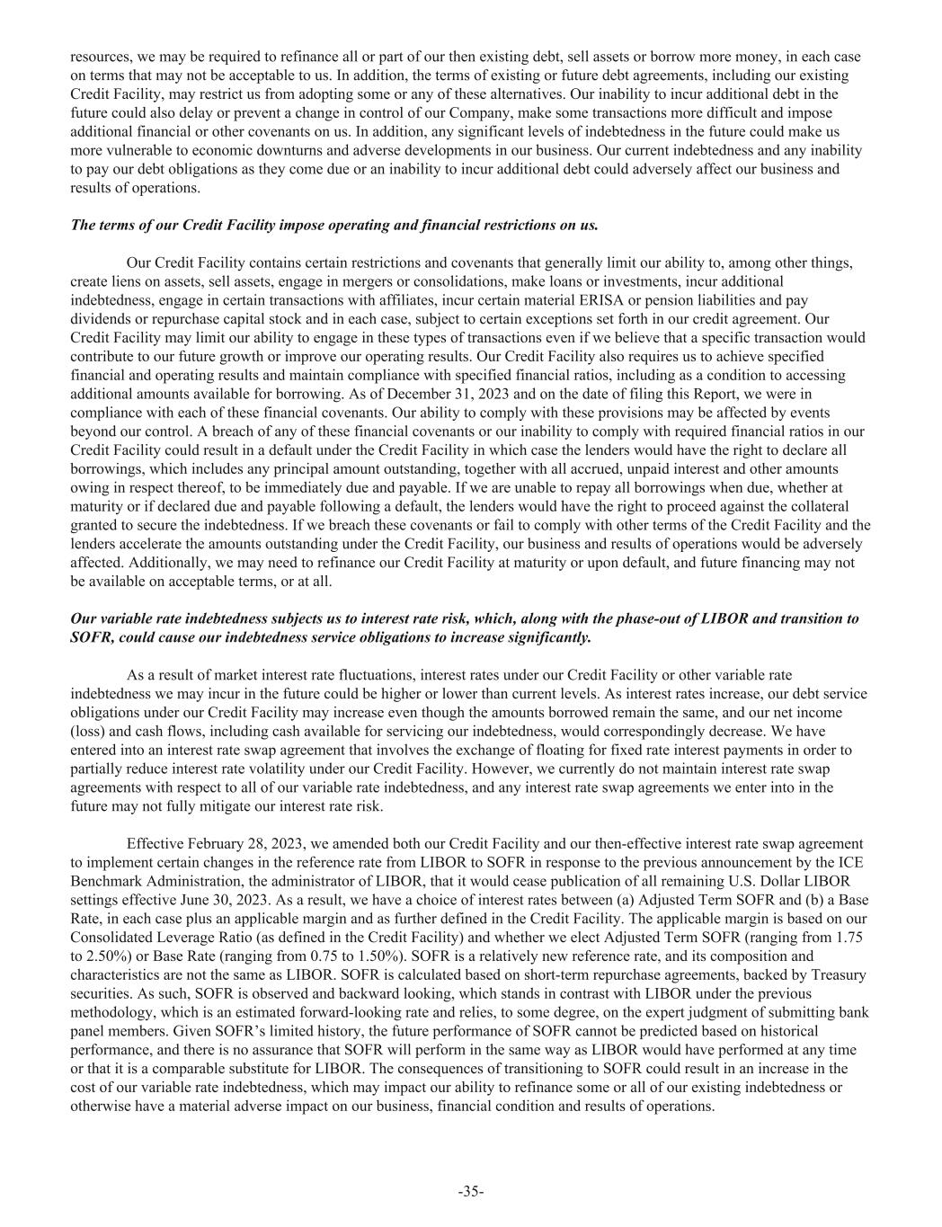 resources, we may be required to refinance all or part of our then existing debt, sell assets or borrow more money, in each case on terms that may not be acceptable to us. In addition, the terms of existing or future debt agreements, including our existing Credit Facility, may restrict us from adopting some or any of these alternatives. Our inability to incur additional debt in the future could also delay or prevent a change in control of our Company, make some transactions more difficult and impose additional financial or other covenants on us. In addition, any significant levels of indebtedness in the future could make us more vulnerable to economic downturns and adverse developments in our business. Our current indebtedness and any inability to pay our debt obligations as they come due or an inability to incur additional debt could adversely affect our business and results of operations. The terms of our Credit Facility impose operating and financial restrictions on us. Our Credit Facility contains certain restrictions and covenants that generally limit our ability to, among other things, create liens on assets, sell assets, engage in mergers or consolidations, make loans or investments, incur additional indebtedness, engage in certain transactions with affiliates, incur certain material ERISA or pension liabilities and pay dividends or repurchase capital stock and in each case, subject to certain exceptions set forth in our credit agreement. Our Credit Facility may limit our ability to engage in these types of transactions even if we believe that a specific transaction would contribute to our future growth or improve our operating results. Our Credit Facility also requires us to achieve specified financial and operating results and maintain compliance with specified financial ratios, including as a condition to accessing additional amounts available for borrowing. As of December 31, 2023 and on the date of filing this Report, we were in compliance with each of these financial covenants. Our ability to comply with these provisions may be affected by events beyond our control. A breach of any of these financial covenants or our inability to comply with required financial ratios in our Credit Facility could result in a default under the Credit Facility in which case the lenders would have the right to declare all borrowings, which includes any principal amount outstanding, together with all accrued, unpaid interest and other amounts owing in respect thereof, to be immediately due and payable. If we are unable to repay all borrowings when due, whether at maturity or if declared due and payable following a default, the lenders would have the right to proceed against the collateral granted to secure the indebtedness. If we breach these covenants or fail to comply with other terms of the Credit Facility and the lenders accelerate the amounts outstanding under the Credit Facility, our business and results of operations would be adversely affected. Additionally, we may need to refinance our Credit Facility at maturity or upon default, and future financing may not be available on acceptable terms, or at all. Our variable rate indebtedness subjects us to interest rate risk, which, along with the phase-out of LIBOR and transition to SOFR, could cause our indebtedness service obligations to increase significantly. As a result of market interest rate fluctuations, interest rates under our Credit Facility or other variable rate indebtedness we may incur in the future could be higher or lower than current levels. As interest rates increase, our debt service obligations under our Credit Facility may increase even though the amounts borrowed remain the same, and our net income (loss) and cash flows, including cash available for servicing our indebtedness, would correspondingly decrease. We have entered into an interest rate swap agreement that involves the exchange of floating for fixed rate interest payments in order to partially reduce interest rate volatility under our Credit Facility. However, we currently do not maintain interest rate swap agreements with respect to all of our variable rate indebtedness, and any interest rate swap agreements we enter into in the future may not fully mitigate our interest rate risk. Effective February 28, 2023, we amended both our Credit Facility and our then-effective interest rate swap agreement to implement certain changes in the reference rate from LIBOR to SOFR in response to the previous announcement by the ICE Benchmark Administration, the administrator of LIBOR, that it would cease publication of all remaining U.S. Dollar LIBOR settings effective June 30, 2023. As a result, we have a choice of interest rates between (a) Adjusted Term SOFR and (b) a Base Rate, in each case plus an applicable margin and as further defined in the Credit Facility. The applicable margin is based on our Consolidated Leverage Ratio (as defined in the Credit Facility) and whether we elect Adjusted Term SOFR (ranging from 1.75 to 2.50%) or Base Rate (ranging from 0.75 to 1.50%). SOFR is a relatively new reference rate, and its composition and characteristics are not the same as LIBOR. SOFR is calculated based on short-term repurchase agreements, backed by Treasury securities. As such, SOFR is observed and backward looking, which stands in contrast with LIBOR under the previous methodology, which is an estimated forward-looking rate and relies, to some degree, on the expert judgment of submitting bank panel members. Given SOFR’s limited history, the future performance of SOFR cannot be predicted based on historical performance, and there is no assurance that SOFR will perform in the same way as LIBOR would have performed at any time or that it is a comparable substitute for LIBOR. The consequences of transitioning to SOFR could result in an increase in the cost of our variable rate indebtedness, which may impact our ability to refinance some or all of our existing indebtedness or 