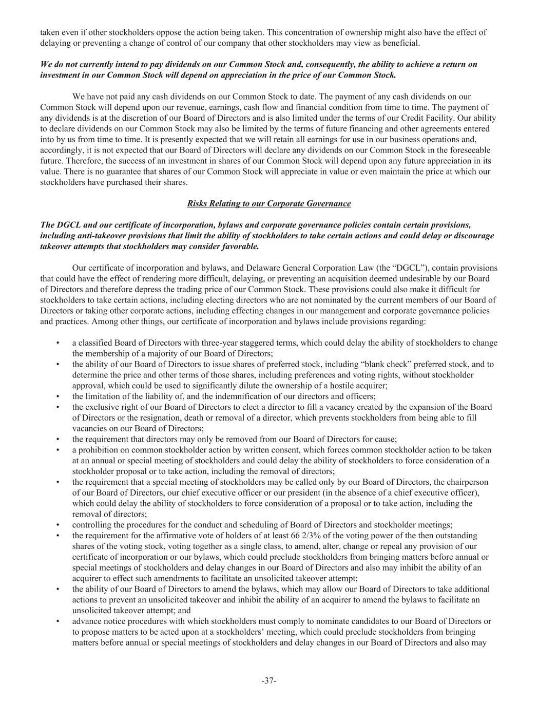 taken even if other stockholders oppose the action being taken. This concentration of ownership might also have the effect of delaying or preventing a change of control of our company that other stockholders may view as beneficial. We do not currently intend to pay dividends on our Common Stock and, consequently, the ability to achieve a return on investment in our Common Stock will depend on appreciation in the price of our Common Stock. We have not paid any cash dividends on our Common Stock to date. The payment of any cash dividends on our Common Stock will depend upon our revenue, earnings, cash flow and financial condition from time to time. The payment of any dividends is at the discretion of our Board of Directors and is also limited under the terms of our Credit Facility. Our ability to declare dividends on our Common Stock may also be limited by the terms of future financing and other agreements entered into by us from time to time. It is presently expected that we will retain all earnings for use in our business operations and, accordingly, it is not expected that our Board of Directors will declare any dividends on our Common Stock in the foreseeable future. Therefore, the success of an investment in shares of our Common Stock will depend upon any future appreciation in its value. There is no guarantee that shares of our Common Stock will appreciate in value or even maintain the price at which our stockholders have purchased their shares. Risks Relating to our Corporate Governance The DGCL and our certificate of incorporation, bylaws and corporate governance policies contain certain provisions, including anti-takeover provisions that limit the ability of stockholders to take certain actions and could delay or discourage takeover attempts that stockholders may consider favorable. Our certificate of incorporation and bylaws, and Delaware General Corporation Law (the “DGCL”), contain provisions that could have the effect of rendering more difficult, delaying, or preventing an acquisition deemed undesirable by our Board of Directors and therefore depress the trading price of our Common Stock. These provisions could also make it difficult for stockholders to take certain actions, including electing directors who are not nominated by the current members of our Board of Directors or taking other corporate actions, including effecting changes in our management and corporate governance policies and practices. Among other things, our certificate of incorporation and bylaws include provisions regarding: • a classified Board of Directors with three-year staggered terms, which could delay the ability of stockholders to change the membership of a majority of our Board of Directors; • the ability of our Board of Directors to issue shares of preferred stock, including “blank check” preferred stock, and to determine the price and other terms of those shares, including preferences and voting rights, without stockholder approval, which could be used to significantly dilute the ownership of a hostile acquirer; • the limitation of the liability of, and the indemnification of our directors and officers; • the exclusive right of our Board of Directors to elect a director to fill a vacancy created by the expansion of the Board of Directors or the resignation, death or removal of a director, which prevents stockholders from being able to fill vacancies on our Board of Directors; • the requirement that directors may only be removed from our Board of Directors for cause; • a prohibition on common stockholder action by written consent, which forces common stockholder action to be taken at an annual or special meeting of stockholders and could delay the ability of stockholders to force consideration of a stockholder proposal or to take action, including the removal of directors; • the requirement that a special meeting of stockholders may be called only by our Board of Directors, the chairperson of our Board of Directors, our chief executive officer or our president (in the absence of a chief executive officer), which could delay the ability of stockholders to force consideration of a proposal or to take action, including the removal of directors; • controlling the procedures for the conduct and scheduling of Board of Directors and stockholder meetings; • the requirement for the affirmative vote of holders of at least 66 2/3% of the voting power of the then outstanding shares of the voting stock, voting together as a single class, to amend, alter, change or repeal any provision of our certificate of incorporation or our bylaws, which could preclude stockholders from bringing matters before annual or special meetings of stockholders and delay changes in our Board of Directors and also may inhibit the ability of an acquirer to effect such amendments to facilitate an unsolicited takeover attempt; • the ability of our Board of Directors to amend the bylaws, which may allow our Board of Directors to take additional actions to prevent an unsolicited takeover and inhibit the ability of an acquirer to amend the bylaws to facilitate an unsolicited takeover attempt; and • advance notice procedures with which stockholders must comply to nominate candidates to our Board of Directors or to propose matters to be acted upon at a stockholders’ meeting, which could preclude stockholders from bringing matters before annual or special meetings of stockholders and delay changes in our Board of Directors and also may -37-