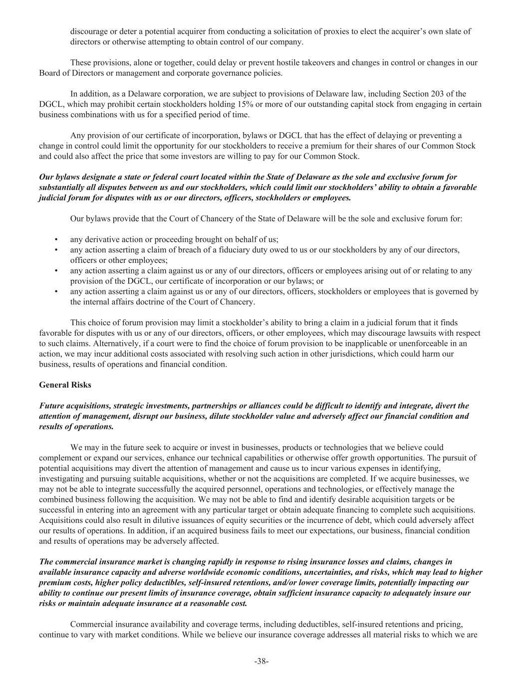 discourage or deter a potential acquirer from conducting a solicitation of proxies to elect the acquirer’s own slate of directors or otherwise attempting to obtain control of our company. These provisions, alone or together, could delay or prevent hostile takeovers and changes in control or changes in our Board of Directors or management and corporate governance policies. In addition, as a Delaware corporation, we are subject to provisions of Delaware law, including Section 203 of the DGCL, which may prohibit certain stockholders holding 15% or more of our outstanding capital stock from engaging in certain business combinations with us for a specified period of time. Any provision of our certificate of incorporation, bylaws or DGCL that has the effect of delaying or preventing a change in control could limit the opportunity for our stockholders to receive a premium for their shares of our Common Stock and could also affect the price that some investors are willing to pay for our Common Stock. Our bylaws designate a state or federal court located within the State of Delaware as the sole and exclusive forum for substantially all disputes between us and our stockholders, which could limit our stockholders’ ability to obtain a favorable judicial forum for disputes with us or our directors, officers, stockholders or employees. Our bylaws provide that the Court of Chancery of the State of Delaware will be the sole and exclusive forum for: • any derivative action or proceeding brought on behalf of us; • any action asserting a claim of breach of a fiduciary duty owed to us or our stockholders by any of our directors, officers or other employees; • any action asserting a claim against us or any of our directors, officers or employees arising out of or relating to any provision of the DGCL, our certificate of incorporation or our bylaws; or • any action asserting a claim against us or any of our directors, officers, stockholders or employees that is governed by the internal affairs doctrine of the Court of Chancery. This choice of forum provision may limit a stockholder’s ability to bring a claim in a judicial forum that it finds favorable for disputes with us or any of our directors, officers, or other employees, which may discourage lawsuits with respect to such claims. Alternatively, if a court were to find the choice of forum provision to be inapplicable or unenforceable in an action, we may incur additional costs associated with resolving such action in other jurisdictions, which could harm our business, results of operations and financial condition. General Risks Future acquisitions, strategic investments, partnerships or alliances could be difficult to identify and integrate, divert the attention of management, disrupt our business, dilute stockholder value and adversely affect our financial condition and results of operations. We may in the future seek to acquire or invest in businesses, products or technologies that we believe could complement or expand our services, enhance our technical capabilities or otherwise offer growth opportunities. The pursuit of potential acquisitions may divert the attention of management and cause us to incur various expenses in identifying, investigating and pursuing suitable acquisitions, whether or not the acquisitions are completed. If we acquire businesses, we may not be able to integrate successfully the acquired personnel, operations and technologies, or effectively manage the combined business following the acquisition. We may not be able to find and identify desirable acquisition targets or be successful in entering into an agreement with any particular target or obtain adequate financing to complete such acquisitions. Acquisitions could also result in dilutive issuances of equity securities or the incurrence of debt, which could adversely affect our results of operations. In addition, if an acquired business fails to meet our expectations, our business, financial condition and results of operations may be adversely affected. The commercial insurance market is changing rapidly in response to rising insurance losses and claims, changes in available insurance capacity and adverse worldwide economic conditions, uncertainties, and risks, which may lead to higher premium costs, higher policy deductibles, self-insured retentions, and/or lower coverage limits, potentially impacting our ability to continue our present limits of insurance coverage, obtain sufficient insurance capacity to adequately insure our risks or maintain adequate insurance at a reasonable cost. Commercial insurance availability and coverage terms, including deductibles, self-insured retentions and pricing, continue to vary with market conditions. While we believe our insurance coverage addresses all material risks to which we are -38-