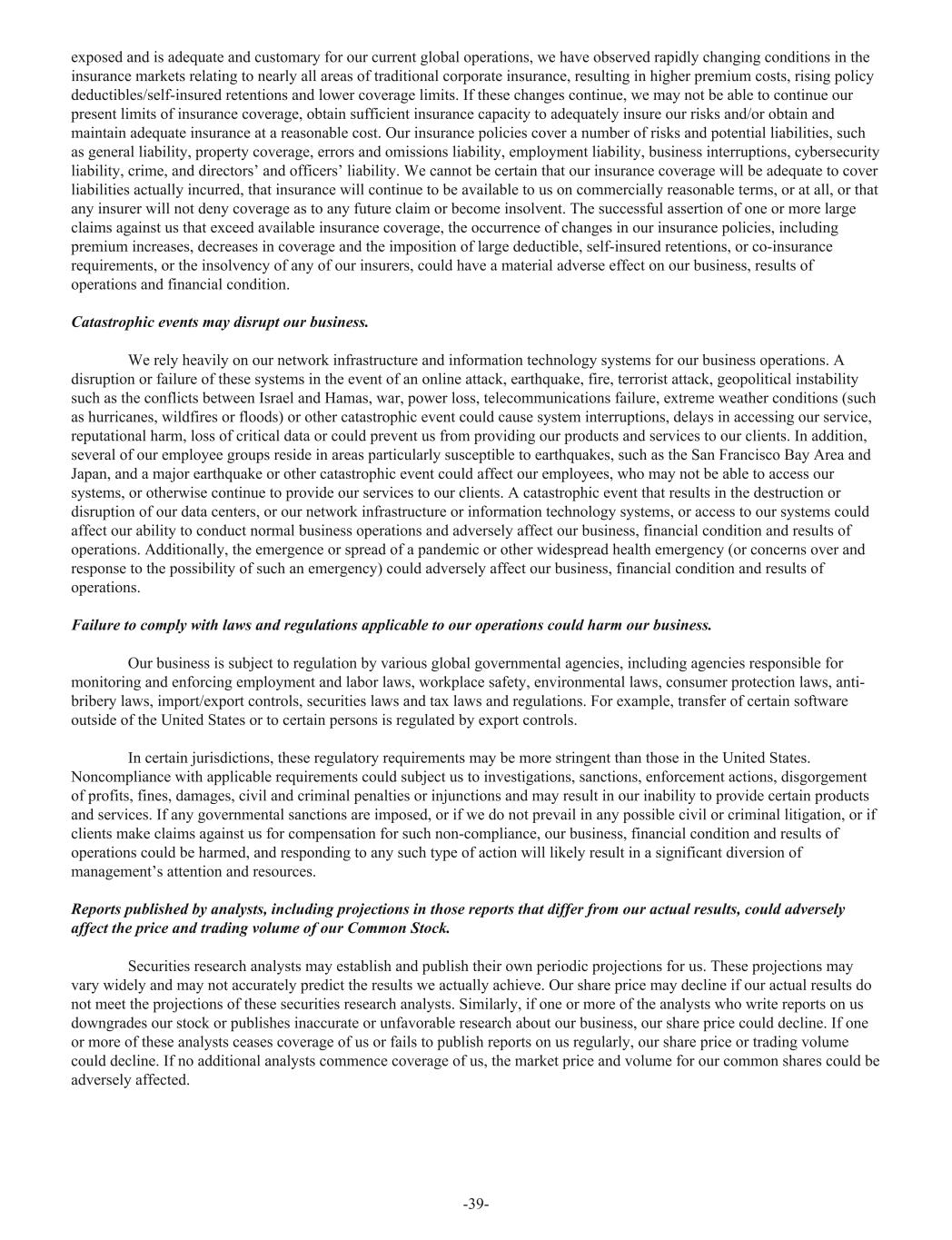 exposed and is adequate and customary for our current global operations, we have observed rapidly changing conditions in the insurance markets relating to nearly all areas of traditional corporate insurance, resulting in higher premium costs, rising policy deductibles/self-insured retentions and lower coverage limits. If these changes continue, we may not be able to continue our present limits of insurance coverage, obtain sufficient insurance capacity to adequately insure our risks and/or obtain and maintain adequate insurance at a reasonable cost. Our insurance policies cover a number of risks and potential liabilities, such as general liability, property coverage, errors and omissions liability, employment liability, business interruptions, cybersecurity liability, crime, and directors’ and officers’ liability. We cannot be certain that our insurance coverage will be adequate to cover liabilities actually incurred, that insurance will continue to be available to us on commercially reasonable terms, or at all, or that any insurer will not deny coverage as to any future claim or become insolvent. The successful assertion of one or more large claims against us that exceed available insurance coverage, the occurrence of changes in our insurance policies, including premium increases, decreases in coverage and the imposition of large deductible, self-insured retentions, or co-insurance requirements, or the insolvency of any of our insurers, could have a material adverse effect on our business, results of operations and financial condition. Catastrophic events may disrupt our business. We rely heavily on our network infrastructure and information technology systems for our business operations. A disruption or failure of these systems in the event of an online attack, earthquake, fire, terrorist attack, geopolitical instability such as the conflicts between Israel and Hamas, war, power loss, telecommunications failure, extreme weather conditions (such as hurricanes, wildfires or floods) or other catastrophic event could cause system interruptions, delays in accessing our service, reputational harm, loss of critical data or could prevent us from providing our products and services to our clients. In addition, several of our employee groups reside in areas particularly susceptible to earthquakes, such as the San Francisco Bay Area and Japan, and a major earthquake or other catastrophic event could affect our employees, who may not be able to access our systems, or otherwise continue to provide our services to our clients. A catastrophic event that results in the destruction or disruption of our data centers, or our network infrastructure or information technology systems, or access to our systems could affect our ability to conduct normal business operations and adversely affect our business, financial condition and results of operations. Additionally, the emergence or spread of a pandemic or other widespread health emergency (or concerns over and response to the possibility of such an emergency) could adversely affect our business, financial condition and results of operations. Failure to comply with laws and regulations applicable to our operations could harm our business. Our business is subject to regulation by various global governmental agencies, including agencies responsible for monitoring and enforcing employment and labor laws, workplace safety, environmental laws, consumer protection laws, anti- bribery laws, import/export controls, securities laws and tax laws and regulations. For example, transfer of certain software outside of the United States or to certain persons is regulated by export controls. In certain jurisdictions, these regulatory requirements may be more stringent than those in the United States. Noncompliance with applicable requirements could subject us to investigations, sanctions, enforcement actions, disgorgement of profits, fines, damages, civil and criminal penalties or injunctions and may result in our inability to provide certain products and services. If any governmental sanctions are imposed, or if we do not prevail in any possible civil or criminal litigation, or if clients make claims against us for compensation for such non-compliance, our business, financial condition and results of operations could be harmed, and responding to any such type of action will likely result in a significant diversion of management’s attention and resources. Reports published by analysts, including projections in those reports that differ from our actual results, could adversely affect the price and trading volume of our Common Stock. Securities research analysts may establish and publish their own periodic projections for us. These projections may vary widely and may not accurately predict the results we actually achieve. Our share price may decline if our actual results do not meet the projections of these securities research analysts. Similarly, if one or more of the analysts who write reports on us downgrades our stock or publishes inaccurate or unfavorable research about our business, our share price could decline. If one or more of these analysts ceases coverage of us or fails to publish reports on us regularly, our share price or trading volume could decline. If no additional analysts commence coverage of us, the market price and volume for our common shares could be adversely affected. -39-