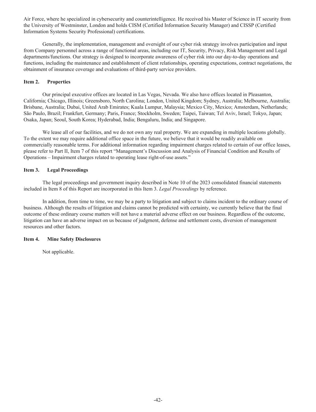 Air Force, where he specialized in cybersecurity and counterintelligence. He received his Master of Science in IT security from the University of Westminster, London and holds CISM (Certified Information Security Manager) and CISSP (Certified Information Systems Security Professional) certifications. Generally, the implementation, management and oversight of our cyber risk strategy involves participation and input from Company personnel across a range of functional areas, including our IT, Security, Privacy, Risk Management and Legal departments/functions. Our strategy is designed to incorporate awareness of cyber risk into our day-to-day operations and functions, including the maintenance and establishment of client relationships, operating expectations, contract negotiations, the obtainment of insurance coverage and evaluations of third-party service providers. Item 2. Properties Our principal executive offices are located in Las Vegas, Nevada. We also have offices located in Pleasanton, California; Chicago, Illinois; Greensboro, North Carolina; London, United Kingdom; Sydney, Australia; Melbourne, Australia; Brisbane, Australia; Dubai, United Arab Emirates; Kuala Lumpur, Malaysia; Mexico City, Mexico; Amsterdam, Netherlands; São Paulo, Brazil; Frankfurt, Germany; Paris, France; Stockholm, Sweden; Taipei, Taiwan; Tel Aviv, Israel; Tokyo, Japan; Osaka, Japan; Seoul, South Korea; Hyderabad, India; Bengaluru, India; and Singapore. We lease all of our facilities, and we do not own any real property. We are expanding in multiple locations globally. To the extent we may require additional office space in the future, we believe that it would be readily available on commercially reasonable terms. For additional information regarding impairment charges related to certain of our office leases, please refer to Part II, Item 7 of this report “Management’s Discussion and Analysis of Financial Condition and Results of Operations – Impairment charges related to operating lease right-of-use assets.” Item 3. Legal Proceedings The legal proceedings and government inquiry described in Note 10 of the 2023 consolidated financial statements included in Item 8 of this Report are incorporated in this Item 3. Legal Proceedings by reference. In addition, from time to time, we may be a party to litigation and subject to claims incident to the ordinary course of business. Although the results of litigation and claims cannot be predicted with certainty, we currently believe that the final outcome of these ordinary course matters will not have a material adverse effect on our business. Regardless of the outcome, litigation can have an adverse impact on us because of judgment, defense and settlement costs, diversion of management resources and other factors. Item 4. Mine Safety Disclosures Not applicable. -42-