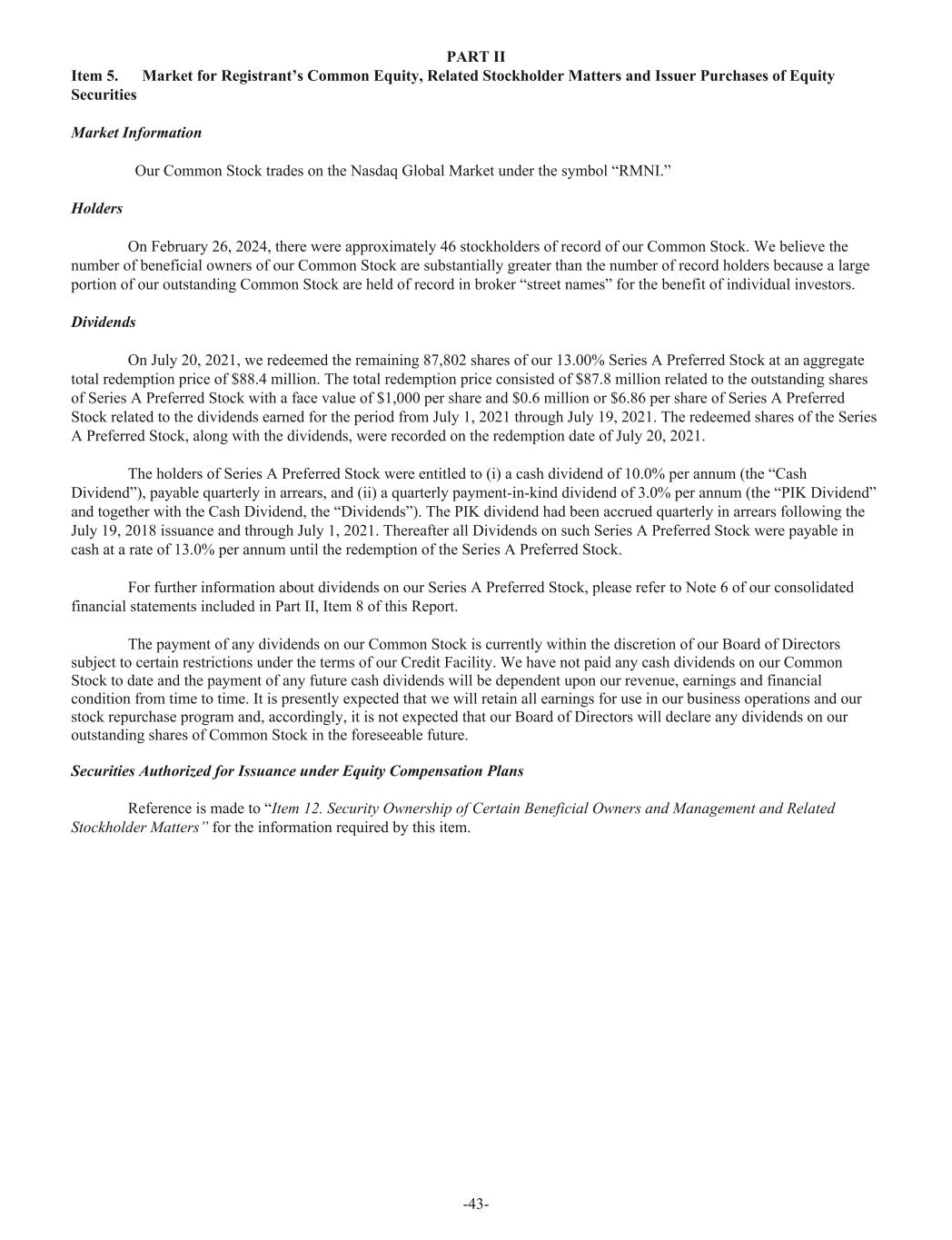 PART II Item 5. Market for Registrant’s Common Equity, Related Stockholder Matters and Issuer Purchases of Equity Securities Market Information Our Common Stock trades on the Nasdaq Global Market under the symbol “RMNI.” Holders On February 26, 2024, there were approximately 46 stockholders of record of our Common Stock. We believe the number of beneficial owners of our Common Stock are substantially greater than the number of record holders because a large portion of our outstanding Common Stock are held of record in broker “street names” for the benefit of individual investors. Dividends On July 20, 2021, we redeemed the remaining 87,802 shares of our 13.00% Series A Preferred Stock at an aggregate total redemption price of $88.4 million. The total redemption price consisted of $87.8 million related to the outstanding shares of Series A Preferred Stock with a face value of $1,000 per share and $0.6 million or $6.86 per share of Series A Preferred Stock related to the dividends earned for the period from July 1, 2021 through July 19, 2021. The redeemed shares of the Series A Preferred Stock, along with the dividends, were recorded on the redemption date of July 20, 2021. The holders of Series A Preferred Stock were entitled to (i) a cash dividend of 10.0% per annum (the “Cash Dividend”), payable quarterly in arrears, and (ii) a quarterly payment-in-kind dividend of 3.0% per annum (the “PIK Dividend” and together with the Cash Dividend, the “Dividends”). The PIK dividend had been accrued quarterly in arrears following the July 19, 2018 issuance and through July 1, 2021. Thereafter all Dividends on such Series A Preferred Stock were payable in cash at a rate of 13.0% per annum until the redemption of the Series A Preferred Stock. For further information about dividends on our Series A Preferred Stock, please refer to Note 6 of our consolidated financial statements included in Part II, Item 8 of this Report. The payment of any dividends on our Common Stock is currently within the discretion of our Board of Directors subject to certain restrictions under the terms of our Credit Facility. We have not paid any cash dividends on our Common Stock to date and the payment of any future cash dividends will be dependent upon our revenue, earnings and financial condition from time to time. It is presently expected that we will retain all earnings for use in our business operations and our stock repurchase program and, accordingly, it is not expected that our Board of Directors will declare any dividends on our outstanding shares of Common Stock in the foreseeable future. Securities Authorized for Issuance under Equity Compensation Plans Reference is made to “Item 12. Security Ownership of Certain Beneficial Owners and Management and Related Stockholder Matters” for the information required by this item. -43-