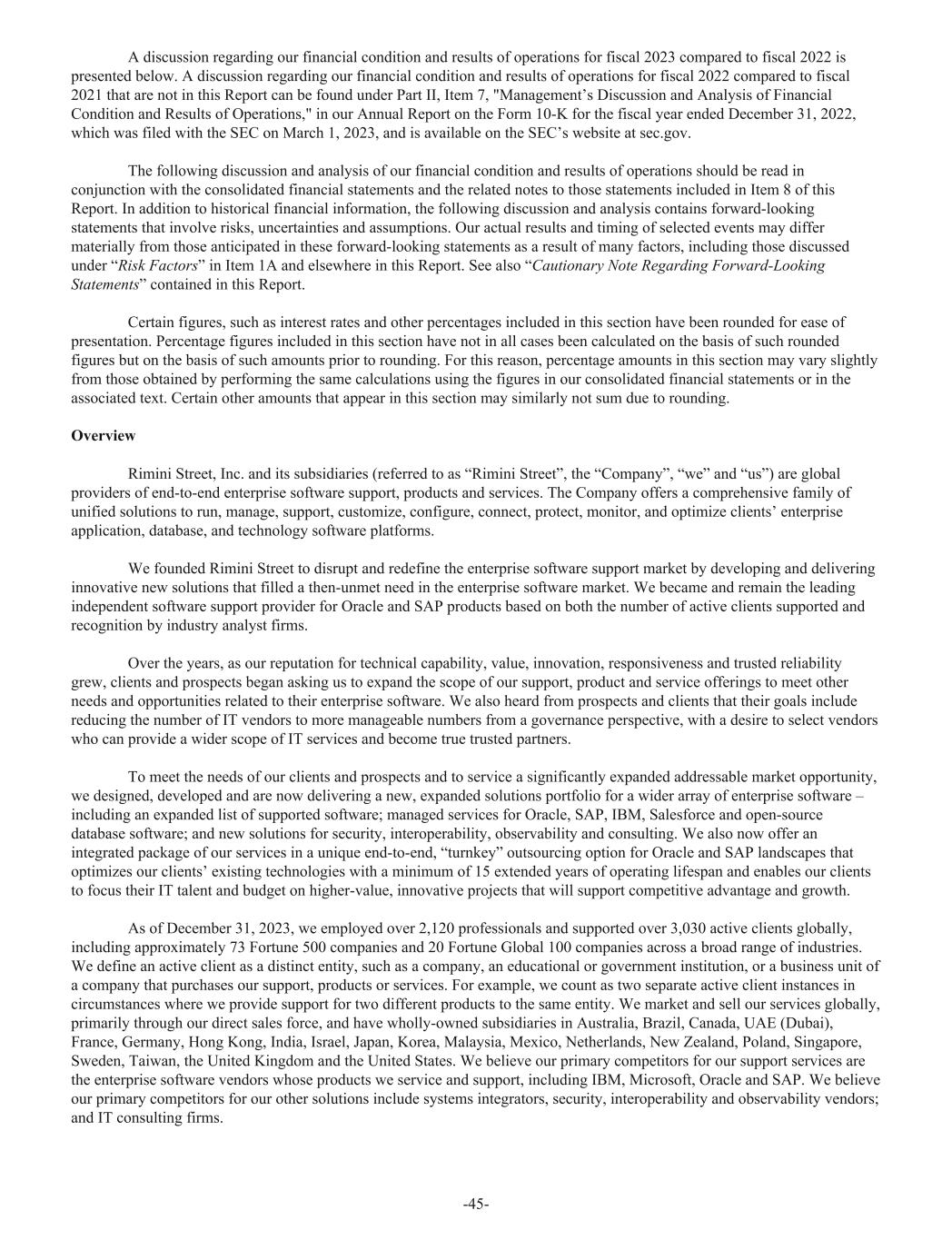 A discussion regarding our financial condition and results of operations for fiscal 2023 compared to fiscal 2022 is presented below. A discussion regarding our financial condition and results of operations for fiscal 2022 compared to fiscal 2021 that are not in this Report can be found under Part II, Item 7, "Management’s Discussion and Analysis of Financial Condition and Results of Operations," in our Annual Report on the Form 10-K for the fiscal year ended December 31, 2022, which was filed with the SEC on March 1, 2023, and is available on the SEC’s website at sec.gov. The following discussion and analysis of our financial condition and results of operations should be read in conjunction with the consolidated financial statements and the related notes to those statements included in Item 8 of this Report. In addition to historical financial information, the following discussion and analysis contains forward-looking statements that involve risks, uncertainties and assumptions. Our actual results and timing of selected events may differ materially from those anticipated in these forward-looking statements as a result of many factors, including those discussed under “Risk Factors” in Item 1A and elsewhere in this Report. See also “Cautionary Note Regarding Forward-Looking Statements” contained in this Report. Certain figures, such as interest rates and other percentages included in this section have been rounded for ease of presentation. Percentage figures included in this section have not in all cases been calculated on the basis of such rounded figures but on the basis of such amounts prior to rounding. For this reason, percentage amounts in this section may vary slightly from those obtained by performing the same calculations using the figures in our consolidated financial statements or in the associated text. Certain other amounts that appear in this section may similarly not sum due to rounding. Overview Rimini Street, Inc. and its subsidiaries (referred to as “Rimini Street”, the “Company”, “we” and “us”) are global providers of end-to-end enterprise software support, products and services. The Company offers a comprehensive family of unified solutions to run, manage, support, customize, configure, connect, protect, monitor, and optimize clients’ enterprise application, database, and technology software platforms. We founded Rimini Street to disrupt and redefine the enterprise software support market by developing and delivering innovative new solutions that filled a then-unmet need in the enterprise software market. We became and remain the leading independent software support provider for Oracle and SAP products based on both the number of active clients supported and recognition by industry analyst firms. Over the years, as our reputation for technical capability, value, innovation, responsiveness and trusted reliability grew, clients and prospects began asking us to expand the scope of our support, product and service offerings to meet other needs and opportunities related to their enterprise software. We also heard from prospects and clients that their goals include reducing the number of IT vendors to more manageable numbers from a governance perspective, with a desire to select vendors who can provide a wider scope of IT services and become true trusted partners. To meet the needs of our clients and prospects and to service a significantly expanded addressable market opportunity, we designed, developed and are now delivering a new, expanded solutions portfolio for a wider array of enterprise software – including an expanded list of supported software; managed services for Oracle, SAP, IBM, Salesforce and open-source database software; and new solutions for security, interoperability, observability and consulting. We also now offer an integrated package of our services in a unique end-to-end, “turnkey” outsourcing option for Oracle and SAP landscapes that optimizes our clients’ existing technologies with a minimum of 15 extended years of operating lifespan and enables our clients to focus their IT talent and budget on higher-value, innovative projects that will support competitive advantage and growth. As of December 31, 2023, we employed over 2,120 professionals and supported over 3,030 active clients globally, including approximately 73 Fortune 500 companies and 20 Fortune Global 100 companies across a broad range of industries. We define an active client as a distinct entity, such as a company, an educational or government institution, or a business unit of a company that purchases our support, products or services. For example, we count as two separate active client instances in circumstances where we provide support for two different products to the same entity. We market and sell our services globally, primarily through our direct sales force, and have wholly-owned subsidiaries in Australia, Brazil, Canada, UAE (Dubai), France, Germany, Hong Kong, India, Israel, Japan, Korea, Malaysia, Mexico, Netherlands, New Zealand, Poland, Singapore, Sweden, Taiwan, the United Kingdom and the United States. We believe our primary competitors for our support services are the enterprise software vendors whose products we service and support, including IBM, Microsoft, Oracle and SAP. We believe our primary competitors for our other solutions include systems integrators, security, interoperability and observability vendors; and IT consulting firms. -45-