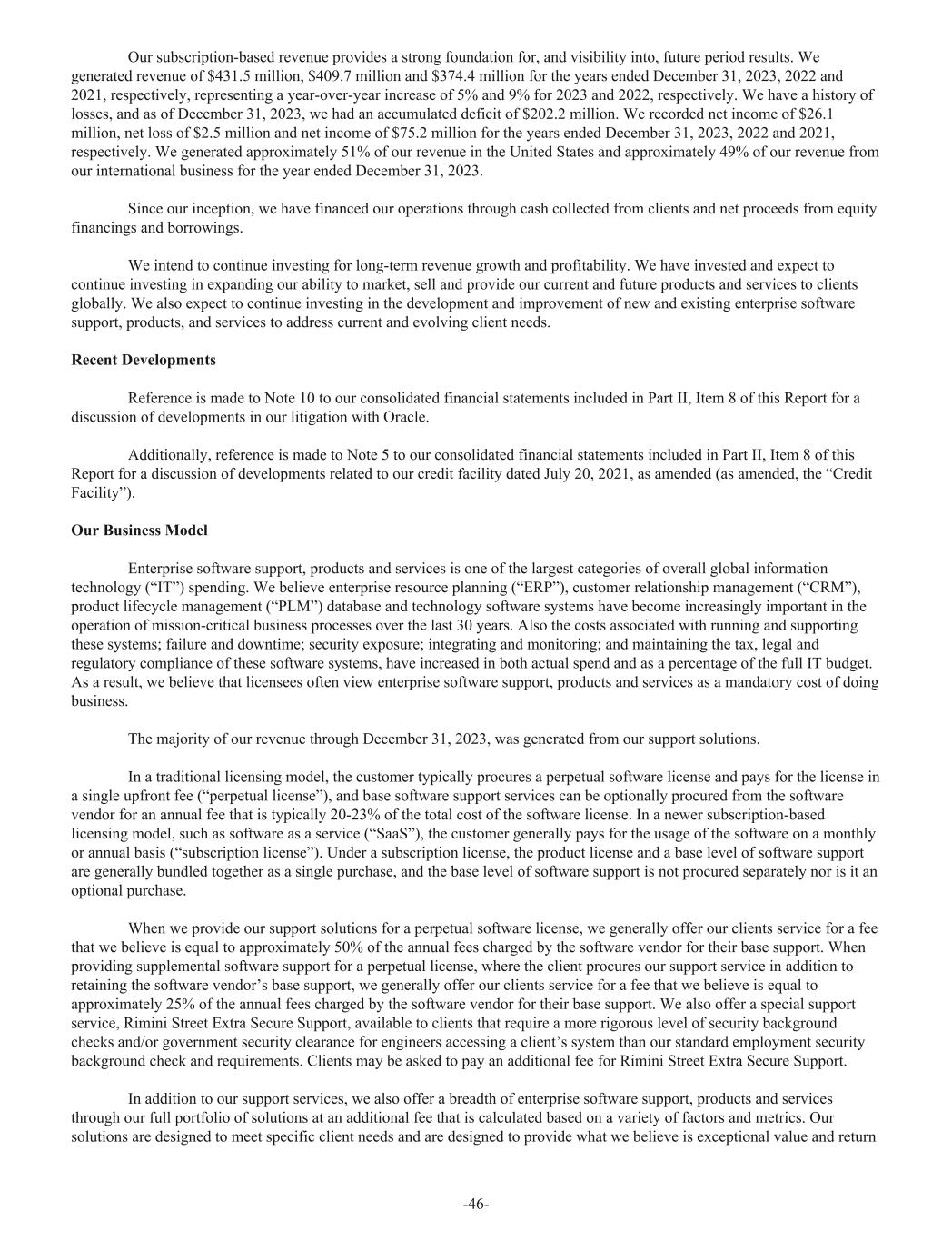 Our subscription-based revenue provides a strong foundation for, and visibility into, future period results. We generated revenue of $431.5 million, $409.7 million and $374.4 million for the years ended December 31, 2023, 2022 and 2021, respectively, representing a year-over-year increase of 5% and 9% for 2023 and 2022, respectively. We have a history of losses, and as of December 31, 2023, we had an accumulated deficit of $202.2 million. We recorded net income of $26.1 million, net loss of $2.5 million and net income of $75.2 million for the years ended December 31, 2023, 2022 and 2021, respectively. We generated approximately 51% of our revenue in the United States and approximately 49% of our revenue from our international business for the year ended December 31, 2023. Since our inception, we have financed our operations through cash collected from clients and net proceeds from equity financings and borrowings. We intend to continue investing for long-term revenue growth and profitability. We have invested and expect to continue investing in expanding our ability to market, sell and provide our current and future products and services to clients globally. We also expect to continue investing in the development and improvement of new and existing enterprise software support, products, and services to address current and evolving client needs. Recent Developments Reference is made to Note 10 to our consolidated financial statements included in Part II, Item 8 of this Report for a discussion of developments in our litigation with Oracle. Additionally, reference is made to Note 5 to our consolidated financial statements included in Part II, Item 8 of this Report for a discussion of developments related to our credit facility dated July 20, 2021, as amended (as amended, the “Credit Facility”). Our Business Model Enterprise software support, products and services is one of the largest categories of overall global information technology (“IT”) spending. We believe enterprise resource planning (“ERP”), customer relationship management (“CRM”), product lifecycle management (“PLM”) database and technology software systems have become increasingly important in the operation of mission-critical business processes over the last 30 years. Also the costs associated with running and supporting these systems; failure and downtime; security exposure; integrating and monitoring; and maintaining the tax, legal and regulatory compliance of these software systems, have increased in both actual spend and as a percentage of the full IT budget. As a result, we believe that licensees often view enterprise software support, products and services as a mandatory cost of doing business. The majority of our revenue through December 31, 2023, was generated from our support solutions. In a traditional licensing model, the customer typically procures a perpetual software license and pays for the license in a single upfront fee (“perpetual license”), and base software support services can be optionally procured from the software vendor for an annual fee that is typically 20-23% of the total cost of the software license. In a newer subscription-based licensing model, such as software as a service (“SaaS”), the customer generally pays for the usage of the software on a monthly or annual basis (“subscription license”). Under a subscription license, the product license and a base level of software support are generally bundled together as a single purchase, and the base level of software support is not procured separately nor is it an optional purchase. When we provide our support solutions for a perpetual software license, we generally offer our clients service for a fee that we believe is equal to approximately 50% of the annual fees charged by the software vendor for their base support. When providing supplemental software support for a perpetual license, where the client procures our support service in addition to retaining the software vendor’s base support, we generally offer our clients service for a fee that we believe is equal to approximately 25% of the annual fees charged by the software vendor for their base support. We also offer a special support service, Rimini Street Extra Secure Support, available to clients that require a more rigorous level of security background checks and/or government security clearance for engineers accessing a client’s system than our standard employment security background check and requirements. Clients may be asked to pay an additional fee for Rimini Street Extra Secure Support. In addition to our support services, we also offer a breadth of enterprise software support, products and services through our full portfolio of solutions at an additional fee that is calculated based on a variety of factors and metrics. Our solutions are designed to meet specific client needs and are designed to provide what we believe is exceptional value and return -46-