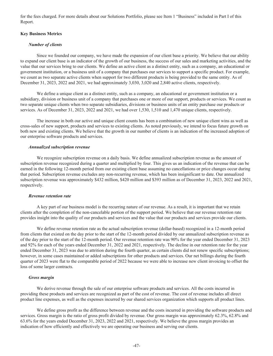 for the fees charged. For more details about our Solutions Portfolio, please see Item 1 “Business” included in Part I of this Report. Key Business Metrics Number of clients Since we founded our company, we have made the expansion of our client base a priority. We believe that our ability to expand our client base is an indicator of the growth of our business, the success of our sales and marketing activities, and the value that our services bring to our clients. We define an active client as a distinct entity, such as a company, an educational or government institution, or a business unit of a company that purchases our services to support a specific product. For example, we count as two separate active clients when support for two different products is being provided to the same entity. As of December 31, 2023, 2022 and 2021, we had approximately 3,030, 3,020 and 2,840 active clients, respectively. We define a unique client as a distinct entity, such as a company, an educational or government institution or a subsidiary, division or business unit of a company that purchases one or more of our support, products or services. We count as two separate unique clients when two separate subsidiaries, divisions or business units of an entity purchase our products or services. As of December 31, 2023, 2022 and 2021, we had over 1,530, 1,510 and 1,470 unique clients, respectively. The increase in both our active and unique client counts has been a combination of new unique client wins as well as cross-sales of new support, products and services to existing clients. As noted previously, we intend to focus future growth on both new and existing clients. We believe that the growth in our number of clients is an indication of the increased adoption of our enterprise software products and services. Annualized subscription revenue We recognize subscription revenue on a daily basis. We define annualized subscription revenue as the amount of subscription revenue recognized during a quarter and multiplied by four. This gives us an indication of the revenue that can be earned in the following 12-month period from our existing client base assuming no cancellations or price changes occur during that period. Subscription revenue excludes any non-recurring revenue, which has been insignificant to date. Our annualized subscription revenue was approximately $432 million, $420 million and $393 million as of December 31, 2023, 2022 and 2021, respectively. Revenue retention rate A key part of our business model is the recurring nature of our revenue. As a result, it is important that we retain clients after the completion of the non-cancelable portion of the support period. We believe that our revenue retention rate provides insight into the quality of our products and services and the value that our products and services provide our clients. We define revenue retention rate as the actual subscription revenue (dollar-based) recognized in a 12-month period from clients that existed on the day prior to the start of the 12-month period divided by our annualized subscription revenue as of the day prior to the start of the 12-month period. Our revenue retention rate was 90% for the year ended December 31, 2023 and 92% for each of the years ended December 31, 2022 and 2021, respectively. The decline in our retention rate for the year ended December 31, 2023 was due to attrition during the fourth quarter, as certain clients did not renew specific subscriptions; however, in some cases maintained or added subscriptions for other products and services. Our net billings during the fourth quarter of 2023 were flat to the comparable period of 2022 because we were able to increase new client invoicing to offset the loss of some larger contracts. Gross margin We derive revenue through the sale of our enterprise software products and services. All the costs incurred in providing these products and services are recognized as part of the cost of revenue. The cost of revenue includes all direct product line expenses, as well as the expenses incurred by our shared services organization which supports all product lines. We define gross profit as the difference between revenue and the costs incurred in providing the software products and services. Gross margin is the ratio of gross profit divided by revenue. Our gross margin was approximately 62.3%, 62.8% and 63.6% for the years ended December 31, 2023, 2022 and 2021, respectively. We believe the gross margin provides an indication of how efficiently and effectively we are operating our business and serving our clients. -47-
