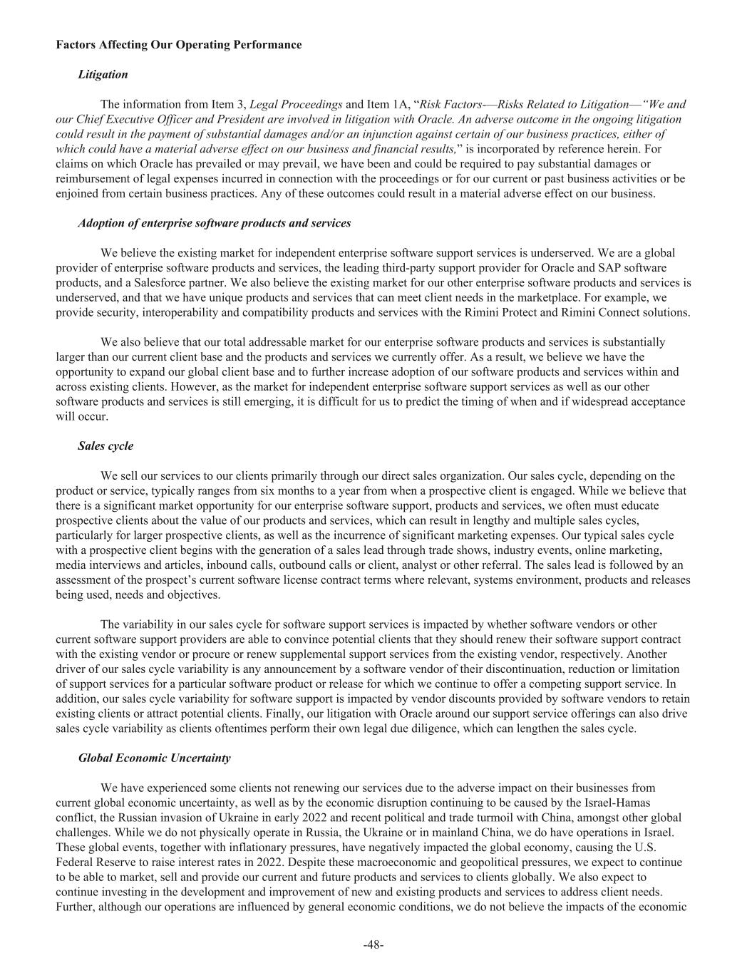 Factors Affecting Our Operating Performance Litigation The information from Item 3, Legal Proceedings and Item 1A, “Risk Factors-—Risks Related to Litigation—“We and our Chief Executive Officer and President are involved in litigation with Oracle. An adverse outcome in the ongoing litigation could result in the payment of substantial damages and/or an injunction against certain of our business practices, either of which could have a material adverse effect on our business and financial results,” is incorporated by reference herein. For claims on which Oracle has prevailed or may prevail, we have been and could be required to pay substantial damages or reimbursement of legal expenses incurred in connection with the proceedings or for our current or past business activities or be enjoined from certain business practices. Any of these outcomes could result in a material adverse effect on our business. Adoption of enterprise software products and services We believe the existing market for independent enterprise software support services is underserved. We are a global provider of enterprise software products and services, the leading third-party support provider for Oracle and SAP software products, and a Salesforce partner. We also believe the existing market for our other enterprise software products and services is underserved, and that we have unique products and services that can meet client needs in the marketplace. For example, we provide security, interoperability and compatibility products and services with the Rimini Protect and Rimini Connect solutions. We also believe that our total addressable market for our enterprise software products and services is substantially larger than our current client base and the products and services we currently offer. As a result, we believe we have the opportunity to expand our global client base and to further increase adoption of our software products and services within and across existing clients. However, as the market for independent enterprise software support services as well as our other software products and services is still emerging, it is difficult for us to predict the timing of when and if widespread acceptance will occur. Sales cycle We sell our services to our clients primarily through our direct sales organization. Our sales cycle, depending on the product or service, typically ranges from six months to a year from when a prospective client is engaged. While we believe that there is a significant market opportunity for our enterprise software support, products and services, we often must educate prospective clients about the value of our products and services, which can result in lengthy and multiple sales cycles, particularly for larger prospective clients, as well as the incurrence of significant marketing expenses. Our typical sales cycle with a prospective client begins with the generation of a sales lead through trade shows, industry events, online marketing, media interviews and articles, inbound calls, outbound calls or client, analyst or other referral. The sales lead is followed by an assessment of the prospect’s current software license contract terms where relevant, systems environment, products and releases being used, needs and objectives. The variability in our sales cycle for software support services is impacted by whether software vendors or other current software support providers are able to convince potential clients that they should renew their software support contract with the existing vendor or procure or renew supplemental support services from the existing vendor, respectively. Another driver of our sales cycle variability is any announcement by a software vendor of their discontinuation, reduction or limitation of support services for a particular software product or release for which we continue to offer a competing support service. In addition, our sales cycle variability for software support is impacted by vendor discounts provided by software vendors to retain existing clients or attract potential clients. Finally, our litigation with Oracle around our support service offerings can also drive sales cycle variability as clients oftentimes perform their own legal due diligence, which can lengthen the sales cycle. Global Economic Uncertainty We have experienced some clients not renewing our services due to the adverse impact on their businesses from current global economic uncertainty, as well as by the economic disruption continuing to be caused by the Israel-Hamas conflict, the Russian invasion of Ukraine in early 2022 and recent political and trade turmoil with China, amongst other global challenges. While we do not physically operate in Russia, the Ukraine or in mainland China, we do have operations in Israel. These global events, together with inflationary pressures, have negatively impacted the global economy, causing the U.S. Federal Reserve to raise interest rates in 2022. Despite these macroeconomic and geopolitical pressures, we expect to continue to be able to market, sell and provide our current and future products and services to clients globally. We also expect to continue investing in the development and improvement of new and existing products and services to address client needs. Further, although our operations are influenced by general economic conditions, we do not believe the impacts of the economic -48-