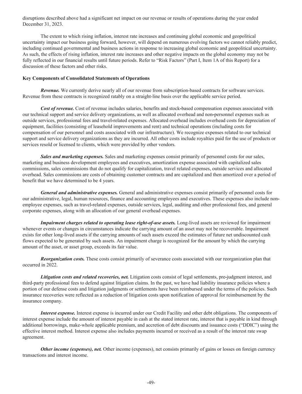 disruptions described above had a significant net impact on our revenue or results of operations during the year ended December 31, 2023. The extent to which rising inflation, interest rate increases and continuing global economic and geopolitical uncertainty impact our business going forward, however, will depend on numerous evolving factors we cannot reliably predict, including continued governmental and business actions in response to increasing global economic and geopolitical uncertainty. As such, the effects of rising inflation, interest rate increases and other negative impacts on the global economy may not be fully reflected in our financial results until future periods. Refer to “Risk Factors” (Part I, Item 1A of this Report) for a discussion of these factors and other risks. Key Components of Consolidated Statements of Operations Revenue. We currently derive nearly all of our revenue from subscription-based contracts for software services. Revenue from these contracts is recognized ratably on a straight-line basis over the applicable service period. Cost of revenue. Cost of revenue includes salaries, benefits and stock-based compensation expenses associated with our technical support and service delivery organizations, as well as allocated overhead and non-personnel expenses such as outside services, professional fees and travel-related expenses. Allocated overhead includes overhead costs for depreciation of equipment, facilities (consisting of leasehold improvements and rent) and technical operations (including costs for compensation of our personnel and costs associated with our infrastructure). We recognize expenses related to our technical support and service delivery organizations as they are incurred. All other costs include royalties paid for the use of products or services resold or licensed to clients, which were provided by other vendors. Sales and marketing expenses. Sales and marketing expenses consist primarily of personnel costs for our sales, marketing and business development employees and executives, amortization expense associated with capitalized sales commissions, sales commissions that do not qualify for capitalization, travel related expenses, outside services and allocated overhead. Sales commissions are costs of obtaining customer contracts and are capitalized and then amortized over a period of benefit that we have determined to be 4 years. General and administrative expenses. General and administrative expenses consist primarily of personnel costs for our administrative, legal, human resources, finance and accounting employees and executives. These expenses also include non- employee expenses, such as travel-related expenses, outside services, legal, auditing and other professional fees, and general corporate expenses, along with an allocation of our general overhead expenses. Impairment charges related to operating lease right-of-use assets. Long-lived assets are reviewed for impairment whenever events or changes in circumstances indicate the carrying amount of an asset may not be recoverable. Impairment exists for other long-lived assets if the carrying amounts of such assets exceed the estimates of future net undiscounted cash flows expected to be generated by such assets. An impairment charge is recognized for the amount by which the carrying amount of the asset, or asset group, exceeds its fair value. Reorganization costs. These costs consist primarily of severance costs associated with our reorganization plan that occurred in 2022. Litigation costs and related recoveries, net. Litigation costs consist of legal settlements, pre-judgment interest, and third-party professional fees to defend against litigation claims. In the past, we have had liability insurance policies where a portion of our defense costs and litigation judgments or settlements have been reimbursed under the terms of the policies. Such insurance recoveries were reflected as a reduction of litigation costs upon notification of approval for reimbursement by the insurance company. Interest expense. Interest expense is incurred under our Credit Facility and other debt obligations. The components of interest expense include the amount of interest payable in cash at the stated interest rate, interest that is payable in kind through additional borrowings, make-whole applicable premium, and accretion of debt discounts and issuance costs (“DDIC”) using the effective interest method. Interest expense also includes payments incurred or received as a result of the interest rate swap agreement. Other income (expenses), net. Other income (expenses), net consists primarily of gains or losses on foreign currency transactions and interest income. -49-