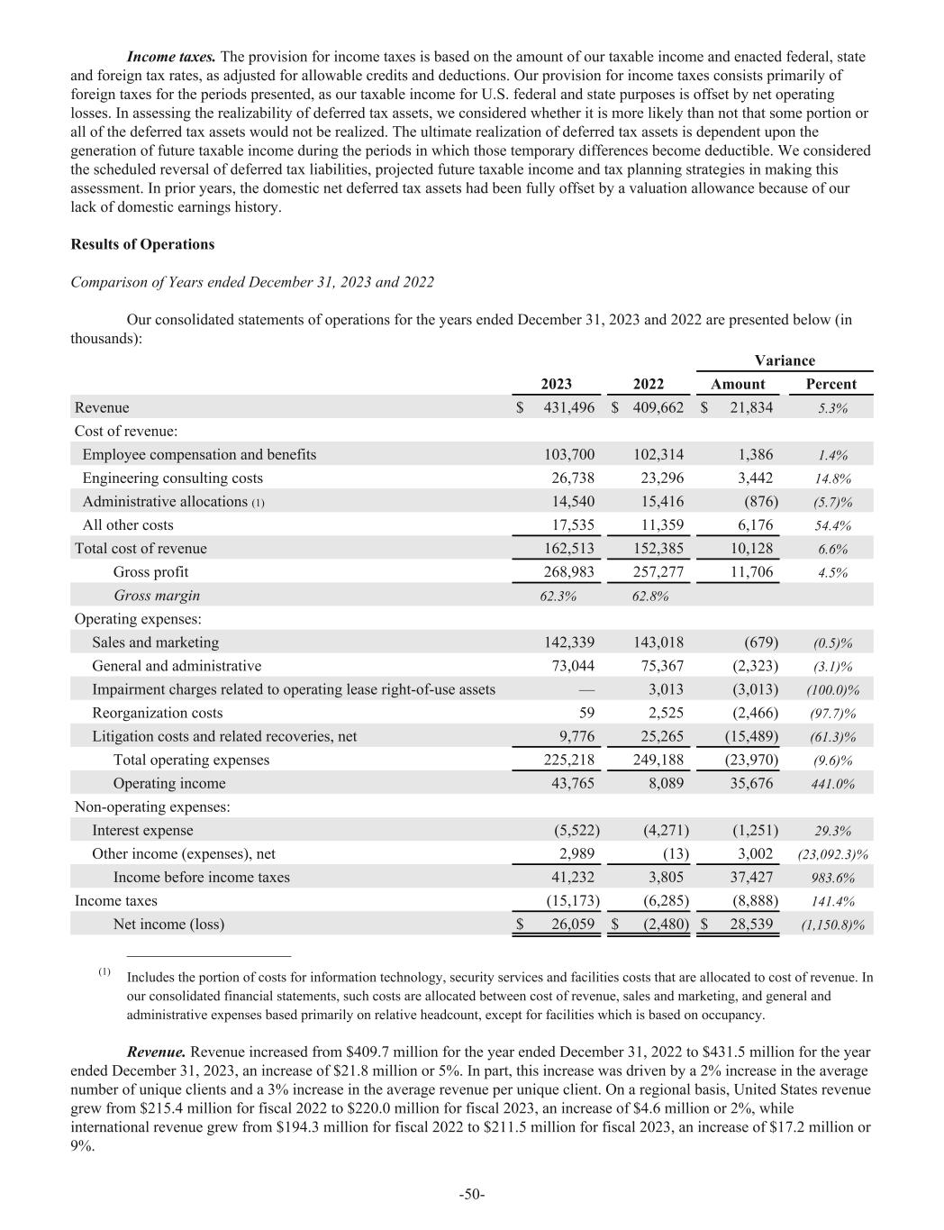 Income taxes. The provision for income taxes is based on the amount of our taxable income and enacted federal, state and foreign tax rates, as adjusted for allowable credits and deductions. Our provision for income taxes consists primarily of foreign taxes for the periods presented, as our taxable income for U.S. federal and state purposes is offset by net operating losses. In assessing the realizability of deferred tax assets, we considered whether it is more likely than not that some portion or all of the deferred tax assets would not be realized. The ultimate realization of deferred tax assets is dependent upon the generation of future taxable income during the periods in which those temporary differences become deductible. We considered the scheduled reversal of deferred tax liabilities, projected future taxable income and tax planning strategies in making this assessment. In prior years, the domestic net deferred tax assets had been fully offset by a valuation allowance because of our lack of domestic earnings history. Results of Operations Comparison of Years ended December 31, 2023 and 2022 Our consolidated statements of operations for the years ended December 31, 2023 and 2022 are presented below (in thousands): Variance 2023 2022 Amount Percent Revenue $ 431,496 $ 409,662 $ 21,834 5.3% Cost of revenue: Employee compensation and benefits 103,700 102,314 1,386 1.4% Engineering consulting costs 26,738 23,296 3,442 14.8% Administrative allocations (1) 14,540 15,416 (876) (5.7)% All other costs 17,535 11,359 6,176 54.4% Total cost of revenue 162,513 152,385 10,128 6.6% Gross profit 268,983 257,277 11,706 4.5% Gross margin 62.3% 62.8% Operating expenses: Sales and marketing 142,339 143,018 (679) (0.5)% General and administrative 73,044 75,367 (2,323) (3.1)% Impairment charges related to operating lease right-of-use assets — 3,013 (3,013) (100.0)% Reorganization costs 59 2,525 (2,466) (97.7)% Litigation costs and related recoveries, net 9,776 25,265 (15,489) (61.3)% Total operating expenses 225,218 249,188 (23,970) (9.6)% Operating income 43,765 8,089 35,676 441.0% Non-operating expenses: Interest expense (5,522) (4,271) (1,251) 29.3% Other income (expenses), net 2,989 (13) 3,002 (23,092.3)% Income before income taxes 41,232 3,805 37,427 983.6% Income taxes (15,173) (6,285) (8,888) 141.4% Net income (loss) $ 26,059 $ (2,480) $ 28,539 (1,150.8)% _____________________ (1) Includes the portion of costs for information technology, security services and facilities costs that are allocated to cost of revenue. In our consolidated financial statements, such costs are allocated between cost of revenue, sales and marketing, and general and administrative expenses based primarily on relative headcount, except for facilities which is based on occupancy. Revenue. Revenue increased from $409.7 million for the year ended December 31, 2022 to $431.5 million for the year ended December 31, 2023, an increase of $21.8 million or 5%. In part, this increase was driven by a 2% increase in the average number of unique clients and a 3% increase in the average revenue per unique client. On a regional basis, United States revenue grew from $215.4 million for fiscal 2022 to $220.0 million for fiscal 2023, an increase of $4.6 million or 2%, while international revenue grew from $194.3 million for fiscal 2022 to $211.5 million for fiscal 2023, an increase of $17.2 million or 9%. -50-