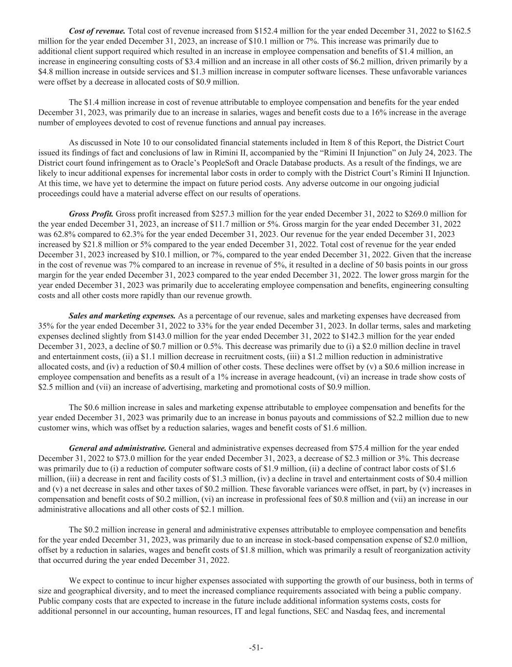 Cost of revenue. Total cost of revenue increased from $152.4 million for the year ended December 31, 2022 to $162.5 million for the year ended December 31, 2023, an increase of $10.1 million or 7%. This increase was primarily due to additional client support required which resulted in an increase in employee compensation and benefits of $1.4 million, an increase in engineering consulting costs of $3.4 million and an increase in all other costs of $6.2 million, driven primarily by a $4.8 million increase in outside services and $1.3 million increase in computer software licenses. These unfavorable variances were offset by a decrease in allocated costs of $0.9 million. The $1.4 million increase in cost of revenue attributable to employee compensation and benefits for the year ended December 31, 2023, was primarily due to an increase in salaries, wages and benefit costs due to a 16% increase in the average number of employees devoted to cost of revenue functions and annual pay increases. As discussed in Note 10 to our consolidated financial statements included in Item 8 of this Report, the District Court issued its findings of fact and conclusions of law in Rimini II, accompanied by the “Rimini II Injunction” on July 24, 2023. The District court found infringement as to Oracle’s PeopleSoft and Oracle Database products. As a result of the findings, we are likely to incur additional expenses for incremental labor costs in order to comply with the District Court’s Rimini II Injunction. At this time, we have yet to determine the impact on future period costs. Any adverse outcome in our ongoing judicial proceedings could have a material adverse effect on our results of operations. Gross Profit. Gross profit increased from $257.3 million for the year ended December 31, 2022 to $269.0 million for the year ended December 31, 2023, an increase of $11.7 million or 5%. Gross margin for the year ended December 31, 2022 was 62.8% compared to 62.3% for the year ended December 31, 2023. Our revenue for the year ended December 31, 2023 increased by $21.8 million or 5% compared to the year ended December 31, 2022. Total cost of revenue for the year ended December 31, 2023 increased by $10.1 million, or 7%, compared to the year ended December 31, 2022. Given that the increase in the cost of revenue was 7% compared to an increase in revenue of 5%, it resulted in a decline of 50 basis points in our gross margin for the year ended December 31, 2023 compared to the year ended December 31, 2022. The lower gross margin for the year ended December 31, 2023 was primarily due to accelerating employee compensation and benefits, engineering consulting costs and all other costs more rapidly than our revenue growth. Sales and marketing expenses. As a percentage of our revenue, sales and marketing expenses have decreased from 35% for the year ended December 31, 2022 to 33% for the year ended December 31, 2023. In dollar terms, sales and marketing expenses declined slightly from $143.0 million for the year ended December 31, 2022 to $142.3 million for the year ended December 31, 2023, a decline of $0.7 million or 0.5%. This decrease was primarily due to (i) a $2.0 million decline in travel and entertainment costs, (ii) a $1.1 million decrease in recruitment costs, (iii) a $1.2 million reduction in administrative allocated costs, and (iv) a reduction of $0.4 million of other costs. These declines were offset by (v) a $0.6 million increase in employee compensation and benefits as a result of a 1% increase in average headcount, (vi) an increase in trade show costs of $2.5 million and (vii) an increase of advertising, marketing and promotional costs of $0.9 million. The $0.6 million increase in sales and marketing expense attributable to employee compensation and benefits for the year ended December 31, 2023 was primarily due to an increase in bonus payouts and commissions of $2.2 million due to new customer wins, which was offset by a reduction salaries, wages and benefit costs of $1.6 million. General and administrative. General and administrative expenses decreased from $75.4 million for the year ended December 31, 2022 to $73.0 million for the year ended December 31, 2023, a decrease of $2.3 million or 3%. This decrease was primarily due to (i) a reduction of computer software costs of $1.9 million, (ii) a decline of contract labor costs of $1.6 million, (iii) a decrease in rent and facility costs of $1.3 million, (iv) a decline in travel and entertainment costs of $0.4 million and (v) a net decrease in sales and other taxes of $0.2 million. These favorable variances were offset, in part, by (v) increases in compensation and benefit costs of $0.2 million, (vi) an increase in professional fees of $0.8 million and (vii) an increase in our administrative allocations and all other costs of $2.1 million. The $0.2 million increase in general and administrative expenses attributable to employee compensation and benefits for the year ended December 31, 2023, was primarily due to an increase in stock-based compensation expense of $2.0 million, offset by a reduction in salaries, wages and benefit costs of $1.8 million, which was primarily a result of reorganization activity that occurred during the year ended December 31, 2022. We expect to continue to incur higher expenses associated with supporting the growth of our business, both in terms of size and geographical diversity, and to meet the increased compliance requirements associated with being a public company. Public company costs that are expected to increase in the future include additional information systems costs, costs for additional personnel in our accounting, human resources, IT and legal functions, SEC and Nasdaq fees, and incremental -51-