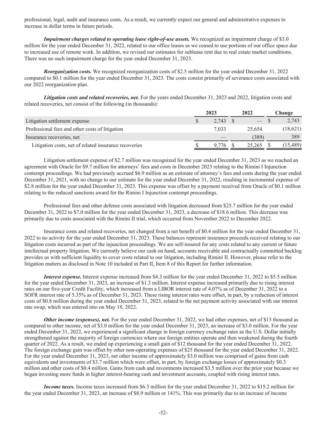 professional, legal, audit and insurance costs. As a result, we currently expect our general and administrative expenses to increase in dollar terms in future periods. Impairment charges related to operating lease right-of-use assets. We recognized an impairment charge of $3.0 million for the year ended December 31, 2022, related to our office leases as we ceased to use portions of our office space due to increased use of remote work. In addition, we revised our estimates for sublease rent due to real estate market conditions. There was no such impairment charge for the year ended December 31, 2023. Reorganization costs. We recognized reorganization costs of $2.5 million for the year ended December 31, 2022 compared to $0.1 million for the year ended December 31, 2023. The costs consist primarily of severance costs associated with our 2022 reorganization plan. Litigation costs and related recoveries, net. For the years ended December 31, 2023 and 2022, litigation costs and related recoveries, net consist of the following (in thousands): 2023 2022 Change Litigation settlement expense $ 2,743 $ — $ 2,743 Professional fees and other costs of litigation 7,033 25,654 (18,621) Insurance recoveries, net — (389) 389 Litigation costs, net of related insurance recoveries $ 9,776 $ 25,265 $ (15,489) Litigation settlement expense of $2.7 million was recognized for the year ended December 31, 2023 as we reached an agreement with Oracle for $9.7 million for attorneys’ fees and costs in December 2023 relating to the Rimini I Injunction contempt proceedings. We had previously accrued $6.9 million as an estimate of attorney’s fees and costs during the year ended December 31, 2021, with no change to our estimate for the year ended December 31, 2022, resulting in incremental expense of $2.8 million for the year ended December 31, 2023. This expense was offset by a payment received from Oracle of $0.1 million relating to the reduced sanctions award for the Rimini I Injunction contempt proceedings. Professional fees and other defense costs associated with litigation decreased from $25.7 million for the year ended December 31, 2022 to $7.0 million for the year ended December 31, 2023, a decrease of $18.6 million. This decrease was primarily due to costs associated with the Rimini II trial, which occurred from November 2022 to December 2022. Insurance costs and related recoveries, net changed from a net benefit of $0.4 million for the year ended December 31, 2022 to no activity for the year ended December 31, 2023. These balances represent insurance proceeds received relating to our litigation costs incurred as part of the injunction proceedings. We are self-insured for any costs related to any current or future intellectual property litigation. We currently believe our cash on hand, accounts receivable and contractually committed backlog provides us with sufficient liquidity to cover costs related to our litigation, including Rimini II. However, please refer to the litigation matters as disclosed in Note 10 included in Part II, Item 8 of this Report for further information. Interest expense. Interest expense increased from $4.3 million for the year ended December 31, 2022 to $5.5 million for the year ended December 31, 2023, an increase of $1.3 million. Interest expense increased primarily due to rising interest rates on our five-year Credit Facility, which increased from a LIBOR interest rate of 4.07% as of December 31, 2022 to a SOFR interest rate of 5.35% as of December 31, 2023. These rising interest rates were offset, in part, by a reduction of interest costs of $0.8 million during the year ended December 31, 2023, related to the net payment activity associated with our interest rate swap, which was entered into on May 18, 2022. Other income (expenses), net. For the year ended December 31, 2022, we had other expenses, net of $13 thousand as compared to other income, net of $3.0 million for the year ended December 31, 2023, an increase of $3.0 million. For the year ended December 31, 2022, we experienced a significant change in foreign currency exchange rates as the U.S. Dollar initially strengthened against the majority of foreign currencies where our foreign entities operate and then weakened during the fourth quarter of 2022. As a result, we ended up experiencing a small gain of $12 thousand for the year ended December 31, 2022. The foreign exchange gain was offset by other non-operating expenses of $25 thousand for the year ended December 31, 2022. For the year ended December 31, 2023, net other income of approximately $3.0 million was comprised of gains from cash equivalents and investments of $3.7 million which were offset, in part, by foreign exchange losses of approximately $0.3 million and other costs of $0.4 million. Gains from cash and investments increased $3.5 million over the prior year because we began investing more funds in higher interest-bearing cash and investment accounts, coupled with rising interest rates. Income taxes. Income taxes increased from $6.3 million for the year ended December 31, 2022 to $15.2 million for the year ended December 31, 2023, an increase of $8.9 million or 141%. This was primarily due to an increase of income -52-