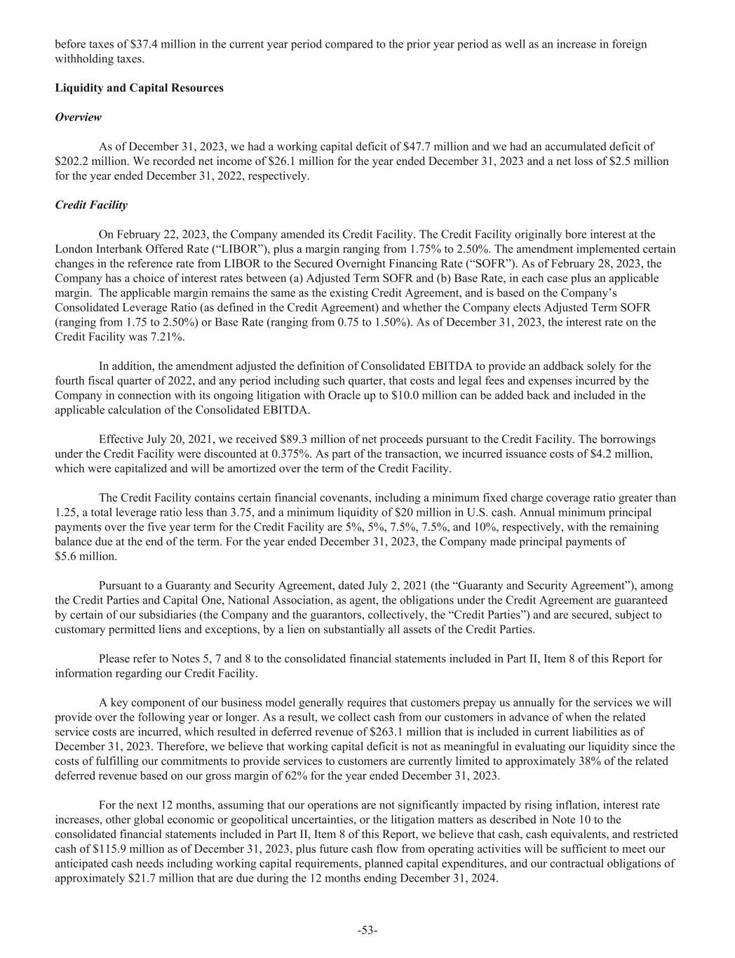 before taxes of $37.4 million in the current year period compared to the prior year period as well as an increase in foreign withholding taxes. Liquidity and Capital Resources Overview As of December 31, 2023, we had a working capital deficit of $47.7 million and we had an accumulated deficit of $202.2 million. We recorded net income of $26.1 million for the year ended December 31, 2023 and a net loss of $2.5 million for the year ended December 31, 2022, respectively. Credit Facility On February 22, 2023, the Company amended its Credit Facility. The Credit Facility originally bore interest at the London Interbank Offered Rate (“LIBOR”), plus a margin ranging from 1.75% to 2.50%. The amendment implemented certain changes in the reference rate from LIBOR to the Secured Overnight Financing Rate (“SOFR”). As of February 28, 2023, the Company has a choice of interest rates between (a) Adjusted Term SOFR and (b) Base Rate, in each case plus an applicable margin. The applicable margin remains the same as the existing Credit Agreement, and is based on the Company’s Consolidated Leverage Ratio (as defined in the Credit Agreement) and whether the Company elects Adjusted Term SOFR (ranging from 1.75 to 2.50%) or Base Rate (ranging from 0.75 to 1.50%). As of December 31, 2023, the interest rate on the Credit Facility was 7.21%. In addition, the amendment adjusted the definition of Consolidated EBITDA to provide an addback solely for the fourth fiscal quarter of 2022, and any period including such quarter, that costs and legal fees and expenses incurred by the Company in connection with its ongoing litigation with Oracle up to $10.0 million can be added back and included in the applicable calculation of the Consolidated EBITDA. Effective July 20, 2021, we received $89.3 million of net proceeds pursuant to the Credit Facility. The borrowings under the Credit Facility were discounted at 0.375%. As part of the transaction, we incurred issuance costs of $4.2 million, which were capitalized and will be amortized over the term of the Credit Facility. The Credit Facility contains certain financial covenants, including a minimum fixed charge coverage ratio greater than 1.25, a total leverage ratio less than 3.75, and a minimum liquidity of $20 million in U.S. cash. Annual minimum principal payments over the five year term for the Credit Facility are 5%, 5%, 7.5%, 7.5%, and 10%, respectively, with the remaining balance due at the end of the term. For the year ended December 31, 2023, the Company made principal payments of $5.6 million. Pursuant to a Guaranty and Security Agreement, dated July 2, 2021 (the “Guaranty and Security Agreement”), among the Credit Parties and Capital One, National Association, as agent, the obligations under the Credit Agreement are guaranteed by certain of our subsidiaries (the Company and the guarantors, collectively, the “Credit Parties”) and are secured, subject to customary permitted liens and exceptions, by a lien on substantially all assets of the Credit Parties. Please refer to Notes 5, 7 and 8 to the consolidated financial statements included in Part II, Item 8 of this Report for information regarding our Credit Facility. A key component of our business model generally requires that customers prepay us annually for the services we will provide over the following year or longer. As a result, we collect cash from our customers in advance of when the related service costs are incurred, which resulted in deferred revenue of $263.1 million that is included in current liabilities as of December 31, 2023. Therefore, we believe that working capital deficit is not as meaningful in evaluating our liquidity since the costs of fulfilling our commitments to provide services to customers are currently limited to approximately 38% of the related deferred revenue based on our gross margin of 62% for the year ended December 31, 2023. For the next 12 months, assuming that our operations are not significantly impacted by rising inflation, interest rate increases, other global economic or geopolitical uncertainties, or the litigation matters as described in Note 10 to the consolidated financial statements included in Part II, Item 8 of this Report, we believe that cash, cash equivalents, and restricted cash of $115.9 million as of December 31, 2023, plus future cash flow from operating activities will be sufficient to meet our anticipated cash needs including working capital requirements, planned capital expenditures, and our contractual obligations of approximately $21.7 million that are due during the 12 months ending December 31, 2024. -53-
