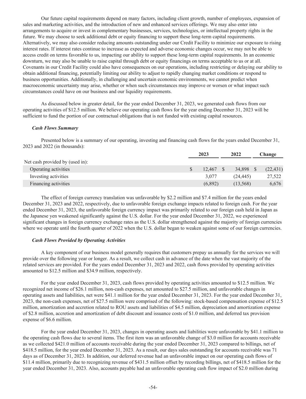 Our future capital requirements depend on many factors, including client growth, number of employees, expansion of sales and marketing activities, and the introduction of new and enhanced services offerings. We may also enter into arrangements to acquire or invest in complementary businesses, services, technologies, or intellectual property rights in the future. We may choose to seek additional debt or equity financing to support these long-term capital requirements. Alternatively, we may also consider reducing amounts outstanding under our Credit Facility to minimize our exposure to rising interest rates. If interest rates continue to increase as expected and adverse economic changes occur, we may not be able to access credit on terms favorable to us, impacting our ability to support these long-term capital requirements. In an economic downturn, we may also be unable to raise capital through debt or equity financings on terms acceptable to us or at all. Covenants in our Credit Facility could also have consequences on our operations, including restricting or delaying our ability to obtain additional financing, potentially limiting our ability to adjust to rapidly changing market conditions or respond to business opportunities. Additionally, in challenging and uncertain economic environments, we cannot predict when macroeconomic uncertainty may arise, whether or when such circumstances may improve or worsen or what impact such circumstances could have on our business and our liquidity requirements. As discussed below in greater detail, for the year ended December 31, 2023, we generated cash flows from our operating activities of $12.5 million. We believe our operating cash flows for the year ending December 31, 2023 will be sufficient to fund the portion of our contractual obligations that is not funded with existing capital resources. Cash Flows Summary Presented below is a summary of our operating, investing and financing cash flows for the years ended December 31, 2023 and 2022 (in thousands): 2023 2022 Change Net cash provided by (used in): Operating activities $ 12,467 $ 34,898 $ (22,431) Investing activities 3,077 (24,445) 27,522 Financing activities (6,892) (13,568) 6,676 The effect of foreign currency translation was unfavorable by $2.2 million and $7.4 million for the years ended December 31, 2023 and 2022, respectively, due to unfavorable foreign exchange impacts related to foreign cash. For the year ended December 31, 2023, the unfavorable foreign currency impact was primarily related to our foreign cash held in Japan as the Japanese yen weakened significantly against the U.S. dollar. For the year ended December 31, 2022, we experienced significant changes in foreign currency exchange rates as the U.S. dollar strengthened against the majority of foreign currencies where we operate until the fourth quarter of 2022 when the U.S. dollar began to weaken against some of our foreign currencies. Cash Flows Provided by Operating Activities A key component of our business model generally requires that customers prepay us annually for the services we will provide over the following year or longer. As a result, we collect cash in advance of the date when the vast majority of the related services are provided. For the years ended December 31, 2023 and 2022, cash flows provided by operating activities amounted to $12.5 million and $34.9 million, respectively. For the year ended December 31, 2023, cash flows provided by operating activities amounted to $12.5 million. We recognized net income of $26.1 million, non-cash expenses, net amounted to $27.5 million, and unfavorable changes in operating assets and liabilities, net were $41.1 million for the year ended December 31, 2023. For the year ended December 31, 2023, the non-cash expenses, net of $27.5 million were comprised of the following: stock-based compensation expense of $12.5 million, amortization and accretion related to ROU assets and liabilities of $4.5 million, depreciation and amortization expense of $2.8 million, accretion and amortization of debt discount and issuance costs of $1.0 million, and deferred tax provision expense of $6.6 million. For the year ended December 31, 2023, changes in operating assets and liabilities were unfavorable by $41.1 million to the operating cash flows due to several items. The first item was an unfavorable change of $3.0 million for accounts receivable as we collected $421.0 million of accounts receivable during the year ended December 31, 2023 compared to billings, net of $418.5 million, for the year ended December 31, 2023. As a result, our days sales outstanding for accounts receivable was 71 days as of December 31, 2023. In addition, our deferred revenue had an unfavorable impact on our operating cash flows of $11.4 million, primarily due to recognizing revenue of $431.5 million offset by recording billings, net of $418.5 million for the year ended December 31, 2023. Also, accounts payable had an unfavorable operating cash flow impact of $2.0 million during -54-