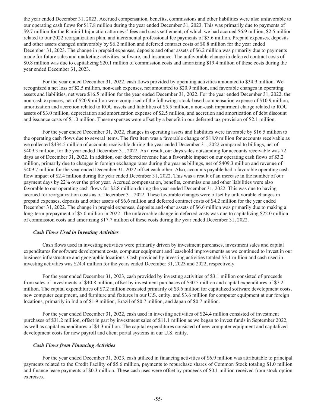 the year ended December 31, 2023. Accrued compensation, benefits, commissions and other liabilities were also unfavorable to our operating cash flows for $17.8 million during the year ended December 31, 2023. This was primarily due to payments of $9.7 million for the Rimini I Injunction attorneys’ fees and costs settlement, of which we had accrued $6.9 million, $2.5 million related to our 2022 reorganization plan, and incremental professional fee payments of $5.6 million. Prepaid expenses, deposits and other assets changed unfavorably by $6.2 million and deferred contract costs of $0.8 million for the year ended December 31, 2023. The change in prepaid expenses, deposits and other assets of $6.2 million was primarily due to payments made for future sales and marketing activities, software, and insurance. The unfavorable change in deferred contract costs of $0.8 million was due to capitalizing $20.1 million of commission costs and amortizing $19.4 million of these costs during the year ended December 31, 2023. For the year ended December 31, 2022, cash flows provided by operating activities amounted to $34.9 million. We recognized a net loss of $2.5 million, non-cash expenses, net amounted to $20.9 million, and favorable changes in operating assets and liabilities, net were $16.5 million for the year ended December 31, 2022. For the year ended December 31, 2022, the non-cash expenses, net of $20.9 million were comprised of the following: stock-based compensation expense of $10.9 million, amortization and accretion related to ROU assets and liabilities of $5.5 million, a non-cash impairment charge related to ROU assets of $3.0 million, depreciation and amortization expense of $2.5 million, and accretion and amortization of debt discount and issuance costs of $1.0 million. These expenses were offset by a benefit in our deferred tax provision of $2.1 million. For the year ended December 31, 2022, changes in operating assets and liabilities were favorable by $16.5 million to the operating cash flows due to several items. The first item was a favorable change of $18.9 million for accounts receivable as we collected $434.5 million of accounts receivable during the year ended December 31, 2022 compared to billings, net of $409.3 million, for the year ended December 31, 2022. As a result, our days sales outstanding for accounts receivable was 72 days as of December 31, 2022. In addition, our deferred revenue had a favorable impact on our operating cash flows of $3.2 million, primarily due to changes in foreign exchange rates during the year as billings, net of $409.3 million and revenue of $409.7 million for the year ended December 31, 2022 offset each other. Also, accounts payable had a favorable operating cash flow impact of $2.4 million during the year ended December 31, 2022. This was a result of an increase in the number of our payment days by 22% over the prior year. Accrued compensation, benefits, commissions and other liabilities were also favorable to our operating cash flows for $2.8 million during the year ended December 31, 2022. This was due to having accrued for reorganization costs as of December 31, 2022. These favorable changes were offset by unfavorable changes in prepaid expenses, deposits and other assets of $6.6 million and deferred contract costs of $4.2 million for the year ended December 31, 2022. The change in prepaid expenses, deposits and other assets of $6.6 million was primarily due to making a long-term prepayment of $5.0 million in 2022. The unfavorable change in deferred costs was due to capitalizing $22.0 million of commission costs and amortizing $17.7 million of these costs during the year ended December 31, 2022. Cash Flows Used in Investing Activities Cash flows used in investing activities were primarily driven by investment purchases, investment sales and capital expenditures for software development costs, computer equipment and leasehold improvements as we continued to invest in our business infrastructure and geographic locations. Cash provided by investing activities totaled $3.1 million and cash used in investing activities was $24.4 million for the years ended December 31, 2023 and 2022, respectively. For the year ended December 31, 2023, cash provided by investing activities of $3.1 million consisted of proceeds from sales of investments of $40.8 million, offset by investment purchases of $30.5 million and capital expenditures of $7.2 million. The capital expenditures of $7.2 million consisted primarily of $3.6 million for capitalized software development costs, new computer equipment, and furniture and fixtures in our U.S. entity, and $3.6 million for computer equipment at our foreign locations, primarily in India of $1.9 million, Brazil of $0.7 million, and Japan of $0.7 million. For the year ended December 31, 2022, cash used in investing activities of $24.4 million consisted of investment purchases of $31.2 million, offset in part by investment sales of $11.1 million as we began to invest funds in September 2022, as well as capital expenditures of $4.3 million. The capital expenditures consisted of new computer equipment and capitalized development costs for new payroll and client portal systems in our U.S. entity. Cash Flows from Financing Activities For the year ended December 31, 2023, cash utilized in financing activities of $6.9 million was attributable to principal payments related to the Credit Facility of $5.6 million, payments to repurchase shares of Common Stock totaling $1.0 million and finance lease payments of $0.3 million. These cash uses were offset by proceeds of $0.1 million received from stock option exercises. -55-