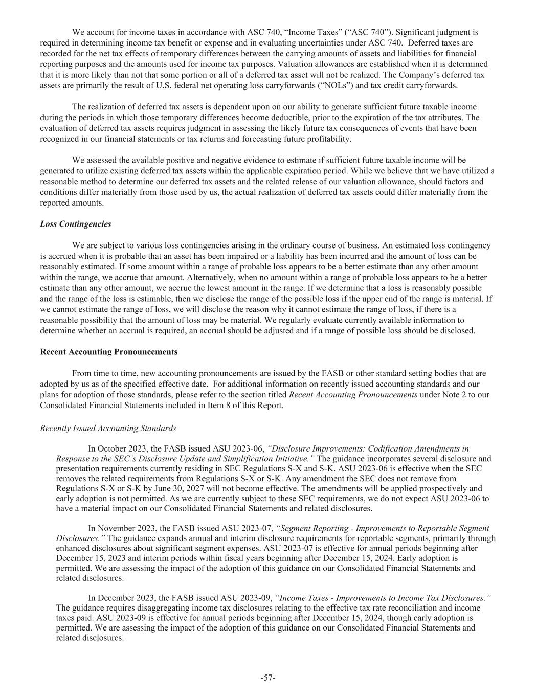 We account for income taxes in accordance with ASC 740, “Income Taxes” (“ASC 740”). Significant judgment is required in determining income tax benefit or expense and in evaluating uncertainties under ASC 740. Deferred taxes are recorded for the net tax effects of temporary differences between the carrying amounts of assets and liabilities for financial reporting purposes and the amounts used for income tax purposes. Valuation allowances are established when it is determined that it is more likely than not that some portion or all of a deferred tax asset will not be realized. The Company’s deferred tax assets are primarily the result of U.S. federal net operating loss carryforwards (“NOLs”) and tax credit carryforwards. The realization of deferred tax assets is dependent upon on our ability to generate sufficient future taxable income during the periods in which those temporary differences become deductible, prior to the expiration of the tax attributes. The evaluation of deferred tax assets requires judgment in assessing the likely future tax consequences of events that have been recognized in our financial statements or tax returns and forecasting future profitability. We assessed the available positive and negative evidence to estimate if sufficient future taxable income will be generated to utilize existing deferred tax assets within the applicable expiration period. While we believe that we have utilized a reasonable method to determine our deferred tax assets and the related release of our valuation allowance, should factors and conditions differ materially from those used by us, the actual realization of deferred tax assets could differ materially from the reported amounts. Loss Contingencies We are subject to various loss contingencies arising in the ordinary course of business. An estimated loss contingency is accrued when it is probable that an asset has been impaired or a liability has been incurred and the amount of loss can be reasonably estimated. If some amount within a range of probable loss appears to be a better estimate than any other amount within the range, we accrue that amount. Alternatively, when no amount within a range of probable loss appears to be a better estimate than any other amount, we accrue the lowest amount in the range. If we determine that a loss is reasonably possible and the range of the loss is estimable, then we disclose the range of the possible loss if the upper end of the range is material. If we cannot estimate the range of loss, we will disclose the reason why it cannot estimate the range of loss, if there is a reasonable possibility that the amount of loss may be material. We regularly evaluate currently available information to determine whether an accrual is required, an accrual should be adjusted and if a range of possible loss should be disclosed. Recent Accounting Pronouncements From time to time, new accounting pronouncements are issued by the FASB or other standard setting bodies that are adopted by us as of the specified effective date. For additional information on recently issued accounting standards and our plans for adoption of those standards, please refer to the section titled Recent Accounting Pronouncements under Note 2 to our Consolidated Financial Statements included in Item 8 of this Report. Recently Issued Accounting Standards In October 2023, the FASB issued ASU 2023-06, “Disclosure Improvements: Codification Amendments in Response to the SEC’s Disclosure Update and Simplification Initiative.” The guidance incorporates several disclosure and presentation requirements currently residing in SEC Regulations S-X and S-K. ASU 2023-06 is effective when the SEC removes the related requirements from Regulations S-X or S-K. Any amendment the SEC does not remove from Regulations S-X or S-K by June 30, 2027 will not become effective. The amendments will be applied prospectively and early adoption is not permitted. As we are currently subject to these SEC requirements, we do not expect ASU 2023-06 to have a material impact on our Consolidated Financial Statements and related disclosures. In November 2023, the FASB issued ASU 2023-07, “Segment Reporting - Improvements to Reportable Segment Disclosures.” The guidance expands annual and interim disclosure requirements for reportable segments, primarily through enhanced disclosures about significant segment expenses. ASU 2023-07 is effective for annual periods beginning after December 15, 2023 and interim periods within fiscal years beginning after December 15, 2024. Early adoption is permitted. We are assessing the impact of the adoption of this guidance on our Consolidated Financial Statements and related disclosures. In December 2023, the FASB issued ASU 2023-09, “Income Taxes - Improvements to Income Tax Disclosures.” The guidance requires disaggregating income tax disclosures relating to the effective tax rate reconciliation and income taxes paid. ASU 2023-09 is effective for annual periods beginning after December 15, 2024, though early adoption is permitted. We are assessing the impact of the adoption of this guidance on our Consolidated Financial Statements and related disclosures. -57-
