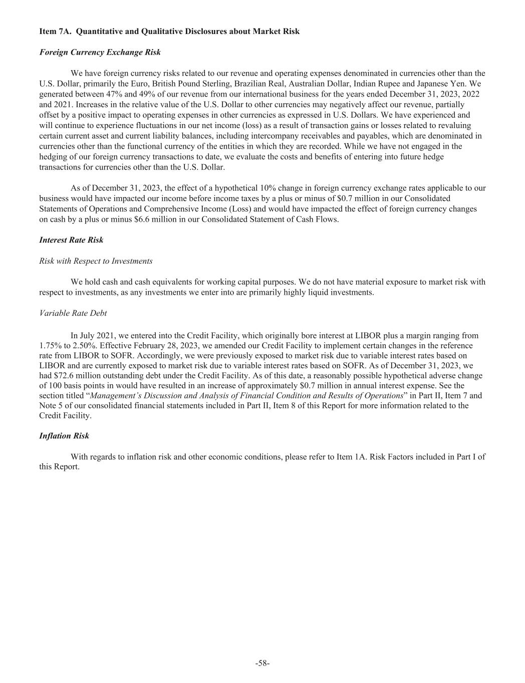 Item 7A. Quantitative and Qualitative Disclosures about Market Risk Foreign Currency Exchange Risk We have foreign currency risks related to our revenue and operating expenses denominated in currencies other than the U.S. Dollar, primarily the Euro, British Pound Sterling, Brazilian Real, Australian Dollar, Indian Rupee and Japanese Yen. We generated between 47% and 49% of our revenue from our international business for the years ended December 31, 2023, 2022 and 2021. Increases in the relative value of the U.S. Dollar to other currencies may negatively affect our revenue, partially offset by a positive impact to operating expenses in other currencies as expressed in U.S. Dollars. We have experienced and will continue to experience fluctuations in our net income (loss) as a result of transaction gains or losses related to revaluing certain current asset and current liability balances, including intercompany receivables and payables, which are denominated in currencies other than the functional currency of the entities in which they are recorded. While we have not engaged in the hedging of our foreign currency transactions to date, we evaluate the costs and benefits of entering into future hedge transactions for currencies other than the U.S. Dollar. As of December 31, 2023, the effect of a hypothetical 10% change in foreign currency exchange rates applicable to our business would have impacted our income before income taxes by a plus or minus of $0.7 million in our Consolidated Statements of Operations and Comprehensive Income (Loss) and would have impacted the effect of foreign currency changes on cash by a plus or minus $6.6 million in our Consolidated Statement of Cash Flows. Interest Rate Risk Risk with Respect to Investments We hold cash and cash equivalents for working capital purposes. We do not have material exposure to market risk with respect to investments, as any investments we enter into are primarily highly liquid investments. Variable Rate Debt In July 2021, we entered into the Credit Facility, which originally bore interest at LIBOR plus a margin ranging from 1.75% to 2.50%. Effective February 28, 2023, we amended our Credit Facility to implement certain changes in the reference rate from LIBOR to SOFR. Accordingly, we were previously exposed to market risk due to variable interest rates based on LIBOR and are currently exposed to market risk due to variable interest rates based on SOFR. As of December 31, 2023, we had $72.6 million outstanding debt under the Credit Facility. As of this date, a reasonably possible hypothetical adverse change of 100 basis points in would have resulted in an increase of approximately $0.7 million in annual interest expense. See the section titled “Management’s Discussion and Analysis of Financial Condition and Results of Operations” in Part II, Item 7 and Note 5 of our consolidated financial statements included in Part II, Item 8 of this Report for more information related to the Credit Facility. Inflation Risk With regards to inflation risk and other economic conditions, please refer to Item 1A. Risk Factors included in Part I of this Report. -58-