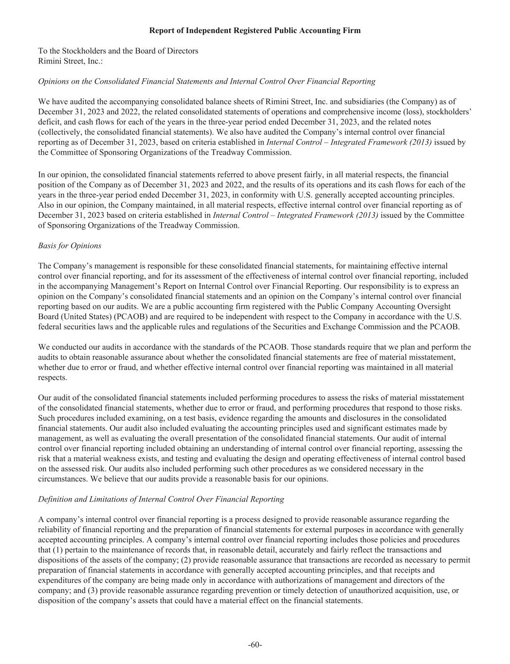 Report of Independent Registered Public Accounting Firm To the Stockholders and the Board of Directors Rimini Street, Inc.: Opinions on the Consolidated Financial Statements and Internal Control Over Financial Reporting We have audited the accompanying consolidated balance sheets of Rimini Street, Inc. and subsidiaries (the Company) as of December 31, 2023 and 2022, the related consolidated statements of operations and comprehensive income (loss), stockholders’ deficit, and cash flows for each of the years in the three-year period ended December 31, 2023, and the related notes (collectively, the consolidated financial statements). We also have audited the Company’s internal control over financial reporting as of December 31, 2023, based on criteria established in Internal Control – Integrated Framework (2013) issued by the Committee of Sponsoring Organizations of the Treadway Commission. In our opinion, the consolidated financial statements referred to above present fairly, in all material respects, the financial position of the Company as of December 31, 2023 and 2022, and the results of its operations and its cash flows for each of the years in the three-year period ended December 31, 2023, in conformity with U.S. generally accepted accounting principles. Also in our opinion, the Company maintained, in all material respects, effective internal control over financial reporting as of December 31, 2023 based on criteria established in Internal Control – Integrated Framework (2013) issued by the Committee of Sponsoring Organizations of the Treadway Commission. Basis for Opinions The Company’s management is responsible for these consolidated financial statements, for maintaining effective internal control over financial reporting, and for its assessment of the effectiveness of internal control over financial reporting, included in the accompanying Management’s Report on Internal Control over Financial Reporting. Our responsibility is to express an opinion on the Company’s consolidated financial statements and an opinion on the Company’s internal control over financial reporting based on our audits. We are a public accounting firm registered with the Public Company Accounting Oversight Board (United States) (PCAOB) and are required to be independent with respect to the Company in accordance with the U.S. federal securities laws and the applicable rules and regulations of the Securities and Exchange Commission and the PCAOB. We conducted our audits in accordance with the standards of the PCAOB. Those standards require that we plan and perform the audits to obtain reasonable assurance about whether the consolidated financial statements are free of material misstatement, whether due to error or fraud, and whether effective internal control over financial reporting was maintained in all material respects. Our audit of the consolidated financial statements included performing procedures to assess the risks of material misstatement of the consolidated financial statements, whether due to error or fraud, and performing procedures that respond to those risks. Such procedures included examining, on a test basis, evidence regarding the amounts and disclosures in the consolidated financial statements. Our audit also included evaluating the accounting principles used and significant estimates made by management, as well as evaluating the overall presentation of the consolidated financial statements. Our audit of internal control over financial reporting included obtaining an understanding of internal control over financial reporting, assessing the risk that a material weakness exists, and testing and evaluating the design and operating effectiveness of internal control based on the assessed risk. Our audits also included performing such other procedures as we considered necessary in the circumstances. We believe that our audits provide a reasonable basis for our opinions. Definition and Limitations of Internal Control Over Financial Reporting A company’s internal control over financial reporting is a process designed to provide reasonable assurance regarding the reliability of financial reporting and the preparation of financial statements for external purposes in accordance with generally accepted accounting principles. A company’s internal control over financial reporting includes those policies and procedures that (1) pertain to the maintenance of records that, in reasonable detail, accurately and fairly reflect the transactions and dispositions of the assets of the company; (2) provide reasonable assurance that transactions are recorded as necessary to permit preparation of financial statements in accordance with generally accepted accounting principles, and that receipts and expenditures of the company are being made only in accordance with authorizations of management and directors of the company; and (3) provide reasonable assurance regarding prevention or timely detection of unauthorized acquisition, use, or disposition of the company’s assets that could have a material effect on the financial statements. -60-