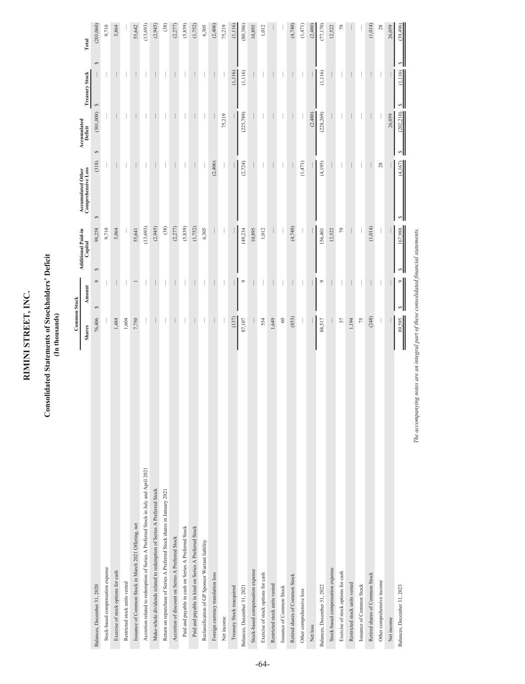 R IM IN I S T R E E T , I N C . C on so lid at ed S ta te m en ts o f S to ck ho ld er s’ D ef ic it (I n th ou sa nd s) C om m on S to ck A dd iti on al P ai d- in C ap ita l A cc um ul at ed O th er C om pr eh en si ve L os s A cc um ul at ed D ef ic it T re as ur y St oc k T ot al Sh ar es A m ou nt B al an ce s, D ec em be r 3 1, 2 02 0 76 ,4 06 $ 8 $ 98 ,2 58 $ (3 18 ) $ (3 01 ,0 08 ) $ — $ (2 03 ,0 60 ) St oc k- ba se d co m pe ns at io n ex pe ns e — — 9, 71 0 — — — 9, 71 0 Ex er ci se o f s to ck o pt io ns fo r c as h 1, 48 4 — 5, 86 4 — — — 5, 86 4 R es tri ct ed st oc k un its v es te d 1, 60 4 — — — — — — Is su an ce o f C om m on S to ck in M ar ch 2 02 1 O ff er in g, n et 7, 75 0 1 55 ,6 41 — — — 55 ,6 42 A cc re tio n re la te d to re de m pt io n of S er ie s A P re fe rr ed S to ck in Ju ly a nd A pr il 20 21 — — (1 3, 69 3) — — — (1 3, 69 3) M ak e- w ho le d iv id en ds re la te d to re de m pt io n of S er ie s A P re fe rr ed S to ck — — (2 ,9 45 ) — — — (2 ,9 45 ) R et ur n on re pu rc ha se o f S er ie s A P re fe rr ed S to ck sh ar es in Ja nu ar y 20 21 — — (3 8) — — — (3 8) A cc re tio n of d is co un t o n Se rie s A P re fe rr ed S to ck — — (2 ,2 77 ) — — — (2 ,2 77 ) Pa id a nd p ay ab le in c as h on S er ie s A P re fe rr ed S to ck — — (5 ,8 39 ) — — — (5 ,8 39 ) Pa id a nd p ay ab le in k in d on S er ie s A P re fe rr ed S to ck — — (1 ,7 52 ) — — — (1 ,7 52 ) R ec la ss ifi ca tio n of G P Sp on so r W ar ra nt li ab ili ty — — 6, 30 5 — — — 6, 30 5 Fo re ig n cu rr en cy tr an sl at io n lo ss — — — (2 ,4 06 ) — — (2 ,4 06 ) N et in co m e — — — — 75 ,2 19 — 75 ,2 19 T re as ur y St oc k re ac qu ire d (1 37 ) — — — — (1 ,1 16 ) (1 ,1 16 ) B al an ce s, D ec em be r 3 1, 2 02 1 87 ,1 07 9 14 9, 23 4 (2 ,7 24 ) (2 25 ,7 89 ) (1 ,1 16 ) (8 0, 38 6) St oc k- ba se d co m pe ns at io n ex pe ns e — — 10 ,8 95 — — — 10 ,8 95 Ex er ci se o f s to ck o pt io ns fo r c as h 55 4 — 1, 01 2 — — — 1, 01 2 R es tri ct ed st oc k un its v es te d 1, 64 9 — — — — — — Is su an ce o f C om m on S to ck 60 — — — — — — R et ire d sh ar es o f C om m on S to ck (8 53 ) — (4 ,7 40 ) — — — (4 ,7 40 ) O th er c om pr eh en si ve lo ss — — — (1 ,4 71 ) — — (1 ,4 71 ) N et lo ss — — — — (2 ,4 80 ) — (2 ,4 80 ) B al an ce s, D ec em be r 3 1, 2 02 2 88 ,5 17 9 15 6, 40 1 (4 ,1 95 ) (2 28 ,2 69 ) (1 ,1 16 ) (7 7, 17 0) St oc k- ba se d co m pe ns at io n ex pe ns e — — 12 ,5 22 — — — 12 ,5 22 Ex er ci se o f s to ck o pt io ns fo r c as h 57 — 79 — — — 79 R es tri ct ed st oc k un its v es te d 1, 19 4 — — — — — — Is su an ce o f C om m on S to ck 75 — — — — — — R et ire d sh ar es o f C om m on S to ck (2 48 ) — (1 ,0 14 ) — — — (1 ,0 14 ) O th er c om pr eh en si ve in co m e — — — 28 — — 28 N et in co m e — — — — 26 ,0 59 — 26 ,0 59 B al an ce s, D ec em be r 3 1, 2 02 3 89 ,5 95 $ 9 $ 16 7, 98 8 $ (4 ,1 67 ) $ (2 02 ,2 10 ) $ (1 ,1 16 ) $ (3 9, 49 6) Th e ac co m pa ny in g no te s a re a n in te gr al p ar t o f t he se c on so lid at ed fi na nc ia l s ta te m en ts . -64-