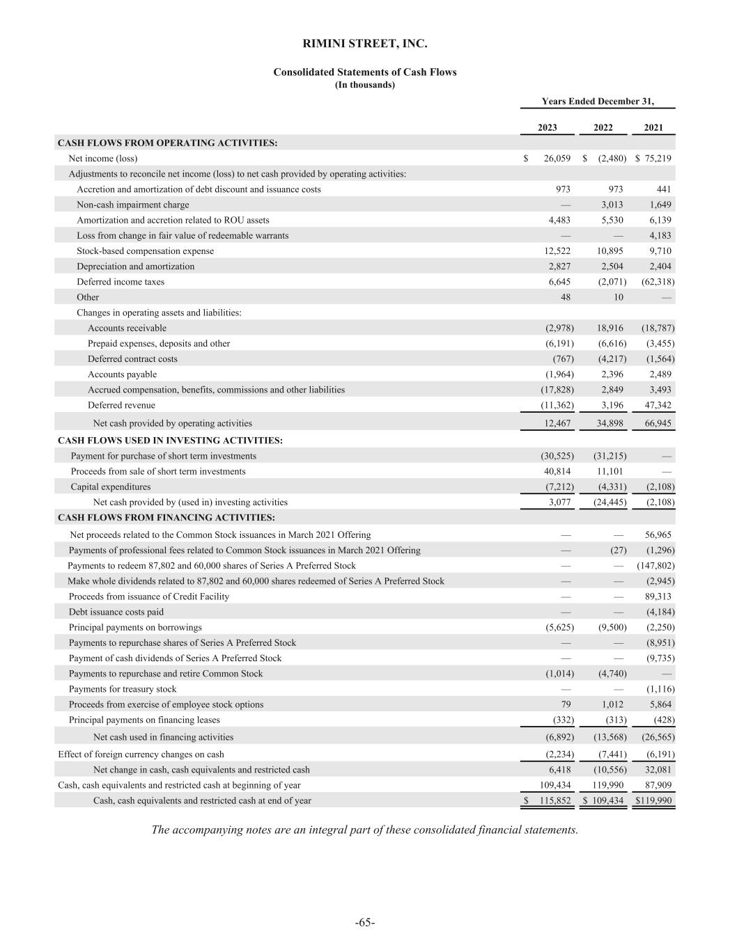 RIMINI STREET, INC. Consolidated Statements of Cash Flows (In thousands) Years Ended December 31, 2023 2022 2021 CASH FLOWS FROM OPERATING ACTIVITIES: Net income (loss) $ 26,059 $ (2,480) $ 75,219 Adjustments to reconcile net income (loss) to net cash provided by operating activities: Accretion and amortization of debt discount and issuance costs 973 973 441 Non-cash impairment charge — 3,013 1,649 Amortization and accretion related to ROU assets 4,483 5,530 6,139 Loss from change in fair value of redeemable warrants — — 4,183 Stock-based compensation expense 12,522 10,895 9,710 Depreciation and amortization 2,827 2,504 2,404 Deferred income taxes 6,645 (2,071) (62,318) Other 48 10 — Changes in operating assets and liabilities: Accounts receivable (2,978) 18,916 (18,787) Prepaid expenses, deposits and other (6,191) (6,616) (3,455) Deferred contract costs (767) (4,217) (1,564) Accounts payable (1,964) 2,396 2,489 Accrued compensation, benefits, commissions and other liabilities (17,828) 2,849 3,493 Deferred revenue (11,362) 3,196 47,342 Net cash provided by operating activities 12,467 34,898 66,945 CASH FLOWS USED IN INVESTING ACTIVITIES: Payment for purchase of short term investments (30,525) (31,215) — Proceeds from sale of short term investments 40,814 11,101 — Capital expenditures (7,212) (4,331) (2,108) Net cash provided by (used in) investing activities 3,077 (24,445) (2,108) CASH FLOWS FROM FINANCING ACTIVITIES: Net proceeds related to the Common Stock issuances in March 2021 Offering — — 56,965 Payments of professional fees related to Common Stock issuances in March 2021 Offering — (27) (1,296) Payments to redeem 87,802 and 60,000 shares of Series A Preferred Stock — — (147,802) Make whole dividends related to 87,802 and 60,000 shares redeemed of Series A Preferred Stock — — (2,945) Proceeds from issuance of Credit Facility — — 89,313 Debt issuance costs paid — — (4,184) Principal payments on borrowings (5,625) (9,500) (2,250) Payments to repurchase shares of Series A Preferred Stock — — (8,951) Payment of cash dividends of Series A Preferred Stock — — (9,735) Payments to repurchase and retire Common Stock (1,014) (4,740) — Payments for treasury stock — — (1,116) Proceeds from exercise of employee stock options 79 1,012 5,864 Principal payments on financing leases (332) (313) (428) Net cash used in financing activities (6,892) (13,568) (26,565) Effect of foreign currency changes on cash (2,234) (7,441) (6,191) Net change in cash, cash equivalents and restricted cash 6,418 (10,556) 32,081 Cash, cash equivalents and restricted cash at beginning of year 109,434 119,990 87,909 Cash, cash equivalents and restricted cash at end of year $ 115,852 $ 109,434 $ 119,990 The accompanying notes are an integral part of these consolidated financial statements. -65-
