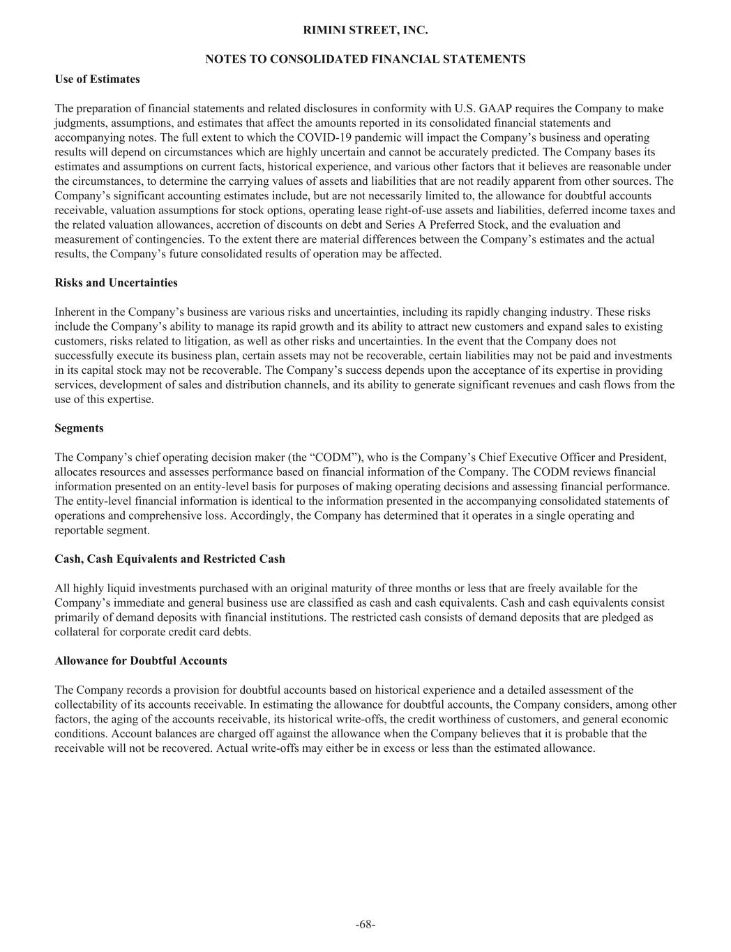 Use of Estimates The preparation of financial statements and related disclosures in conformity with U.S. GAAP requires the Company to make judgments, assumptions, and estimates that affect the amounts reported in its consolidated financial statements and accompanying notes. The full extent to which the COVID-19 pandemic will impact the Company’s business and operating results will depend on circumstances which are highly uncertain and cannot be accurately predicted. The Company bases its estimates and assumptions on current facts, historical experience, and various other factors that it believes are reasonable under the circumstances, to determine the carrying values of assets and liabilities that are not readily apparent from other sources. The Company’s significant accounting estimates include, but are not necessarily limited to, the allowance for doubtful accounts receivable, valuation assumptions for stock options, operating lease right-of-use assets and liabilities, deferred income taxes and the related valuation allowances, accretion of discounts on debt and Series A Preferred Stock, and the evaluation and measurement of contingencies. To the extent there are material differences between the Company’s estimates and the actual results, the Company’s future consolidated results of operation may be affected. Risks and Uncertainties Inherent in the Company’s business are various risks and uncertainties, including its rapidly changing industry. These risks include the Company’s ability to manage its rapid growth and its ability to attract new customers and expand sales to existing customers, risks related to litigation, as well as other risks and uncertainties. In the event that the Company does not successfully execute its business plan, certain assets may not be recoverable, certain liabilities may not be paid and investments in its capital stock may not be recoverable. The Company’s success depends upon the acceptance of its expertise in providing services, development of sales and distribution channels, and its ability to generate significant revenues and cash flows from the use of this expertise. Segments The Company’s chief operating decision maker (the “CODM”), who is the Company’s Chief Executive Officer and President, allocates resources and assesses performance based on financial information of the Company. The CODM reviews financial information presented on an entity-level basis for purposes of making operating decisions and assessing financial performance. The entity-level financial information is identical to the information presented in the accompanying consolidated statements of operations and comprehensive loss. Accordingly, the Company has determined that it operates in a single operating and reportable segment. Cash, Cash Equivalents and Restricted Cash All highly liquid investments purchased with an original maturity of three months or less that are freely available for the Company’s immediate and general business use are classified as cash and cash equivalents. Cash and cash equivalents consist primarily of demand deposits with financial institutions. The restricted cash consists of demand deposits that are pledged as collateral for corporate credit card debts. Allowance for Doubtful Accounts The Company records a provision for doubtful accounts based on historical experience and a detailed assessment of the collectability of its accounts receivable. In estimating the allowance for doubtful accounts, the Company considers, among other factors, the aging of the accounts receivable, its historical write-offs, the credit worthiness of customers, and general economic conditions. Account balances are charged off against the allowance when the Company believes that it is probable that the receivable will not be recovered. Actual write-offs may either be in excess or less than the estimated allowance. RIMINI STREET, INC. NOTES TO CONSOLIDATED FINANCIAL STATEMENTS -68-