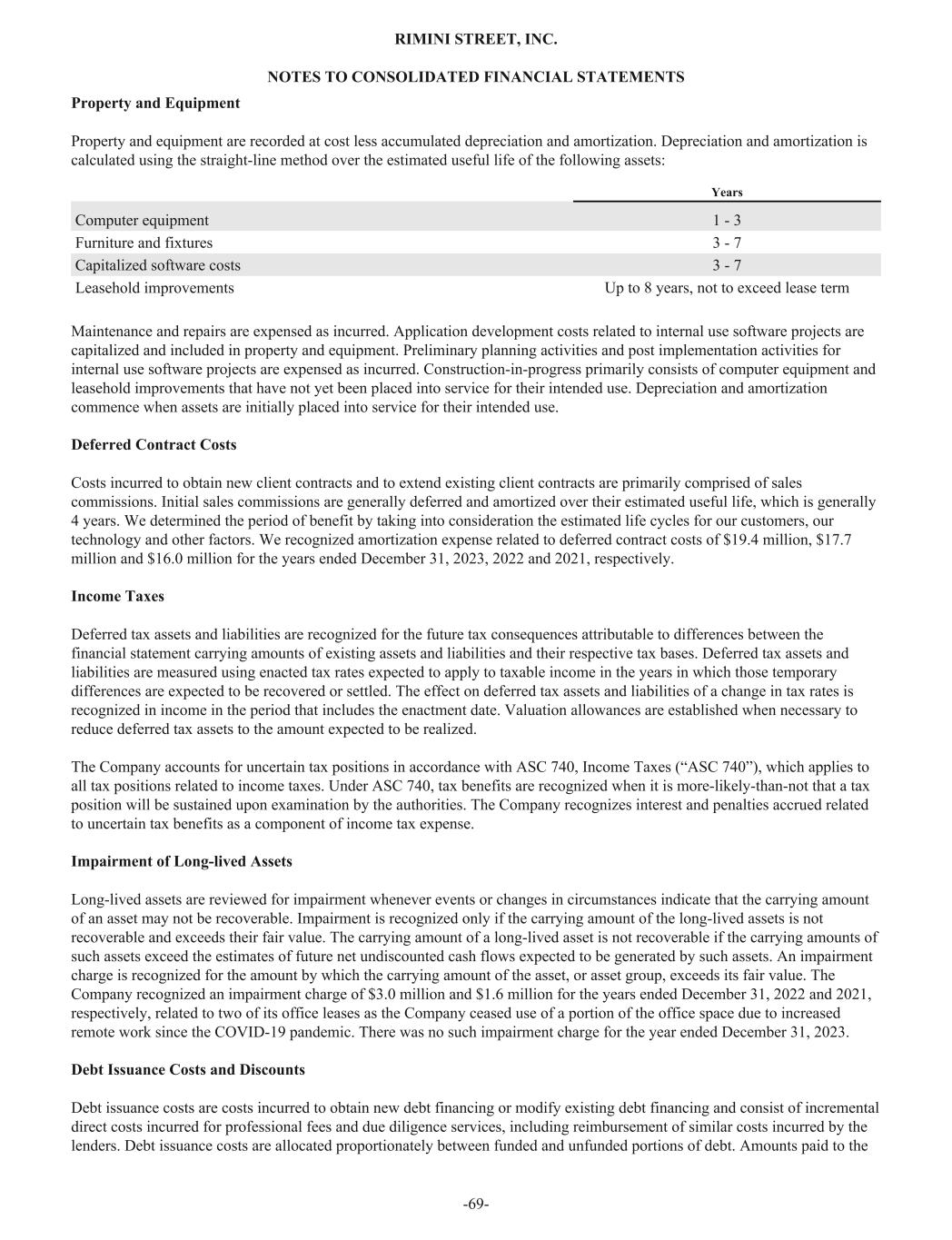 Property and Equipment Property and equipment are recorded at cost less accumulated depreciation and amortization. Depreciation and amortization is calculated using the straight-line method over the estimated useful life of the following assets: Years Computer equipment 1 - 3 Furniture and fixtures 3 - 7 Capitalized software costs 3 - 7 Leasehold improvements Up to 8 years, not to exceed lease term Maintenance and repairs are expensed as incurred. Application development costs related to internal use software projects are capitalized and included in property and equipment. Preliminary planning activities and post implementation activities for internal use software projects are expensed as incurred. Construction-in-progress primarily consists of computer equipment and leasehold improvements that have not yet been placed into service for their intended use. Depreciation and amortization commence when assets are initially placed into service for their intended use. Deferred Contract Costs Costs incurred to obtain new client contracts and to extend existing client contracts are primarily comprised of sales commissions. Initial sales commissions are generally deferred and amortized over their estimated useful life, which is generally 4 years. We determined the period of benefit by taking into consideration the estimated life cycles for our customers, our technology and other factors. We recognized amortization expense related to deferred contract costs of $19.4 million, $17.7 million and $16.0 million for the years ended December 31, 2023, 2022 and 2021, respectively. Income Taxes Deferred tax assets and liabilities are recognized for the future tax consequences attributable to differences between the financial statement carrying amounts of existing assets and liabilities and their respective tax bases. Deferred tax assets and liabilities are measured using enacted tax rates expected to apply to taxable income in the years in which those temporary differences are expected to be recovered or settled. The effect on deferred tax assets and liabilities of a change in tax rates is recognized in income in the period that includes the enactment date. Valuation allowances are established when necessary to reduce deferred tax assets to the amount expected to be realized. The Company accounts for uncertain tax positions in accordance with ASC 740, Income Taxes (“ASC 740”), which applies to all tax positions related to income taxes. Under ASC 740, tax benefits are recognized when it is more-likely-than-not that a tax position will be sustained upon examination by the authorities. The Company recognizes interest and penalties accrued related to uncertain tax benefits as a component of income tax expense. Impairment of Long-lived Assets Long-lived assets are reviewed for impairment whenever events or changes in circumstances indicate that the carrying amount of an asset may not be recoverable. Impairment is recognized only if the carrying amount of the long-lived assets is not recoverable and exceeds their fair value. The carrying amount of a long-lived asset is not recoverable if the carrying amounts of such assets exceed the estimates of future net undiscounted cash flows expected to be generated by such assets. An impairment charge is recognized for the amount by which the carrying amount of the asset, or asset group, exceeds its fair value. The Company recognized an impairment charge of $3.0 million and $1.6 million for the years ended December 31, 2022 and 2021, respectively, related to two of its office leases as the Company ceased use of a portion of the office space due to increased remote work since the COVID-19 pandemic. There was no such impairment charge for the year ended December 31, 2023. Debt Issuance Costs and Discounts Debt issuance costs are costs incurred to obtain new debt financing or modify existing debt financing and consist of incremental direct costs incurred for professional fees and due diligence services, including reimbursement of similar costs incurred by the lenders. Debt issuance costs are allocated proportionately between funded and unfunded portions of debt. Amounts paid to the RIMINI STREET, INC. NOTES TO CONSOLIDATED FINANCIAL STATEMENTS -69-