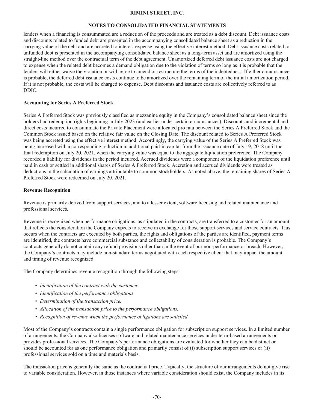 lenders when a financing is consummated are a reduction of the proceeds and are treated as a debt discount. Debt issuance costs and discounts related to funded debt are presented in the accompanying consolidated balance sheet as a reduction in the carrying value of the debt and are accreted to interest expense using the effective interest method. Debt issuance costs related to unfunded debt is presented in the accompanying consolidated balance sheet as a long-term asset and are amortized using the straight-line method over the contractual term of the debt agreement. Unamortized deferred debt issuance costs are not charged to expense when the related debt becomes a demand obligation due to the violation of terms so long as it is probable that the lenders will either waive the violation or will agree to amend or restructure the terms of the indebtedness. If either circumstance is probable, the deferred debt issuance costs continue to be amortized over the remaining term of the initial amortization period. If it is not probable, the costs will be charged to expense. Debt discounts and issuance costs are collectively referred to as DDIC. Accounting for Series A Preferred Stock Series A Preferred Stock was previously classified as mezzanine equity in the Company’s consolidated balance sheet since the holders had redemption rights beginning in July 2023 (and earlier under certain circumstances). Discounts and incremental and direct costs incurred to consummate the Private Placement were allocated pro rata between the Series A Preferred Stock and the Common Stock issued based on the relative fair value on the Closing Date. The discount related to Series A Preferred Stock was being accreted using the effective interest method. Accordingly, the carrying value of the Series A Preferred Stock was being increased with a corresponding reduction in additional paid-in capital from the issuance date of July 19, 2018 until the final redemption on July 20, 2021, when the carrying value was equal to the aggregate liquidation preference. The Company recorded a liability for dividends in the period incurred. Accrued dividends were a component of the liquidation preference until paid in cash or settled in additional shares of Series A Preferred Stock. Accretion and accrued dividends were treated as deductions in the calculation of earnings attributable to common stockholders. As noted above, the remaining shares of Series A Preferred Stock were redeemed on July 20, 2021. Revenue Recognition Revenue is primarily derived from support services, and to a lesser extent, software licensing and related maintenance and professional services. Revenue is recognized when performance obligations, as stipulated in the contracts, are transferred to a customer for an amount that reflects the consideration the Company expects to receive in exchange for those support services and service contracts. This occurs when the contracts are executed by both parties, the rights and obligations of the parties are identified, payment terms are identified, the contracts have commercial substance and collectability of consideration is probable. The Company’s contracts generally do not contain any refund provisions other than in the event of our non-performance or breach. However, the Company’s contracts may include non-standard terms negotiated with each respective client that may impact the amount and timing of revenue recognized. The Company determines revenue recognition through the following steps: • Identification of the contract with the customer. • Identification of the performance obligations. • Determination of the transaction price. • Allocation of the transaction price to the performance obligations. • Recognition of revenue when the performance obligations are satisfied. Most of the Company’s contracts contain a single performance obligation for subscription support services. In a limited number of arrangements, the Company also licenses software and related maintenance services under term-based arrangements or provides professional services. The Company’s performance obligations are evaluated for whether they can be distinct or should be accounted for as one performance obligation and primarily consist of (i) subscription support services or (ii) professional services sold on a time and materials basis. The transaction price is generally the same as the contractual price. Typically, the structure of our arrangements do not give rise to variable consideration. However, in those instances where variable consideration should exist, the Company includes in its RIMINI STREET, INC. NOTES TO CONSOLIDATED FINANCIAL STATEMENTS -70-