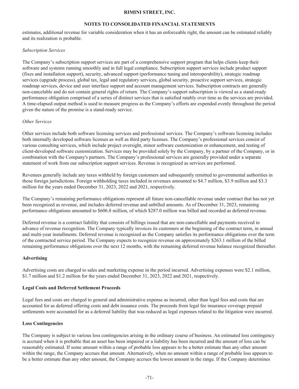 estimates, additional revenue for variable consideration when it has an enforceable right, the amount can be estimated reliably and its realization is probable. Subscription Services The Company’s subscription support services are part of a comprehensive support program that helps clients keep their software and systems running smoothly and in full legal compliance. Subscription support services include product support (fixes and installation support), security, advanced support (performance tuning and interoperability), strategic roadmap services (upgrade process), global tax, legal and regulatory services, global security, proactive support services, strategic roadmap services, device and user interface support and account management services. Subscription contracts are generally non-cancelable and do not contain general rights of return. The Company’s support subscription is viewed as a stand-ready performance obligation comprised of a series of distinct services that is satisfied ratably over time as the services are provided. A time-elapsed output method is used to measure progress as the Company’s efforts are expended evenly throughout the period given the nature of the promise is a stand-ready service. Other Services Other services include both software licensing services and professional services. The Company’s software licensing includes both internally developed software licenses as well as third party licenses. The Company’s professional services consist of various consulting services, which include project oversight, minor software customization or enhancement, and testing of client-developed software customization. Services may be provided solely by the Company, by a partner of the Company, or in combination with the Company's partners. The Company’s professional services are generally provided under a separate statement of work from our subscription support services. Revenue is recognized as services are performed. Revenues generally include any taxes withheld by foreign customers and subsequently remitted to governmental authorities in those foreign jurisdictions. Foreign withholding taxes included in revenues amounted to $4.7 million, $3.9 million and $3.3 million for the years ended December 31, 2023, 2022 and 2021, respectively. The Company’s remaining performance obligations represent all future non-cancellable revenue under contract that has not yet been recognized as revenue, and includes deferred revenue and unbilled amounts. As of December 31, 2023, remaining performance obligations amounted to $606.8 million, of which $287.0 million was billed and recorded as deferred revenue. Deferred revenue is a contract liability that consists of billings issued that are non-cancellable and payments received in advance of revenue recognition. The Company typically invoices its customers at the beginning of the contract term, in annual and multi-year installments. Deferred revenue is recognized as the Company satisfies its performance obligations over the term of the contracted service period. The Company expects to recognize revenue on approximately $263.1 million of the billed remaining performance obligations over the next 12 months, with the remaining deferred revenue balance recognized thereafter. Advertising Advertising costs are charged to sales and marketing expense in the period incurred. Advertising expenses were $2.1 million, $1.7 million and $1.2 million for the years ended December 31, 2023, 2022 and 2021, respectively. Legal Costs and Deferred Settlement Proceeds Legal fees and costs are charged to general and administrative expense as incurred, other than legal fees and costs that are accounted for as deferred offering costs and debt issuance costs. The proceeds from legal fee insurance coverage prepaid settlements were accounted for as a deferred liability that was reduced as legal expenses related to the litigation were incurred. Loss Contingencies The Company is subject to various loss contingencies arising in the ordinary course of business. An estimated loss contingency is accrued when it is probable that an asset has been impaired or a liability has been incurred and the amount of loss can be reasonably estimated. If some amount within a range of probable loss appears to be a better estimate than any other amount within the range, the Company accrues that amount. Alternatively, when no amount within a range of probable loss appears to be a better estimate than any other amount, the Company accrues the lowest amount in the range. If the Company determines RIMINI STREET, INC. NOTES TO CONSOLIDATED FINANCIAL STATEMENTS -71-