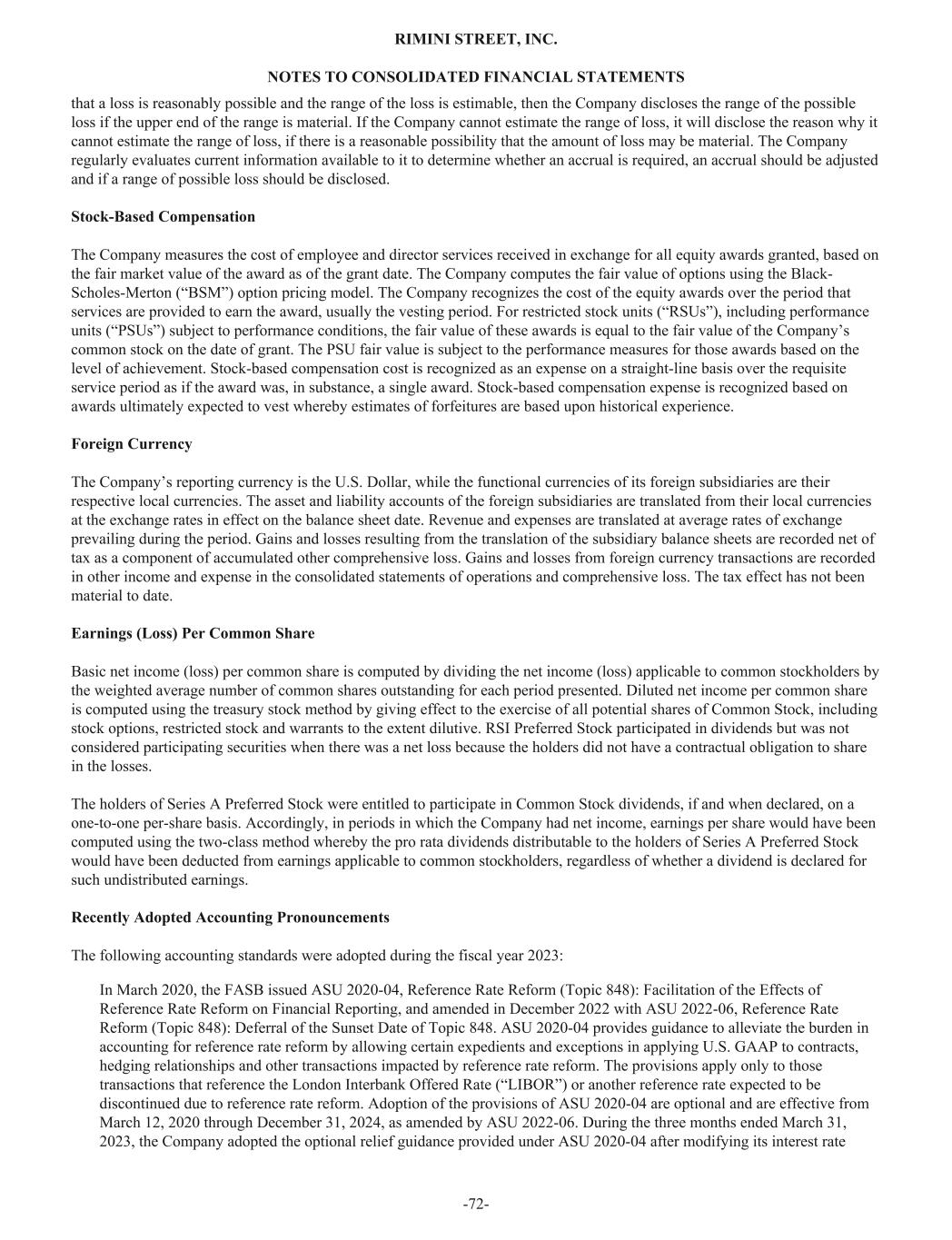 that a loss is reasonably possible and the range of the loss is estimable, then the Company discloses the range of the possible loss if the upper end of the range is material. If the Company cannot estimate the range of loss, it will disclose the reason why it cannot estimate the range of loss, if there is a reasonable possibility that the amount of loss may be material. The Company regularly evaluates current information available to it to determine whether an accrual is required, an accrual should be adjusted and if a range of possible loss should be disclosed. Stock-Based Compensation The Company measures the cost of employee and director services received in exchange for all equity awards granted, based on the fair market value of the award as of the grant date. The Company computes the fair value of options using the Black- Scholes-Merton (“BSM”) option pricing model. The Company recognizes the cost of the equity awards over the period that services are provided to earn the award, usually the vesting period. For restricted stock units (“RSUs”), including performance units (“PSUs”) subject to performance conditions, the fair value of these awards is equal to the fair value of the Company’s common stock on the date of grant. The PSU fair value is subject to the performance measures for those awards based on the level of achievement. Stock-based compensation cost is recognized as an expense on a straight-line basis over the requisite service period as if the award was, in substance, a single award. Stock-based compensation expense is recognized based on awards ultimately expected to vest whereby estimates of forfeitures are based upon historical experience. Foreign Currency The Company’s reporting currency is the U.S. Dollar, while the functional currencies of its foreign subsidiaries are their respective local currencies. The asset and liability accounts of the foreign subsidiaries are translated from their local currencies at the exchange rates in effect on the balance sheet date. Revenue and expenses are translated at average rates of exchange prevailing during the period. Gains and losses resulting from the translation of the subsidiary balance sheets are recorded net of tax as a component of accumulated other comprehensive loss. Gains and losses from foreign currency transactions are recorded in other income and expense in the consolidated statements of operations and comprehensive loss. The tax effect has not been material to date. Earnings (Loss) Per Common Share Basic net income (loss) per common share is computed by dividing the net income (loss) applicable to common stockholders by the weighted average number of common shares outstanding for each period presented. Diluted net income per common share is computed using the treasury stock method by giving effect to the exercise of all potential shares of Common Stock, including stock options, restricted stock and warrants to the extent dilutive. RSI Preferred Stock participated in dividends but was not considered participating securities when there was a net loss because the holders did not have a contractual obligation to share in the losses. The holders of Series A Preferred Stock were entitled to participate in Common Stock dividends, if and when declared, on a one-to-one per-share basis. Accordingly, in periods in which the Company had net income, earnings per share would have been computed using the two-class method whereby the pro rata dividends distributable to the holders of Series A Preferred Stock would have been deducted from earnings applicable to common stockholders, regardless of whether a dividend is declared for such undistributed earnings. Recently Adopted Accounting Pronouncements The following accounting standards were adopted during the fiscal year 2023: In March 2020, the FASB issued ASU 2020-04, Reference Rate Reform (Topic 848): Facilitation of the Effects of Reference Rate Reform on Financial Reporting, and amended in December 2022 with ASU 2022-06, Reference Rate Reform (Topic 848): Deferral of the Sunset Date of Topic 848. ASU 2020-04 provides guidance to alleviate the burden in accounting for reference rate reform by allowing certain expedients and exceptions in applying U.S. GAAP to contracts, hedging relationships and other transactions impacted by reference rate reform. The provisions apply only to those transactions that reference the London Interbank Offered Rate (“LIBOR”) or another reference rate expected to be discontinued due to reference rate reform. Adoption of the provisions of ASU 2020-04 are optional and are effective from March 12, 2020 through December 31, 2024, as amended by ASU 2022-06. During the three months ended March 31, 2023, the Company adopted the optional relief guidance provided under ASU 2020-04 after modifying its interest rate RIMINI STREET, INC. NOTES TO CONSOLIDATED FINANCIAL STATEMENTS -72-