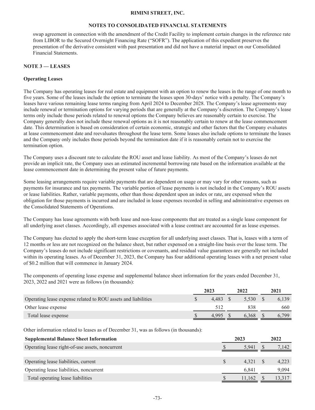 swap agreement in connection with the amendment of the Credit Facility to implement certain changes in the reference rate from LIBOR to the Secured Overnight Financing Rate (“SOFR”). The application of this expedient preserves the presentation of the derivative consistent with past presentation and did not have a material impact on our Consolidated Financial Statements. NOTE 3 — LEASES Operating Leases The Company has operating leases for real estate and equipment with an option to renew the leases in the range of one month to five years. Some of the leases include the option to terminate the leases upon 30-days’ notice with a penalty. The Company’s leases have various remaining lease terms ranging from April 2024 to December 2028. The Company’s lease agreements may include renewal or termination options for varying periods that are generally at the Company’s discretion. The Company’s lease terms only include those periods related to renewal options the Company believes are reasonably certain to exercise. The Company generally does not include these renewal options as it is not reasonably certain to renew at the lease commencement date. This determination is based on consideration of certain economic, strategic and other factors that the Company evaluates at lease commencement date and reevaluates throughout the lease term. Some leases also include options to terminate the leases and the Company only includes those periods beyond the termination date if it is reasonably certain not to exercise the termination option. The Company uses a discount rate to calculate the ROU asset and lease liability. As most of the Company’s leases do not provide an implicit rate, the Company uses an estimated incremental borrowing rate based on the information available at the lease commencement date in determining the present value of future payments. Some leasing arrangements require variable payments that are dependent on usage or may vary for other reasons, such as payments for insurance and tax payments. The variable portion of lease payments is not included in the Company’s ROU assets or lease liabilities. Rather, variable payments, other than those dependent upon an index or rate, are expensed when the obligation for those payments is incurred and are included in lease expenses recorded in selling and administrative expenses on the Consolidated Statements of Operations. The Company has lease agreements with both lease and non-lease components that are treated as a single lease component for all underlying asset classes. Accordingly, all expenses associated with a lease contract are accounted for as lease expenses. The Company has elected to apply the short-term lease exception for all underlying asset classes. That is, leases with a term of 12 months or less are not recognized on the balance sheet, but rather expensed on a straight-line basis over the lease term. The Company’s leases do not include significant restrictions or covenants, and residual value guarantees are generally not included within its operating leases. As of December 31, 2023, the Company has four additional operating leases with a net present value of $0.2 million that will commence in January 2024. The components of operating lease expense and supplemental balance sheet information for the years ended December 31, 2023, 2022 and 2021 were as follows (in thousands): 2023 2022 2021 Operating lease expense related to ROU assets and liabilities $ 4,483 $ 5,530 $ 6,139 Other lease expense 512 838 660 Total lease expense $ 4,995 $ 6,368 $ 6,799 Other information related to leases as of December 31, was as follows (in thousands): Supplemental Balance Sheet Information 2023 2022 Operating lease right-of-use assets, noncurrent $ 5,941 $ 7,142 Operating lease liabilities, current $ 4,321 $ 4,223 Operating lease liabilities, noncurrent 6,841 9,094 Total operating lease liabilities $ 11,162 $ 13,317 RIMINI STREET, INC. NOTES TO CONSOLIDATED FINANCIAL STATEMENTS -73-