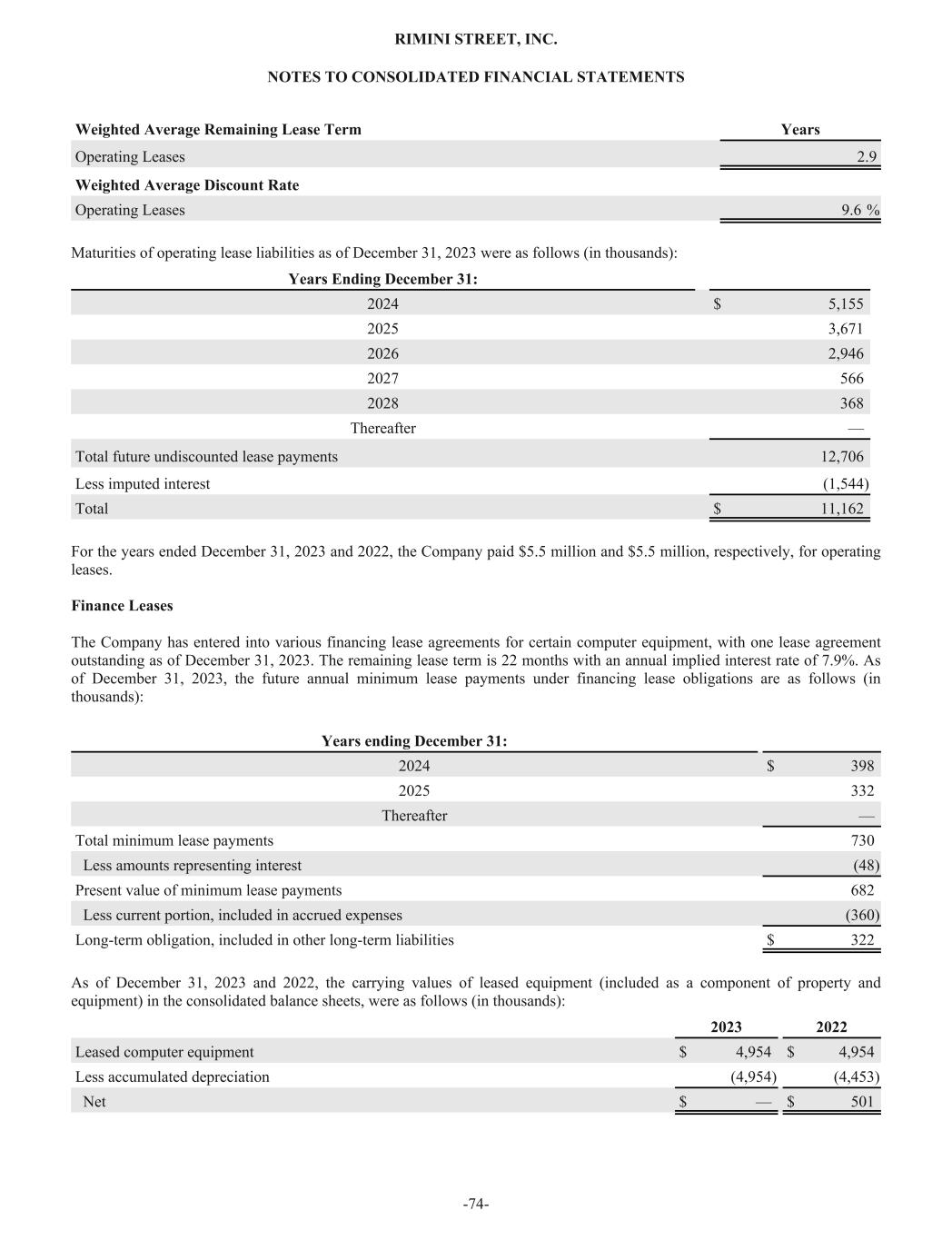 Weighted Average Remaining Lease Term Years Operating Leases 2.9 Weighted Average Discount Rate Operating Leases 9.6 % Maturities of operating lease liabilities as of December 31, 2023 were as follows (in thousands): Years Ending December 31: 2024 $ 5,155 2025 3,671 2026 2,946 2027 566 2028 368 Thereafter — Total future undiscounted lease payments 12,706 Less imputed interest (1,544) Total $ 11,162 For the years ended December 31, 2023 and 2022, the Company paid $5.5 million and $5.5 million, respectively, for operating leases. Finance Leases The Company has entered into various financing lease agreements for certain computer equipment, with one lease agreement outstanding as of December 31, 2023. The remaining lease term is 22 months with an annual implied interest rate of 7.9%. As of December 31, 2023, the future annual minimum lease payments under financing lease obligations are as follows (in thousands): Years ending December 31: 2024 $ 398 2025 332 Thereafter — Total minimum lease payments 730 Less amounts representing interest (48) Present value of minimum lease payments 682 Less current portion, included in accrued expenses (360) Long-term obligation, included in other long-term liabilities $ 322 As of December 31, 2023 and 2022, the carrying values of leased equipment (included as a component of property and equipment) in the consolidated balance sheets, were as follows (in thousands): 2023 2022 Leased computer equipment $ 4,954 $ 4,954 Less accumulated depreciation (4,954) (4,453) Net $ — $ 501 RIMINI STREET, INC. NOTES TO CONSOLIDATED FINANCIAL STATEMENTS -74-