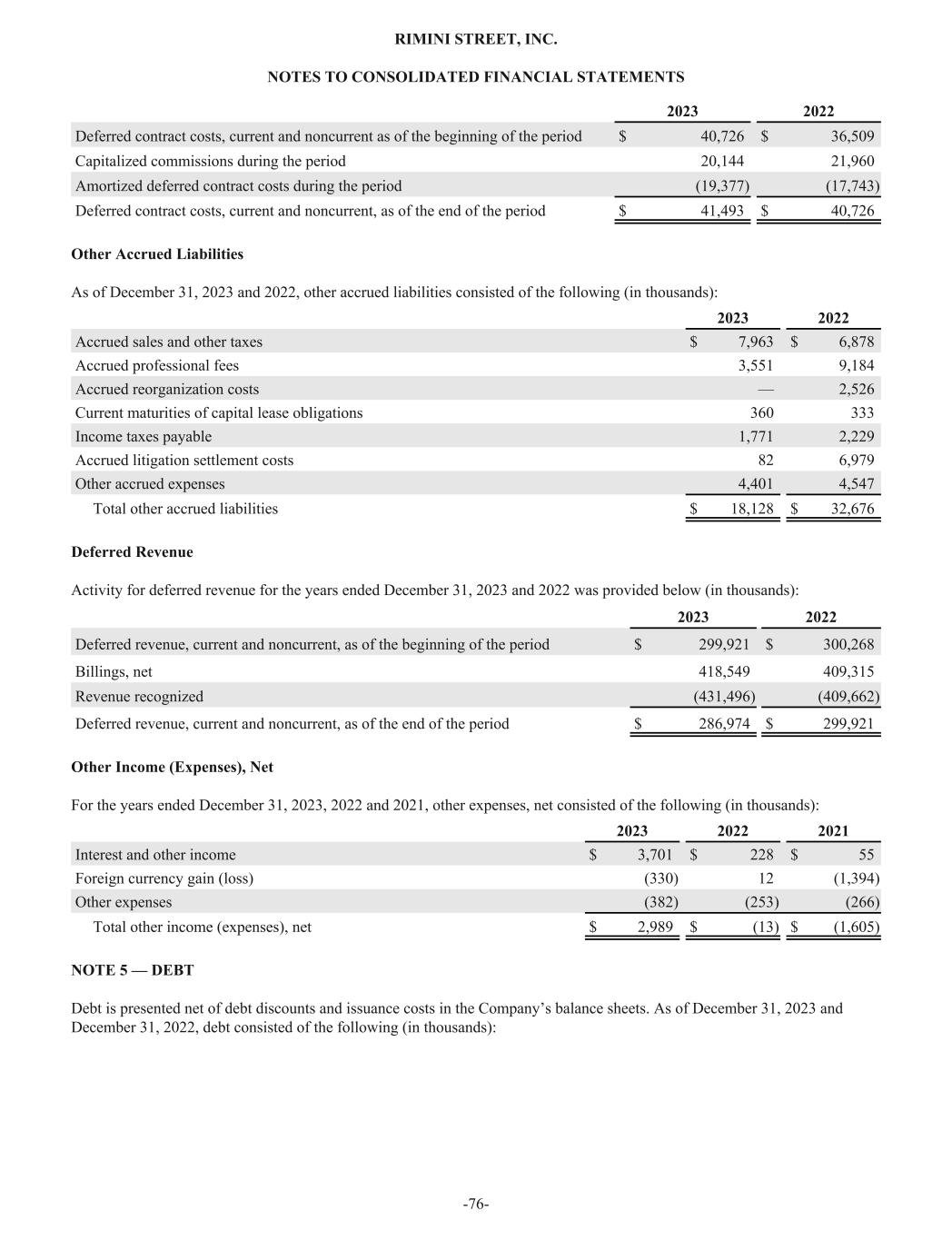 2023 2022 Deferred contract costs, current and noncurrent as of the beginning of the period $ 40,726 $ 36,509 Capitalized commissions during the period 20,144 21,960 Amortized deferred contract costs during the period (19,377) (17,743) Deferred contract costs, current and noncurrent, as of the end of the period $ 41,493 $ 40,726 Other Accrued Liabilities As of December 31, 2023 and 2022, other accrued liabilities consisted of the following (in thousands): 2023 2022 Accrued sales and other taxes $ 7,963 $ 6,878 Accrued professional fees 3,551 9,184 Accrued reorganization costs — 2,526 Current maturities of capital lease obligations 360 333 Income taxes payable 1,771 2,229 Accrued litigation settlement costs 82 6,979 Other accrued expenses 4,401 4,547 Total other accrued liabilities $ 18,128 $ 32,676 Deferred Revenue Activity for deferred revenue for the years ended December 31, 2023 and 2022 was provided below (in thousands): 2023 2022 Deferred revenue, current and noncurrent, as of the beginning of the period $ 299,921 $ 300,268 Billings, net 418,549 409,315 Revenue recognized (431,496) (409,662) Deferred revenue, current and noncurrent, as of the end of the period $ 286,974 $ 299,921 Other Income (Expenses), Net For the years ended December 31, 2023, 2022 and 2021, other expenses, net consisted of the following (in thousands): 2023 2022 2021 Interest and other income $ 3,701 $ 228 $ 55 Foreign currency gain (loss) (330) 12 (1,394) Other expenses (382) (253) (266) Total other income (expenses), net $ 2,989 $ (13) $ (1,605) NOTE 5 — DEBT Debt is presented net of debt discounts and issuance costs in the Company’s balance sheets. As of December 31, 2023 and December 31, 2022, debt consisted of the following (in thousands): RIMINI STREET, INC. NOTES TO CONSOLIDATED FINANCIAL STATEMENTS -76-