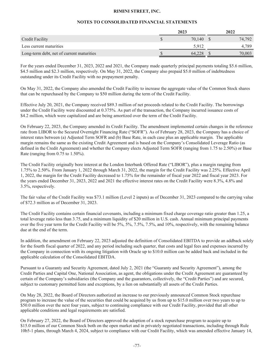 2023 2022 Credit Facility $ 70,140 $ 74,792 Less current maturities 5,912 4,789 Long-term debt, net of current maturities $ 64,228 $ 70,003 For the years ended December 31, 2023, 2022 and 2021, the Company made quarterly principal payments totaling $5.6 million, $4.5 million and $2.3 million, respectively. On May 31, 2022, the Company also prepaid $5.0 million of indebtedness outstanding under its Credit Facility with no prepayment penalty. On May 31, 2022, the Company also amended the Credit Facility to increase the aggregate value of the Common Stock shares that can be repurchased by the Company to $50 million during the term of the Credit Facility. Effective July 20, 2021, the Company received $89.3 million of net proceeds related to the Credit Facility. The borrowings under the Credit Facility were discounted at 0.375%. As part of the transaction, the Company incurred issuance costs of $4.2 million, which were capitalized and are being amortized over the term of the Credit Facility. On February 22, 2023, the Company amended its Credit Facility. The amendment implemented certain changes in the reference rate from LIBOR to the Secured Overnight Financing Rate (“SOFR”). As of February 28, 2023, the Company has a choice of interest rates between (a) Adjusted Term SOFR and (b) Base Rate, in each case plus an applicable margin. The applicable margin remains the same as the existing Credit Agreement and is based on the Company’s Consolidated Leverage Ratio (as defined in the Credit Agreement) and whether the Company elects Adjusted Term SOFR (ranging from 1.75 to 2.50%) or Base Rate (ranging from 0.75 to 1.50%). The Credit Facility originally bore interest at the London Interbank Offered Rate (“LIBOR”), plus a margin ranging from 1.75% to 2.50%. From January 1, 2022 through March 31, 2022, the margin for the Credit Facility was 2.25%. Effective April 1, 2022, the margin for the Credit Facility decreased to 1.75% for the remainder of fiscal year 2022 and fiscal year 2023. For the years ended December 31, 2023, 2022 and 2021 the effective interest rates on the Credit Facility were 8.3%, 4.8% and 3.5%, respectively. The fair value of the Credit Facility was $73.1 million (Level 2 inputs) as of December 31, 2023 compared to the carrying value of $72.3 million as of December 31, 2023. The Credit Facility contains certain financial covenants, including a minimum fixed charge coverage ratio greater than 1.25, a total leverage ratio less than 3.75, and a minimum liquidity of $20 million in U.S. cash. Annual minimum principal payments over the five year term for the Credit Facility will be 5%, 5%, 7.5%, 7.5%, and 10%, respectively, with the remaining balance due at the end of the term. In addition, the amendment on February 22, 2023 adjusted the definition of Consolidated EBITDA to provide an addback solely for the fourth fiscal quarter of 2022, and any period including such quarter, that costs and legal fees and expenses incurred by the Company in connection with its ongoing litigation with Oracle up to $10.0 million can be added back and included in the applicable calculation of the Consolidated EBITDA. Pursuant to a Guaranty and Security Agreement, dated July 2, 2021 (the “Guaranty and Security Agreement”), among the Credit Parties and Capital One, National Association, as agent, the obligations under the Credit Agreement are guaranteed by certain of the Company’s subsidiaries (the Company and the guarantors, collectively, the “Credit Parties”) and are secured, subject to customary permitted liens and exceptions, by a lien on substantially all assets of the Credit Parties. On May 28, 2022, the Board of Directors authorized an increase to our previously announced Common Stock repurchase program to increase the value of the securities that could be acquired by us from up to $15.0 million over two years to up to $50.0 million over the next four years, subject to continuing compliance with our Credit Facility, provided that all other applicable conditions and legal requirements are satisfied. On February 27, 2022, the Board of Directors approved the adoption of a stock repurchase program to acquire up to $15.0 million of our Common Stock both on the open market and in privately negotiated transactions, including through Rule 10b5-1 plans, through March 4, 2024, subject to compliance with our Credit Facility, which was amended effective January 14, RIMINI STREET, INC. NOTES TO CONSOLIDATED FINANCIAL STATEMENTS -77-