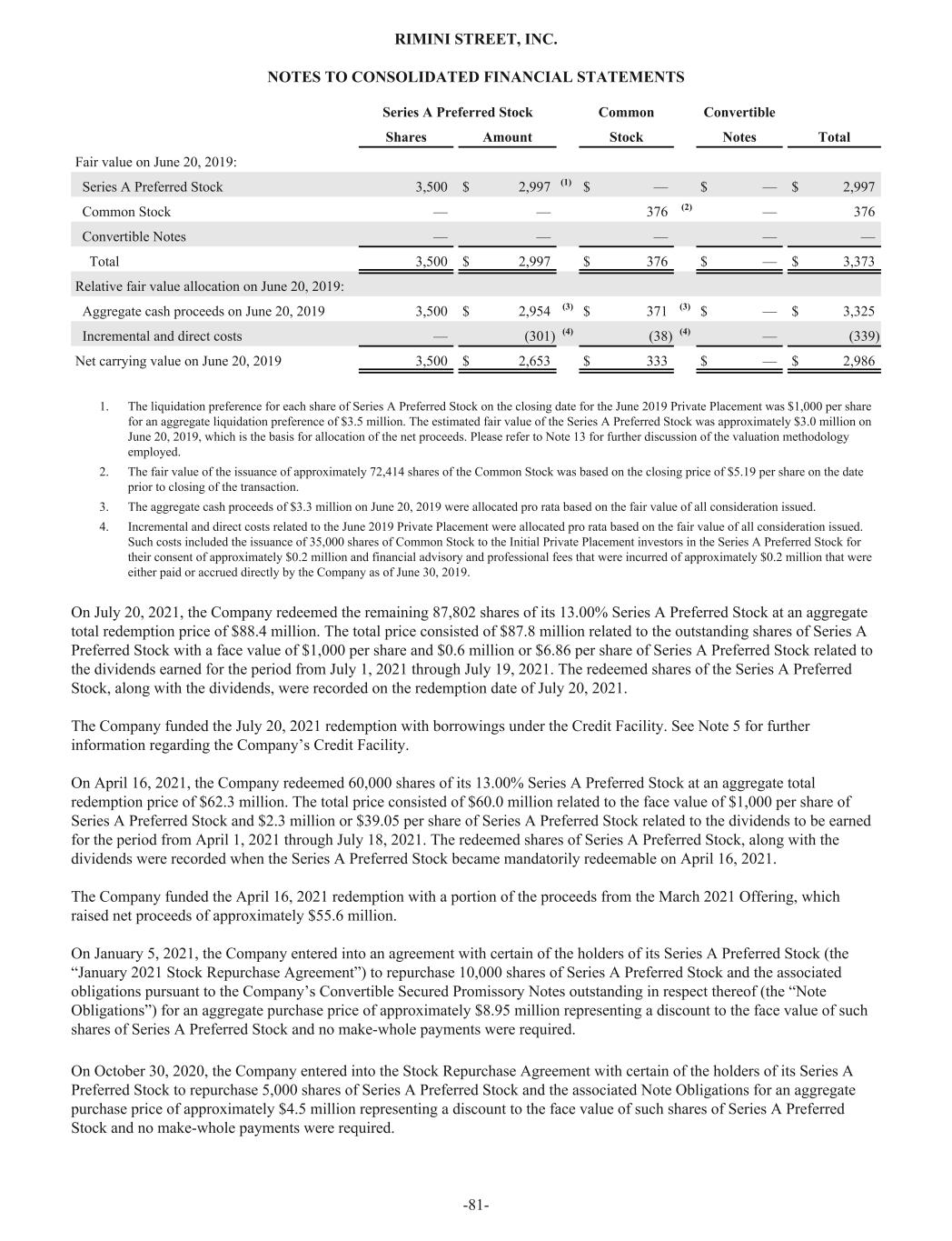 Series A Preferred Stock Common Convertible Shares Amount Stock Notes Total Fair value on June 20, 2019: Series A Preferred Stock 3,500 $ 2,997 (1) $ — $ — $ 2,997 Common Stock — — 376 (2) — 376 Convertible Notes — — — — — Total 3,500 $ 2,997 $ 376 $ — $ 3,373 Relative fair value allocation on June 20, 2019: Aggregate cash proceeds on June 20, 2019 3,500 $ 2,954 (3) $ 371 (3) $ — $ 3,325 Incremental and direct costs — (301) (4) (38) (4) — (339) Net carrying value on June 20, 2019 3,500 $ 2,653 $ 333 $ — $ 2,986 1. The liquidation preference for each share of Series A Preferred Stock on the closing date for the June 2019 Private Placement was $1,000 per share for an aggregate liquidation preference of $3.5 million. The estimated fair value of the Series A Preferred Stock was approximately $3.0 million on June 20, 2019, which is the basis for allocation of the net proceeds. Please refer to Note 13 for further discussion of the valuation methodology employed. 2. The fair value of the issuance of approximately 72,414 shares of the Common Stock was based on the closing price of $5.19 per share on the date prior to closing of the transaction. 3. The aggregate cash proceeds of $3.3 million on June 20, 2019 were allocated pro rata based on the fair value of all consideration issued. 4. Incremental and direct costs related to the June 2019 Private Placement were allocated pro rata based on the fair value of all consideration issued. Such costs included the issuance of 35,000 shares of Common Stock to the Initial Private Placement investors in the Series A Preferred Stock for their consent of approximately $0.2 million and financial advisory and professional fees that were incurred of approximately $0.2 million that were either paid or accrued directly by the Company as of June 30, 2019. On July 20, 2021, the Company redeemed the remaining 87,802 shares of its 13.00% Series A Preferred Stock at an aggregate total redemption price of $88.4 million. The total price consisted of $87.8 million related to the outstanding shares of Series A Preferred Stock with a face value of $1,000 per share and $0.6 million or $6.86 per share of Series A Preferred Stock related to the dividends earned for the period from July 1, 2021 through July 19, 2021. The redeemed shares of the Series A Preferred Stock, along with the dividends, were recorded on the redemption date of July 20, 2021. The Company funded the July 20, 2021 redemption with borrowings under the Credit Facility. See Note 5 for further information regarding the Company’s Credit Facility. On April 16, 2021, the Company redeemed 60,000 shares of its 13.00% Series A Preferred Stock at an aggregate total redemption price of $62.3 million. The total price consisted of $60.0 million related to the face value of $1,000 per share of Series A Preferred Stock and $2.3 million or $39.05 per share of Series A Preferred Stock related to the dividends to be earned for the period from April 1, 2021 through July 18, 2021. The redeemed shares of Series A Preferred Stock, along with the dividends were recorded when the Series A Preferred Stock became mandatorily redeemable on April 16, 2021. The Company funded the April 16, 2021 redemption with a portion of the proceeds from the March 2021 Offering, which raised net proceeds of approximately $55.6 million. On January 5, 2021, the Company entered into an agreement with certain of the holders of its Series A Preferred Stock (the “January 2021 Stock Repurchase Agreement”) to repurchase 10,000 shares of Series A Preferred Stock and the associated obligations pursuant to the Company’s Convertible Secured Promissory Notes outstanding in respect thereof (the “Note Obligations”) for an aggregate purchase price of approximately $8.95 million representing a discount to the face value of such shares of Series A Preferred Stock and no make-whole payments were required. On October 30, 2020, the Company entered into the Stock Repurchase Agreement with certain of the holders of its Series A Preferred Stock to repurchase 5,000 shares of Series A Preferred Stock and the associated Note Obligations for an aggregate purchase price of approximately $4.5 million representing a discount to the face value of such shares of Series A Preferred Stock and no make-whole payments were required. RIMINI STREET, INC. NOTES TO CONSOLIDATED FINANCIAL STATEMENTS -81-