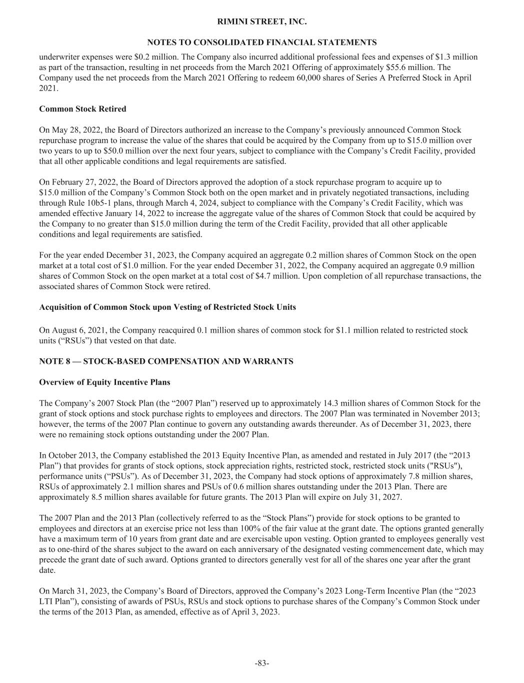 underwriter expenses were $0.2 million. The Company also incurred additional professional fees and expenses of $1.3 million as part of the transaction, resulting in net proceeds from the March 2021 Offering of approximately $55.6 million. The Company used the net proceeds from the March 2021 Offering to redeem 60,000 shares of Series A Preferred Stock in April 2021. Common Stock Retired On May 28, 2022, the Board of Directors authorized an increase to the Company’s previously announced Common Stock repurchase program to increase the value of the shares that could be acquired by the Company from up to $15.0 million over two years to up to $50.0 million over the next four years, subject to compliance with the Company’s Credit Facility, provided that all other applicable conditions and legal requirements are satisfied. On February 27, 2022, the Board of Directors approved the adoption of a stock repurchase program to acquire up to $15.0 million of the Company’s Common Stock both on the open market and in privately negotiated transactions, including through Rule 10b5-1 plans, through March 4, 2024, subject to compliance with the Company’s Credit Facility, which was amended effective January 14, 2022 to increase the aggregate value of the shares of Common Stock that could be acquired by the Company to no greater than $15.0 million during the term of the Credit Facility, provided that all other applicable conditions and legal requirements are satisfied. For the year ended December 31, 2023, the Company acquired an aggregate 0.2 million shares of Common Stock on the open market at a total cost of $1.0 million. For the year ended December 31, 2022, the Company acquired an aggregate 0.9 million shares of Common Stock on the open market at a total cost of $4.7 million. Upon completion of all repurchase transactions, the associated shares of Common Stock were retired. Acquisition of Common Stock upon Vesting of Restricted Stock Units On August 6, 2021, the Company reacquired 0.1 million shares of common stock for $1.1 million related to restricted stock units (“RSUs”) that vested on that date. NOTE 8 — STOCK-BASED COMPENSATION AND WARRANTS Overview of Equity Incentive Plans The Company’s 2007 Stock Plan (the “2007 Plan”) reserved up to approximately 14.3 million shares of Common Stock for the grant of stock options and stock purchase rights to employees and directors. The 2007 Plan was terminated in November 2013; however, the terms of the 2007 Plan continue to govern any outstanding awards thereunder. As of December 31, 2023, there were no remaining stock options outstanding under the 2007 Plan. In October 2013, the Company established the 2013 Equity Incentive Plan, as amended and restated in July 2017 (the “2013 Plan”) that provides for grants of stock options, stock appreciation rights, restricted stock, restricted stock units ("RSUs"), performance units (“PSUs”). As of December 31, 2023, the Company had stock options of approximately 7.8 million shares, RSUs of approximately 2.1 million shares and PSUs of 0.6 million shares outstanding under the 2013 Plan. There are approximately 8.5 million shares available for future grants. The 2013 Plan will expire on July 31, 2027. The 2007 Plan and the 2013 Plan (collectively referred to as the “Stock Plans”) provide for stock options to be granted to employees and directors at an exercise price not less than 100% of the fair value at the grant date. The options granted generally have a maximum term of 10 years from grant date and are exercisable upon vesting. Option granted to employees generally vest as to one-third of the shares subject to the award on each anniversary of the designated vesting commencement date, which may precede the grant date of such award. Options granted to directors generally vest for all of the shares one year after the grant date. On March 31, 2023, the Company’s Board of Directors, approved the Company’s 2023 Long-Term Incentive Plan (the “2023 LTI Plan”), consisting of awards of PSUs, RSUs and stock options to purchase shares of the Company’s Common Stock under the terms of the 2013 Plan, as amended, effective as of April 3, 2023. RIMINI STREET, INC. NOTES TO CONSOLIDATED FINANCIAL STATEMENTS -83-