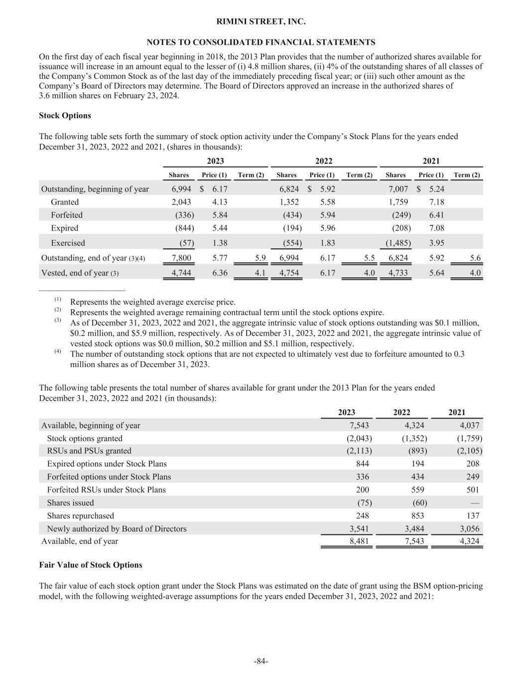 On the first day of each fiscal year beginning in 2018, the 2013 Plan provides that the number of authorized shares available for issuance will increase in an amount equal to the lesser of (i) 4.8 million shares, (ii) 4% of the outstanding shares of all classes of the Company’s Common Stock as of the last day of the immediately preceding fiscal year; or (iii) such other amount as the Company’s Board of Directors may determine. The Board of Directors approved an increase in the authorized shares of 3.6 million shares on February 23, 2024. Stock Options The following table sets forth the summary of stock option activity under the Company’s Stock Plans for the years ended December 31, 2023, 2022 and 2021, (shares in thousands): 2023 2022 2021 Shares Price (1) Term (2) Shares Price (1) Term (2) Shares Price (1) Term (2) Outstanding, beginning of year 6,994 $ 6.17 6,824 $ 5.92 7,007 $ 5.24 Granted 2,043 4.13 1,352 5.58 1,759 7.18 Forfeited (336) 5.84 (434) 5.94 (249) 6.41 Expired (844) 5.44 (194) 5.96 (208) 7.08 Exercised (57) 1.38 (554) 1.83 (1,485) 3.95 Outstanding, end of year (3)(4) 7,800 5.77 5.9 6,994 6.17 5.5 6,824 5.92 5.6 Vested, end of year (3) 4,744 6.36 4.1 4,754 6.17 4.0 4,733 5.64 4.0 ____________________ (1) Represents the weighted average exercise price. (2) Represents the weighted average remaining contractual term until the stock options expire. (3) As of December 31, 2023, 2022 and 2021, the aggregate intrinsic value of stock options outstanding was $0.1 million, $0.2 million, and $5.9 million, respectively. As of December 31, 2023, 2022 and 2021, the aggregate intrinsic value of vested stock options was $0.0 million, $0.2 million and $5.1 million, respectively. (4) The number of outstanding stock options that are not expected to ultimately vest due to forfeiture amounted to 0.3 million shares as of December 31, 2023. The following table presents the total number of shares available for grant under the 2013 Plan for the years ended December 31, 2023, 2022 and 2021 (in thousands): 2023 2022 2021 Available, beginning of year 7,543 4,324 4,037 Stock options granted (2,043) (1,352) (1,759) RSUs and PSUs granted (2,113) (893) (2,105) Expired options under Stock Plans 844 194 208 Forfeited options under Stock Plans 336 434 249 Forfeited RSUs under Stock Plans 200 559 501 Shares issued (75) (60) — Shares repurchased 248 853 137 Newly authorized by Board of Directors 3,541 3,484 3,056 Available, end of year 8,481 7,543 4,324 Fair Value of Stock Options The fair value of each stock option grant under the Stock Plans was estimated on the date of grant using the BSM option-pricing model, with the following weighted-average assumptions for the years ended December 31, 2023, 2022 and 2021: RIMINI STREET, INC. NOTES TO CONSOLIDATED FINANCIAL STATEMENTS -84-