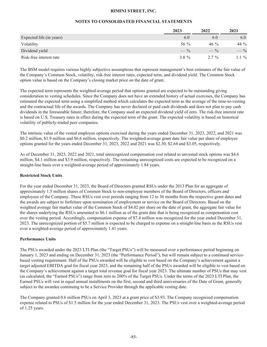 2023 2022 2021 Expected life (in years) 6.0 6.0 6.0 Volatility 56 % 46 % 44 % Dividend yield — % — % — % Risk-free interest rate 3.8 % 2.7 % 1.1 % The BSM model requires various highly subjective assumptions that represent management’s best estimates of the fair value of the Company’s Common Stock, volatility, risk-free interest rates, expected term, and dividend yield. The Common Stock option value is based on the Company’s closing market price on the date of grant. The expected term represents the weighted-average period that options granted are expected to be outstanding giving consideration to vesting schedules. Since the Company does not have an extended history of actual exercises, the Company has estimated the expected term using a simplified method which calculates the expected term as the average of the time-to-vesting and the contractual life of the awards. The Company has never declared or paid cash dividends and does not plan to pay cash dividends in the foreseeable future; therefore, the Company used an expected dividend yield of zero. The risk-free interest rate is based on U.S. Treasury rates in effect during the expected term of the grant. The expected volatility is based on historical volatility of publicly-traded peer companies. The intrinsic value of the vested employee options exercised during the years ended December 31, 2023, 2022, and 2021 was $0.2 million, $1.9 million and $6.6 million, respectively. The weighted-average grant date fair value per share of employee options granted for the years ended December 31, 2023, 2022 and 2021 was $2.30, $2.64 and $3.05, respectively. As of December 31, 2023, 2022 and 2021, total unrecognized compensation cost related to unvested stock options was $4.6 million, $4.1 million and $3.9 million, respectively. The remaining unrecognized costs are expected to be recognized on a straight-line basis over a weighted-average period of approximately 1.84 years. Restricted Stock Units For the year ended December 31, 2023, the Board of Directors granted RSUs under the 2013 Plan for an aggregate of approximately 1.5 million shares of Common Stock to non-employee members of the Board of Directors, officers and employees of the Company. These RSUs vest over periods ranging from 12 to 36 months from the respective grant dates and the awards are subject to forfeiture upon termination of employment or service on the Board of Directors. Based on the weighted average fair market value of the Common Stock of $4.02 per share on the date of grant, the aggregate fair value for the shares underlying the RSUs amounted to $6.1 million as of the grant date that is being recognized as compensation cost over the vesting period. Accordingly, compensation expense of $7.4 million was recognized for the year ended December 31, 2023. The unrecognized portion of $5.7 million is expected to be charged to expense on a straight-line basis as the RSUs vest over a weighted-average period of approximately 1.41 years. Performance Units The PSUs awarded under the 2023 LTI Plan (the “Target PSUs”) will be measured over a performance period beginning on January 1, 2023 and ending on December 31, 2023 (the “Performance Period”), but will remain subject to a continued service- based vesting requirement. Half of the PSUs awarded will be eligible to vest based on the Company’s achievement against a target adjusted EBITDA goal for fiscal year 2023, and the remaining half of the PSUs awarded will be eligible to vest based on the Company’s achievement against a target total revenue goal for fiscal year 2023. The ultimate number of PSUs that may vest (as calculated, the “Earned PSUs”) range from zero to 200% of the Target PSUs. Under the terms of the 2023 LTI Plan, the Earned PSUs will vest in equal annual installments on the first, second and third anniversaries of the Date of Grant, generally subject to the awardee continuing to be a Service Provider through the applicable vesting date. The Company granted 0.6 million PSUs on April 3, 2023 at a grant price of $3.93. The Company recognized compensation expense related to PSUs of $1.5 million for the year ended December 31, 2023. The PSUs vest over a weighted-average period of 1.25 years. RIMINI STREET, INC. NOTES TO CONSOLIDATED FINANCIAL STATEMENTS -85-
