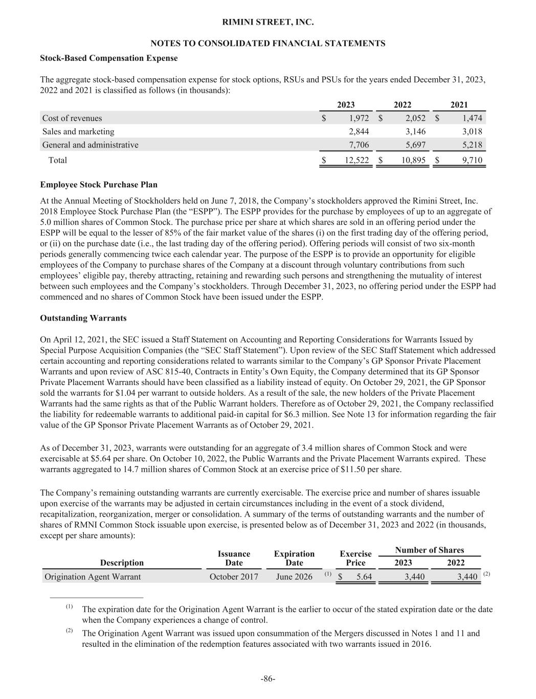 Stock-Based Compensation Expense The aggregate stock-based compensation expense for stock options, RSUs and PSUs for the years ended December 31, 2023, 2022 and 2021 is classified as follows (in thousands): 2023 2022 2021 Cost of revenues $ 1,972 $ 2,052 $ 1,474 Sales and marketing 2,844 3,146 3,018 General and administrative 7,706 5,697 5,218 Total $ 12,522 $ 10,895 $ 9,710 Employee Stock Purchase Plan At the Annual Meeting of Stockholders held on June 7, 2018, the Company’s stockholders approved the Rimini Street, Inc. 2018 Employee Stock Purchase Plan (the “ESPP”). The ESPP provides for the purchase by employees of up to an aggregate of 5.0 million shares of Common Stock. The purchase price per share at which shares are sold in an offering period under the ESPP will be equal to the lesser of 85% of the fair market value of the shares (i) on the first trading day of the offering period, or (ii) on the purchase date (i.e., the last trading day of the offering period). Offering periods will consist of two six-month periods generally commencing twice each calendar year. The purpose of the ESPP is to provide an opportunity for eligible employees of the Company to purchase shares of the Company at a discount through voluntary contributions from such employees’ eligible pay, thereby attracting, retaining and rewarding such persons and strengthening the mutuality of interest between such employees and the Company’s stockholders. Through December 31, 2023, no offering period under the ESPP had commenced and no shares of Common Stock have been issued under the ESPP. Outstanding Warrants On April 12, 2021, the SEC issued a Staff Statement on Accounting and Reporting Considerations for Warrants Issued by Special Purpose Acquisition Companies (the “SEC Staff Statement”). Upon review of the SEC Staff Statement which addressed certain accounting and reporting considerations related to warrants similar to the Company’s GP Sponsor Private Placement Warrants and upon review of ASC 815-40, Contracts in Entity’s Own Equity, the Company determined that its GP Sponsor Private Placement Warrants should have been classified as a liability instead of equity. On October 29, 2021, the GP Sponsor sold the warrants for $1.04 per warrant to outside holders. As a result of the sale, the new holders of the Private Placement Warrants had the same rights as that of the Public Warrant holders. Therefore as of October 29, 2021, the Company reclassified the liability for redeemable warrants to additional paid-in capital for $6.3 million. See Note 13 for information regarding the fair value of the GP Sponsor Private Placement Warrants as of October 29, 2021. As of December 31, 2023, warrants were outstanding for an aggregate of 3.4 million shares of Common Stock and were exercisable at $5.64 per share. On October 10, 2022, the Public Warrants and the Private Placement Warrants expired. These warrants aggregated to 14.7 million shares of Common Stock at an exercise price of $11.50 per share. The Company’s remaining outstanding warrants are currently exercisable. The exercise price and number of shares issuable upon exercise of the warrants may be adjusted in certain circumstances including in the event of a stock dividend, recapitalization, reorganization, merger or consolidation. A summary of the terms of outstanding warrants and the number of shares of RMNI Common Stock issuable upon exercise, is presented below as of December 31, 2023 and 2022 (in thousands, except per share amounts): Issuance Date Expiration Date Exercise Price Number of Shares Description 2023 2022 Origination Agent Warrant October 2017 June 2026 (1) $ 5.64 3,440 3,440 (2) _____________________ (1) The expiration date for the Origination Agent Warrant is the earlier to occur of the stated expiration date or the date when the Company experiences a change of control. (2) The Origination Agent Warrant was issued upon consummation of the Mergers discussed in Notes 1 and 11 and resulted in the elimination of the redemption features associated with two warrants issued in 2016. RIMINI STREET, INC. NOTES TO CONSOLIDATED FINANCIAL STATEMENTS -86-
