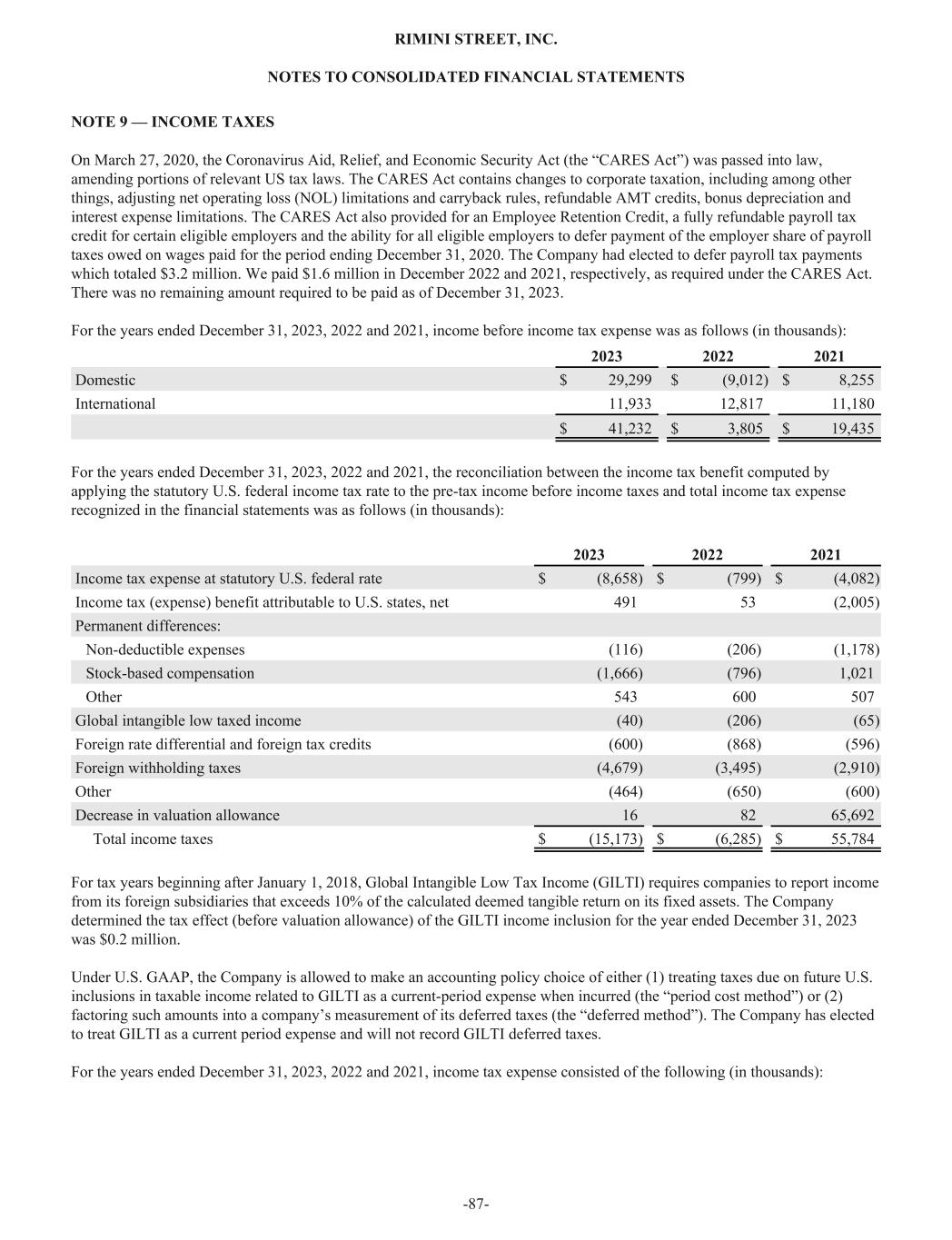 NOTE 9 — INCOME TAXES On March 27, 2020, the Coronavirus Aid, Relief, and Economic Security Act (the “CARES Act”) was passed into law, amending portions of relevant US tax laws. The CARES Act contains changes to corporate taxation, including among other things, adjusting net operating loss (NOL) limitations and carryback rules, refundable AMT credits, bonus depreciation and interest expense limitations. The CARES Act also provided for an Employee Retention Credit, a fully refundable payroll tax credit for certain eligible employers and the ability for all eligible employers to defer payment of the employer share of payroll taxes owed on wages paid for the period ending December 31, 2020. The Company had elected to defer payroll tax payments which totaled $3.2 million. We paid $1.6 million in December 2022 and 2021, respectively, as required under the CARES Act. There was no remaining amount required to be paid as of December 31, 2023. For the years ended December 31, 2023, 2022 and 2021, income before income tax expense was as follows (in thousands): 2023 2022 2021 Domestic $ 29,299 $ (9,012) $ 8,255 International 11,933 12,817 11,180 $ 41,232 $ 3,805 $ 19,435 For the years ended December 31, 2023, 2022 and 2021, the reconciliation between the income tax benefit computed by applying the statutory U.S. federal income tax rate to the pre-tax income before income taxes and total income tax expense recognized in the financial statements was as follows (in thousands): 2023 2022 2021 Income tax expense at statutory U.S. federal rate $ (8,658) $ (799) $ (4,082) Income tax (expense) benefit attributable to U.S. states, net 491 53 (2,005) Permanent differences: Non-deductible expenses (116) (206) (1,178) Stock-based compensation (1,666) (796) 1,021 Other 543 600 507 Global intangible low taxed income (40) (206) (65) Foreign rate differential and foreign tax credits (600) (868) (596) Foreign withholding taxes (4,679) (3,495) (2,910) Other (464) (650) (600) Decrease in valuation allowance 16 82 65,692 Total income taxes $ (15,173) $ (6,285) $ 55,784 For tax years beginning after January 1, 2018, Global Intangible Low Tax Income (GILTI) requires companies to report income from its foreign subsidiaries that exceeds 10% of the calculated deemed tangible return on its fixed assets. The Company determined the tax effect (before valuation allowance) of the GILTI income inclusion for the year ended December 31, 2023 was $0.2 million. Under U.S. GAAP, the Company is allowed to make an accounting policy choice of either (1) treating taxes due on future U.S. inclusions in taxable income related to GILTI as a current-period expense when incurred (the “period cost method”) or (2) factoring such amounts into a company’s measurement of its deferred taxes (the “deferred method”). The Company has elected to treat GILTI as a current period expense and will not record GILTI deferred taxes. For the years ended December 31, 2023, 2022 and 2021, income tax expense consisted of the following (in thousands): RIMINI STREET, INC. NOTES TO CONSOLIDATED FINANCIAL STATEMENTS -87-