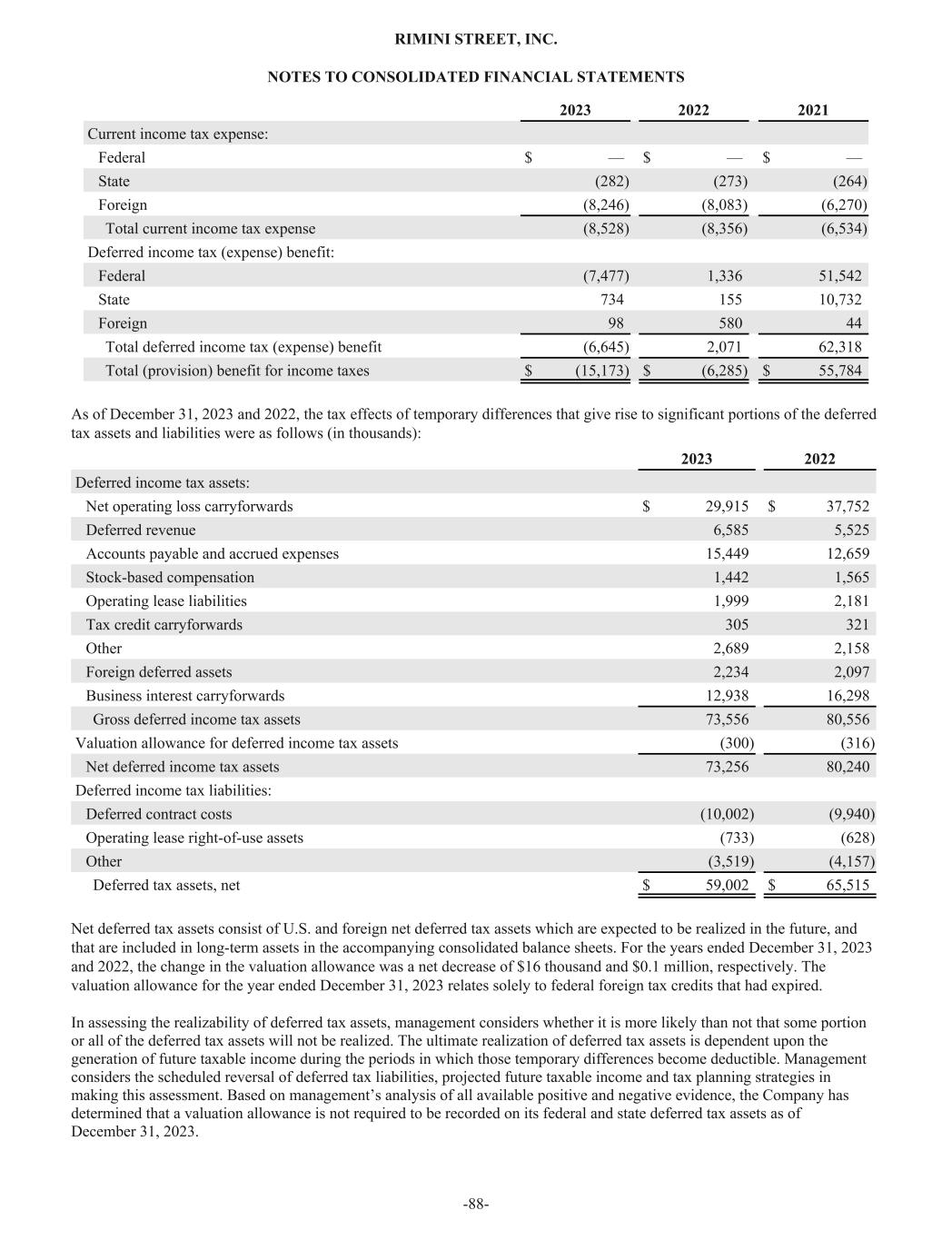 2023 2022 2021 Current income tax expense: Federal $ — $ — $ — State (282) (273) (264) Foreign (8,246) (8,083) (6,270) Total current income tax expense (8,528) (8,356) (6,534) Deferred income tax (expense) benefit: Federal (7,477) 1,336 51,542 State 734 155 10,732 Foreign 98 580 44 Total deferred income tax (expense) benefit (6,645) 2,071 62,318 Total (provision) benefit for income taxes $ (15,173) $ (6,285) $ 55,784 As of December 31, 2023 and 2022, the tax effects of temporary differences that give rise to significant portions of the deferred tax assets and liabilities were as follows (in thousands): 2023 2022 Deferred income tax assets: Net operating loss carryforwards $ 29,915 $ 37,752 Deferred revenue 6,585 5,525 Accounts payable and accrued expenses 15,449 12,659 Stock-based compensation 1,442 1,565 Operating lease liabilities 1,999 2,181 Tax credit carryforwards 305 321 Other 2,689 2,158 Foreign deferred assets 2,234 2,097 Business interest carryforwards 12,938 16,298 Gross deferred income tax assets 73,556 80,556 Valuation allowance for deferred income tax assets (300) (316) Net deferred income tax assets 73,256 80,240 Deferred income tax liabilities: Deferred contract costs (10,002) (9,940) Operating lease right-of-use assets (733) (628) Other (3,519) (4,157) Deferred tax assets, net $ 59,002 $ 65,515 Net deferred tax assets consist of U.S. and foreign net deferred tax assets which are expected to be realized in the future, and that are included in long-term assets in the accompanying consolidated balance sheets. For the years ended December 31, 2023 and 2022, the change in the valuation allowance was a net decrease of $16 thousand and $0.1 million, respectively. The valuation allowance for the year ended December 31, 2023 relates solely to federal foreign tax credits that had expired. In assessing the realizability of deferred tax assets, management considers whether it is more likely than not that some portion or all of the deferred tax assets will not be realized. The ultimate realization of deferred tax assets is dependent upon the generation of future taxable income during the periods in which those temporary differences become deductible. Management considers the scheduled reversal of deferred tax liabilities, projected future taxable income and tax planning strategies in making this assessment. Based on management’s analysis of all available positive and negative evidence, the Company has determined that a valuation allowance is not required to be recorded on its federal and state deferred tax assets as of December 31, 2023. RIMINI STREET, INC. NOTES TO CONSOLIDATED FINANCIAL STATEMENTS -88-
