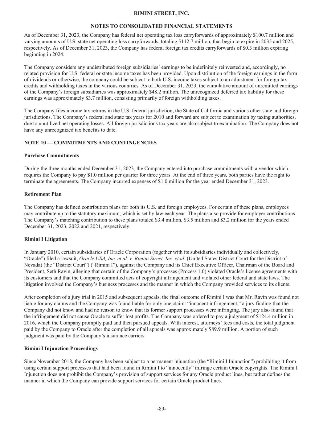 As of December 31, 2023, the Company has federal net operating tax loss carryforwards of approximately $100.7 million and varying amounts of U.S. state net operating loss carryforwards, totaling $112.7 million, that begin to expire in 2035 and 2025, respectively. As of December 31, 2023, the Company has federal foreign tax credits carryforwards of $0.3 million expiring beginning in 2024. The Company considers any undistributed foreign subsidiaries’ earnings to be indefinitely reinvested and, accordingly, no related provision for U.S. federal or state income taxes has been provided. Upon distribution of the foreign earnings in the form of dividends or otherwise, the company could be subject to both U.S. income taxes subject to an adjustment for foreign tax credits and withholding taxes in the various countries. As of December 31, 2023, the cumulative amount of unremitted earnings of the Company’s foreign subsidiaries was approximately $48.2 million. The unrecognized deferred tax liability for these earnings was approximately $3.7 million, consisting primarily of foreign withholding taxes. The Company files income tax returns in the U.S. federal jurisdiction, the State of California and various other state and foreign jurisdictions. The Company’s federal and state tax years for 2010 and forward are subject to examination by taxing authorities, due to unutilized net operating losses. All foreign jurisdictions tax years are also subject to examination. The Company does not have any unrecognized tax benefits to date. NOTE 10 — COMMITMENTS AND CONTINGENCIES Purchase Commitments During the three months ended December 31, 2023, the Company entered into purchase commitments with a vendor which requires the Company to pay $1.0 million per quarter for three years. At the end of three years, both parties have the right to terminate the agreements. The Company incurred expenses of $1.0 million for the year ended December 31, 2023. Retirement Plan The Company has defined contribution plans for both its U.S. and foreign employees. For certain of these plans, employees may contribute up to the statutory maximum, which is set by law each year. The plans also provide for employer contributions. The Company’s matching contribution to these plans totaled $3.4 million, $3.5 million and $3.2 million for the years ended December 31, 2023, 2022 and 2021, respectively. Rimini I Litigation In January 2010, certain subsidiaries of Oracle Corporation (together with its subsidiaries individually and collectively, “Oracle”) filed a lawsuit, Oracle USA, Inc. et al. v. Rimini Street, Inc. et al. (United States District Court for the District of Nevada) (the “District Court”) (“Rimini I”), against the Company and its Chief Executive Officer, Chairman of the Board and President, Seth Ravin, alleging that certain of the Company’s processes (Process 1.0) violated Oracle’s license agreements with its customers and that the Company committed acts of copyright infringement and violated other federal and state laws. The litigation involved the Company’s business processes and the manner in which the Company provided services to its clients. After completion of a jury trial in 2015 and subsequent appeals, the final outcome of Rimini I was that Mr. Ravin was found not liable for any claims and the Company was found liable for only one claim: “innocent infringement,” a jury finding that the Company did not know and had no reason to know that its former support processes were infringing. The jury also found that the infringement did not cause Oracle to suffer lost profits. The Company was ordered to pay a judgment of $124.4 million in 2016, which the Company promptly paid and then pursued appeals. With interest, attorneys’ fees and costs, the total judgment paid by the Company to Oracle after the completion of all appeals was approximately $89.9 million. A portion of such judgment was paid by the Company’s insurance carriers. Rimini I Injunction Proceedings Since November 2018, the Company has been subject to a permanent injunction (the “Rimini I Injunction”) prohibiting it from using certain support processes that had been found in Rimini I to “innocently” infringe certain Oracle copyrights. The Rimini I Injunction does not prohibit the Company’s provision of support services for any Oracle product lines, but rather defines the manner in which the Company can provide support services for certain Oracle product lines. RIMINI STREET, INC. NOTES TO CONSOLIDATED FINANCIAL STATEMENTS -89-