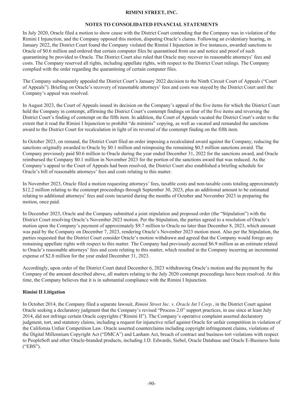 In July 2020, Oracle filed a motion to show cause with the District Court contending that the Company was in violation of the Rimini I Injunction, and the Company opposed this motion, disputing Oracle’s claims. Following an evidentiary hearing, in January 2022, the District Court found the Company violated the Rimini I Injunction in five instances, awarded sanctions to Oracle of $0.6 million and ordered that certain computer files be quarantined from use and notice and proof of such quarantining be provided to Oracle. The District Court also ruled that Oracle may recover its reasonable attorneys’ fees and costs. The Company reserved all rights, including appellate rights, with respect to the District Court rulings. The Company complied with the order regarding the quarantining of certain computer files. The Company subsequently appealed the District Court’s January 2022 decision to the Ninth Circuit Court of Appeals (“Court of Appeals”). Briefing on Oracle’s recovery of reasonable attorneys’ fees and costs was stayed by the District Court until the Company’s appeal was resolved. In August 2023, the Court of Appeals issued its decision on the Company’s appeal of the five items for which the District Court held the Company in contempt, affirming the District Court’s contempt findings on four of the five items and reversing the District Court’s finding of contempt on the fifth item. In addition, the Court of Appeals vacated the District Court’s order to the extent that it read the Rimini I Injunction to prohibit “de minimis” copying, as well as vacated and remanded the sanctions award to the District Court for recalculation in light of its reversal of the contempt finding on the fifth item. In October 2023, on remand, the District Court filed an order imposing a recalculated award against the Company, reducing the sanctions originally awarded to Oracle by $0.1 million and reimposing the remaining $0.5 million sanctions award. The Company previously paid $0.6 million to Oracle during the year ended December 31, 2022 for the sanctions award, and Oracle reimbursed the Company $0.1 million in November 2023 for the portion of the sanctions award that was reduced. As the Company’s appeal to the Court of Appeals had been resolved, the District Court also established a briefing schedule for Oracle’s bill of reasonable attorneys’ fees and costs relating to this matter. In November 2023, Oracle filed a motion requesting attorneys’ fees, taxable costs and non-taxable costs totaling approximately $12.2 million relating to the contempt proceedings through September 30, 2023, plus an additional amount to be estimated relating to additional attorneys’ fees and costs incurred during the months of October and November 2023 in preparing the motion, once paid. In December 2023, Oracle and the Company submitted a joint stipulation and proposed order (the “Stipulation”) with the District Court resolving Oracle’s November 2023 motion. Per the Stipulation, the parties agreed to a resolution of Oracle’s motion upon the Company’s payment of approximately $9.7 million to Oracle no later than December 8, 2023, which amount was paid by the Company on December 7, 2023, rendering Oracle’s November 2023 motion moot. Also per the Stipulation, the parties requested that the District Court consider Oracle’s motion withdrawn and agreed that the Company would forego any remaining appellate rights with respect to this matter. The Company had previously accrued $6.9 million as an estimate related to Oracle’s reasonable attorneys’ fees and costs relating to this matter, which resulted in the Company incurring an incremental expense of $2.8 million for the year ended December 31, 2023. Accordingly, upon order of the District Court dated December 6, 2023 withdrawing Oracle’s motion and the payment by the Company of the amount described above, all matters relating to the July 2020 contempt proceedings have been resolved. At this time, the Company believes that it is in substantial compliance with the Rimini I Injunction. Rimini II Litigation In October 2014, the Company filed a separate lawsuit, Rimini Street Inc. v. Oracle Int’l Corp., in the District Court against Oracle seeking a declaratory judgment that the Company’s revised “Process 2.0” support practices, in use since at least July 2014, did not infringe certain Oracle copyrights (“Rimini II”). The Company’s operative complaint asserted declaratory judgment, tort, and statutory claims, including a request for injunctive relief against Oracle for unfair competition in violation of the California Unfair Competition Law. Oracle asserted counterclaims including copyright infringement claims, violations of the Digital Millennium Copyright Act (“DMCA”) and Lanham Act, breach of contract and business tort violations with respect to PeopleSoft and other Oracle-branded products, including J.D. Edwards, Siebel, Oracle Database and Oracle E-Business Suite (“EBS”). RIMINI STREET, INC. NOTES TO CONSOLIDATED FINANCIAL STATEMENTS -90-
