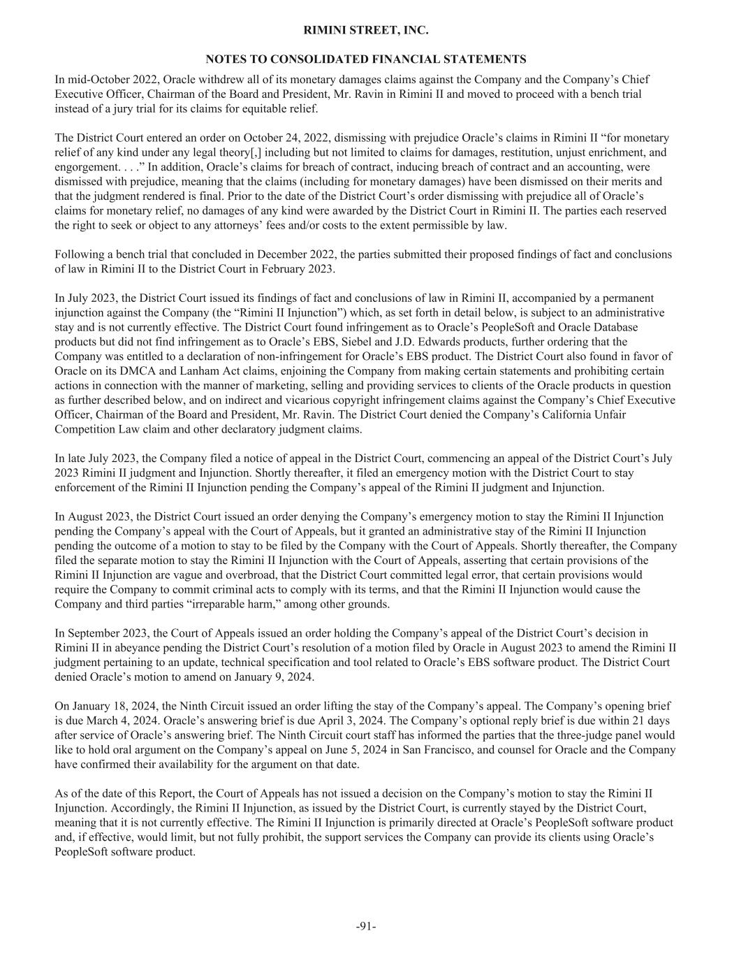 In mid-October 2022, Oracle withdrew all of its monetary damages claims against the Company and the Company’s Chief Executive Officer, Chairman of the Board and President, Mr. Ravin in Rimini II and moved to proceed with a bench trial instead of a jury trial for its claims for equitable relief. The District Court entered an order on October 24, 2022, dismissing with prejudice Oracle’s claims in Rimini II “for monetary relief of any kind under any legal theory[,] including but not limited to claims for damages, restitution, unjust enrichment, and engorgement. . . .” In addition, Oracle’s claims for breach of contract, inducing breach of contract and an accounting, were dismissed with prejudice, meaning that the claims (including for monetary damages) have been dismissed on their merits and that the judgment rendered is final. Prior to the date of the District Court’s order dismissing with prejudice all of Oracle’s claims for monetary relief, no damages of any kind were awarded by the District Court in Rimini II. The parties each reserved the right to seek or object to any attorneys’ fees and/or costs to the extent permissible by law. Following a bench trial that concluded in December 2022, the parties submitted their proposed findings of fact and conclusions of law in Rimini II to the District Court in February 2023. In July 2023, the District Court issued its findings of fact and conclusions of law in Rimini II, accompanied by a permanent injunction against the Company (the “Rimini II Injunction”) which, as set forth in detail below, is subject to an administrative stay and is not currently effective. The District Court found infringement as to Oracle’s PeopleSoft and Oracle Database products but did not find infringement as to Oracle’s EBS, Siebel and J.D. Edwards products, further ordering that the Company was entitled to a declaration of non-infringement for Oracle’s EBS product. The District Court also found in favor of Oracle on its DMCA and Lanham Act claims, enjoining the Company from making certain statements and prohibiting certain actions in connection with the manner of marketing, selling and providing services to clients of the Oracle products in question as further described below, and on indirect and vicarious copyright infringement claims against the Company’s Chief Executive Officer, Chairman of the Board and President, Mr. Ravin. The District Court denied the Company’s California Unfair Competition Law claim and other declaratory judgment claims. In late July 2023, the Company filed a notice of appeal in the District Court, commencing an appeal of the District Court’s July 2023 Rimini II judgment and Injunction. Shortly thereafter, it filed an emergency motion with the District Court to stay enforcement of the Rimini II Injunction pending the Company’s appeal of the Rimini II judgment and Injunction. In August 2023, the District Court issued an order denying the Company’s emergency motion to stay the Rimini II Injunction pending the Company’s appeal with the Court of Appeals, but it granted an administrative stay of the Rimini II Injunction pending the outcome of a motion to stay to be filed by the Company with the Court of Appeals. Shortly thereafter, the Company filed the separate motion to stay the Rimini II Injunction with the Court of Appeals, asserting that certain provisions of the Rimini II Injunction are vague and overbroad, that the District Court committed legal error, that certain provisions would require the Company to commit criminal acts to comply with its terms, and that the Rimini II Injunction would cause the Company and third parties “irreparable harm,” among other grounds. In September 2023, the Court of Appeals issued an order holding the Company’s appeal of the District Court’s decision in Rimini II in abeyance pending the District Court’s resolution of a motion filed by Oracle in August 2023 to amend the Rimini II judgment pertaining to an update, technical specification and tool related to Oracle’s EBS software product. The District Court denied Oracle’s motion to amend on January 9, 2024. On January 18, 2024, the Ninth Circuit issued an order lifting the stay of the Company’s appeal. The Company’s opening brief is due March 4, 2024. Oracle’s answering brief is due April 3, 2024. The Company’s optional reply brief is due within 21 days after service of Oracle’s answering brief. The Ninth Circuit court staff has informed the parties that the three-judge panel would like to hold oral argument on the Company’s appeal on June 5, 2024 in San Francisco, and counsel for Oracle and the Company have confirmed their availability for the argument on that date. As of the date of this Report, the Court of Appeals has not issued a decision on the Company’s motion to stay the Rimini II Injunction. Accordingly, the Rimini II Injunction, as issued by the District Court, is currently stayed by the District Court, meaning that it is not currently effective. The Rimini II Injunction is primarily directed at Oracle’s PeopleSoft software product and, if effective, would limit, but not fully prohibit, the support services the Company can provide its clients using Oracle’s PeopleSoft software product. RIMINI STREET, INC. NOTES TO CONSOLIDATED FINANCIAL STATEMENTS -91-