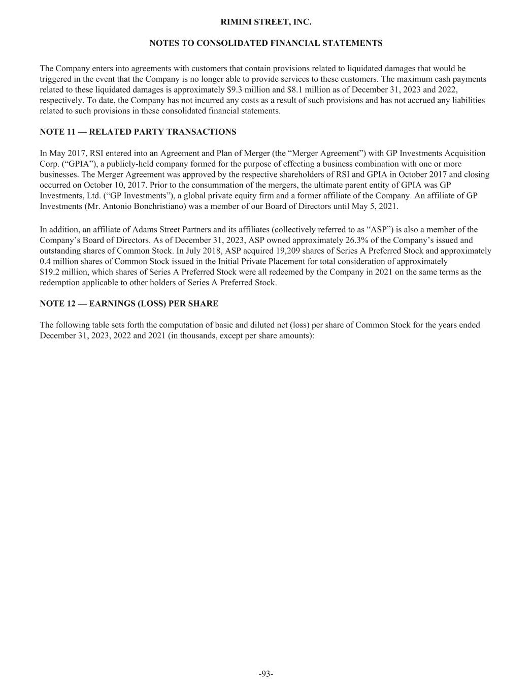 The Company enters into agreements with customers that contain provisions related to liquidated damages that would be triggered in the event that the Company is no longer able to provide services to these customers. The maximum cash payments related to these liquidated damages is approximately $9.3 million and $8.1 million as of December 31, 2023 and 2022, respectively. To date, the Company has not incurred any costs as a result of such provisions and has not accrued any liabilities related to such provisions in these consolidated financial statements. NOTE 11 — RELATED PARTY TRANSACTIONS In May 2017, RSI entered into an Agreement and Plan of Merger (the “Merger Agreement”) with GP Investments Acquisition Corp. (“GPIA”), a publicly-held company formed for the purpose of effecting a business combination with one or more businesses. The Merger Agreement was approved by the respective shareholders of RSI and GPIA in October 2017 and closing occurred on October 10, 2017. Prior to the consummation of the mergers, the ultimate parent entity of GPIA was GP Investments, Ltd. (“GP Investments”), a global private equity firm and a former affiliate of the Company. An affiliate of GP Investments (Mr. Antonio Bonchristiano) was a member of our Board of Directors until May 5, 2021. In addition, an affiliate of Adams Street Partners and its affiliates (collectively referred to as “ASP”) is also a member of the Company’s Board of Directors. As of December 31, 2023, ASP owned approximately 26.3% of the Company’s issued and outstanding shares of Common Stock. In July 2018, ASP acquired 19,209 shares of Series A Preferred Stock and approximately 0.4 million shares of Common Stock issued in the Initial Private Placement for total consideration of approximately $19.2 million, which shares of Series A Preferred Stock were all redeemed by the Company in 2021 on the same terms as the redemption applicable to other holders of Series A Preferred Stock. NOTE 12 — EARNINGS (LOSS) PER SHARE The following table sets forth the computation of basic and diluted net (loss) per share of Common Stock for the years ended December 31, 2023, 2022 and 2021 (in thousands, except per share amounts): RIMINI STREET, INC. NOTES TO CONSOLIDATED FINANCIAL STATEMENTS -93-