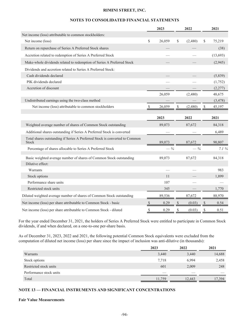 2023 2022 2021 Net income (loss) attributable to common stockholders: Net income (loss) $ 26,059 $ (2,480) $ 75,219 Return on repurchase of Series A Preferred Stock shares — — (38) Accretion related to redemption of Series A Preferred Stock — — (13,693) Make-whole dividends related to redemption of Series A Preferred Stock — — (2,945) Dividends and accretion related to Series A Preferred Stock: Cash dividends declared — — (5,839) PIK dividends declared — — (1,752) Accretion of discount — — (2,277) 26,059 (2,480) 48,675 Undistributed earnings using the two-class method — — (3,478) Net income (loss) attributable to common stockholders $ 26,059 $ (2,480) $ 45,197 2023 2022 2021 Weighted average number of shares of Common Stock outstanding 89,073 87,672 84,318 Additional shares outstanding if Series A Preferred Stock is converted — — 6,489 Total shares outstanding if Series A Preferred Stock is converted to Common Stock 89,073 87,672 90,807 Percentage of shares allocable to Series A Preferred Stock — % — % 7.1 % Basic weighted average number of shares of Common Stock outstanding 89,073 87,672 84,318 Dilutive effect: Warrants — — 983 Stock options 11 — 1,899 Performance share units 107 — — Restricted stock units 345 — 1,770 Diluted weighted average number of shares of Common Stock outstanding 89,536 87,672 88,970 Net income (loss) per share attributable to Common Stock - basic $ 0.29 $ (0.03) $ 0.54 Net income (loss) per share attributable to Common Stock - diluted $ 0.29 $ (0.03) $ 0.51 For the year ended December 31, 2021, the holders of Series A Preferred Stock were entitled to participate in Common Stock dividends, if and when declared, on a one-to-one per-share basis. As of December 31, 2023, 2022 and 2021, the following potential Common Stock equivalents were excluded from the computation of diluted net income (loss) per share since the impact of inclusion was anti-dilutive (in thousands): 2023 2022 2021 Warrants 3,440 3,440 14,688 Stock options 7,718 6,994 2,458 Restricted stock units 601 2,009 248 Performance stock units — — — Total 11,759 12,443 17,394 NOTE 13 — FINANCIAL INSTRUMENTS AND SIGNIFICANT CONCENTRATIONS Fair Value Measurements RIMINI STREET, INC. NOTES TO CONSOLIDATED FINANCIAL STATEMENTS -94-